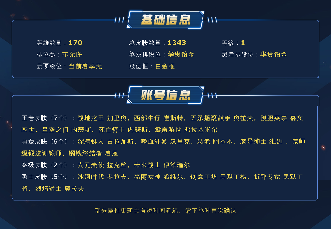 【毁号涉及毁坏虚拟财产罪及计算机安全罪】PS:本公司有专门的售后团队和法务部,如开挂、鼠标宏,第三方软件等原因造成账号封禁财产收到损害。安徽刀锋互娱配合起诉立案,必追责索赔到底。避免给自己带来不必要的麻烦,还请健康文明游戏!禁止开挂异常游戏 ⭐账号信息 ⭐店铺每天都会更新各种优质账号⭐喜欢可右上角收藏、方便下次租用。祝亲游戏愉快!!!【如遇上不了号咨询客服,客服24小时配合上号】