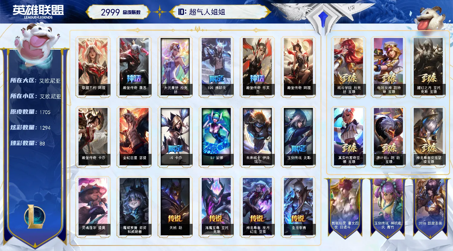 全皮肤清空商城-1700原皮上千炫彩-晴天-艾欧尼亚铂金-不朽阿狸-136神话-86臻彩畅玩!!!