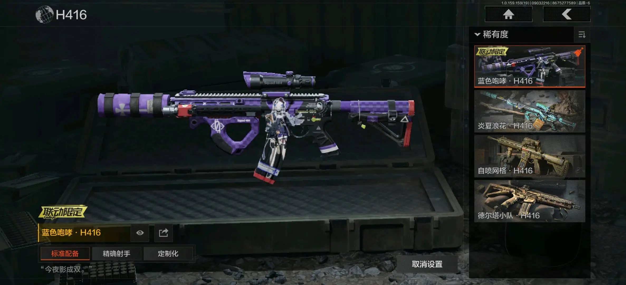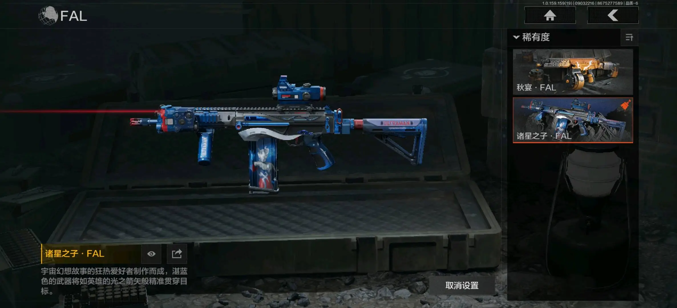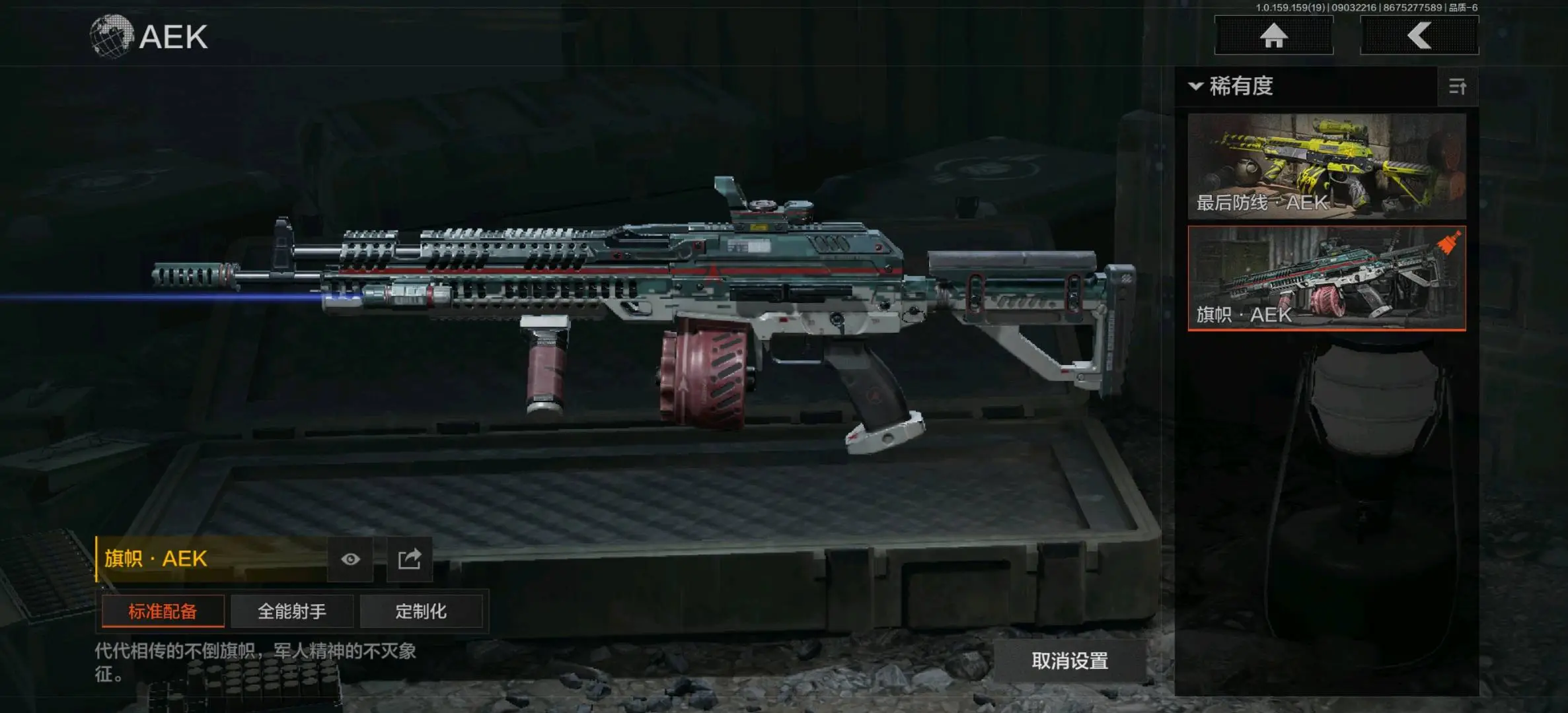突击步枪:诸星之子FAL,蓝色咆哮H416,旗帜AEK,银月AN94,钢铁真理QBZ191,棱光裂变AKM,缟兵玄墨AKM,来战AKM,竞技M4A1,炎夏浪花H416,自喷网格H416,德尔塔小队H416,北国内卫MDR,快乐游戏AK102,涂鸦AK102,火力倾泻AUG,竞技AUG,棱光裂变AK74N,来战AK74N,幽寒毒箭AK74N,山地伪装AK74N,骑士之剑AKS74U,钢铁真理F2000,炎夏浪花AR57,涂绘猎人AR57,棱光裂变ACE31,骑士之剑ACE31,湖冰倒影ACE31,最后防线AEK,北国内卫AN94,阴影AN94,缟兵玄墨T03,玄戈梨花T03;