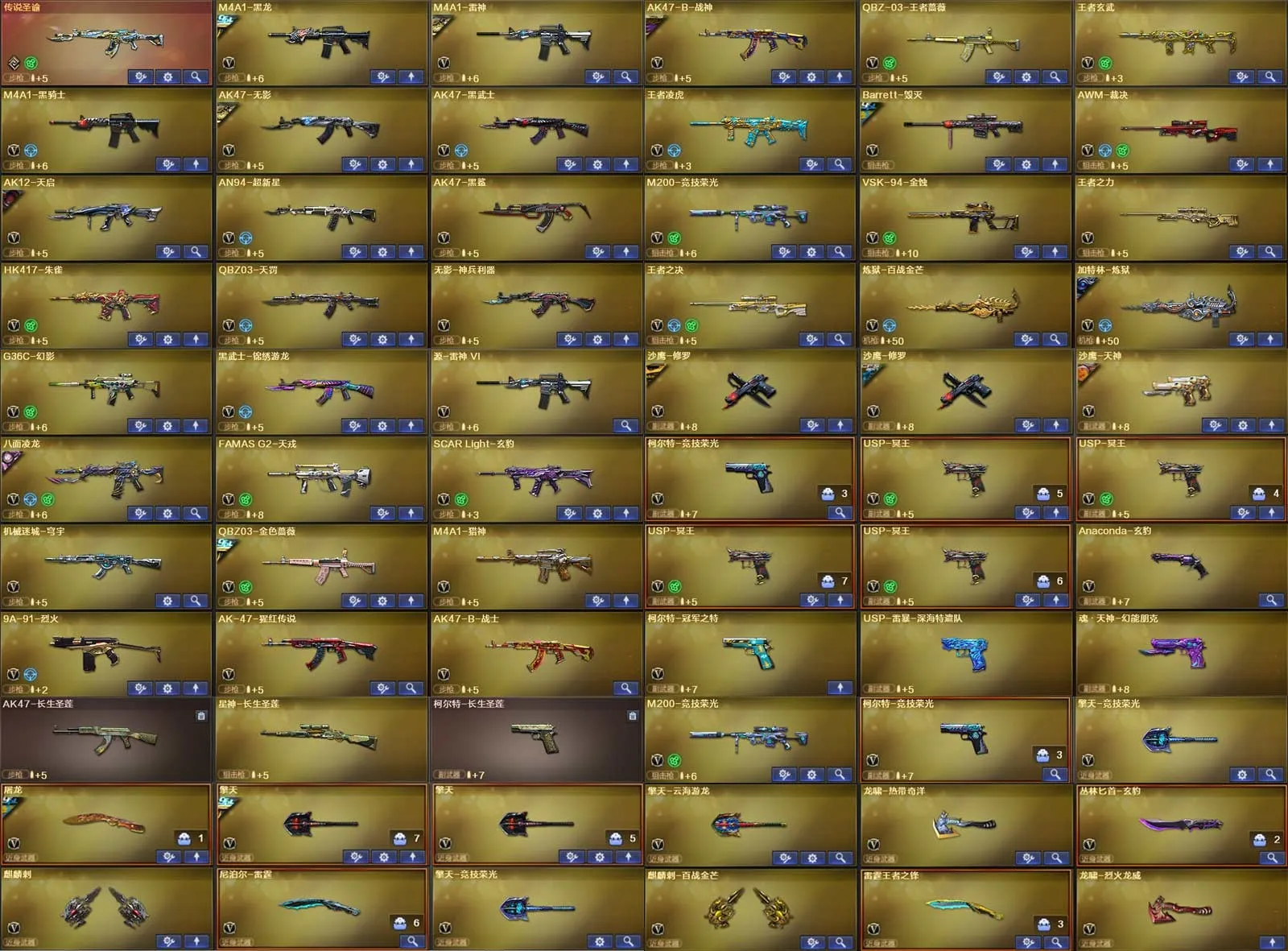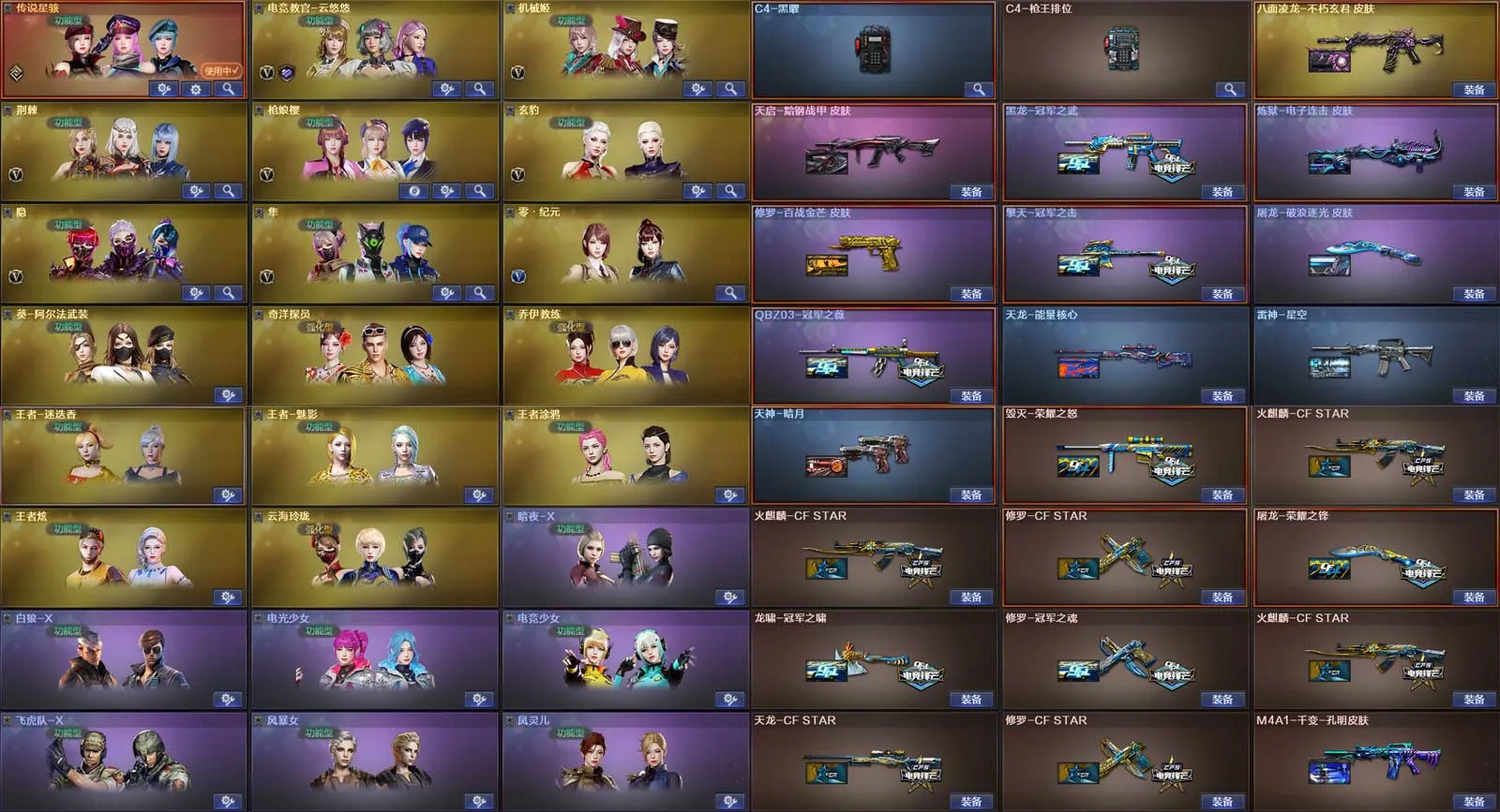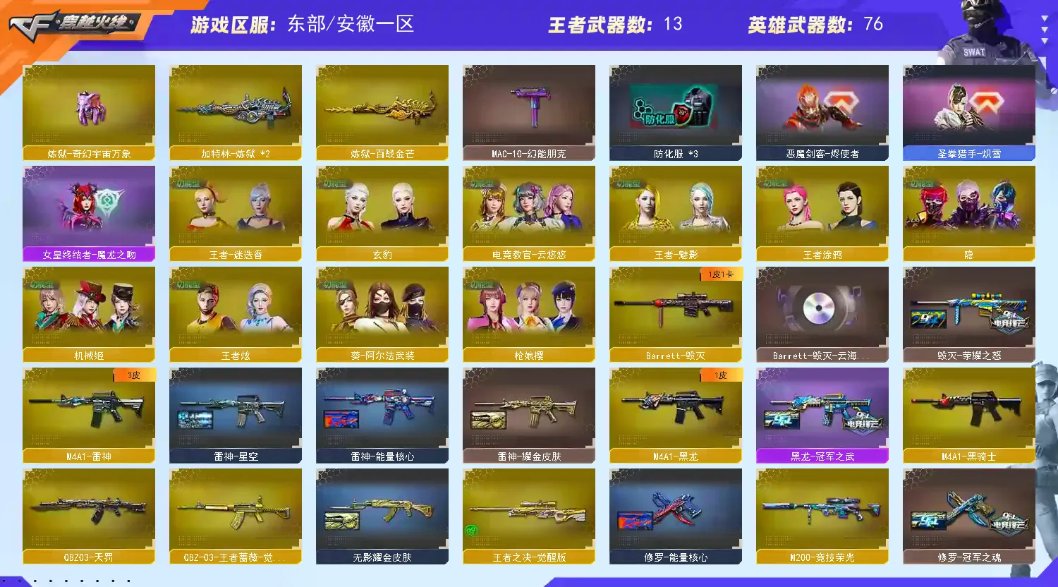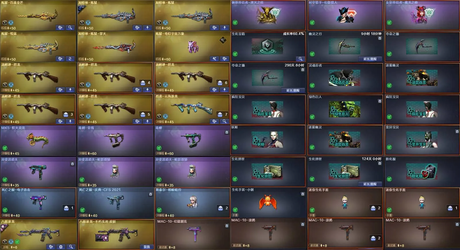 多四防角色,各种皮肤武器光效玩偶道具,欢迎来体验!武器太多,截不了那么多图!【此号全部装备太多截不了太多图,还有很多神器未截图,普通CF点武器也是一百多个就不截图了(满背包满道具爆破、生化、挑战武器应有尽有多个玩偶主流武器多光效),主流枪械都有皮肤】