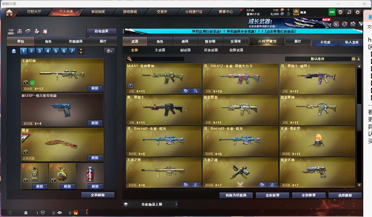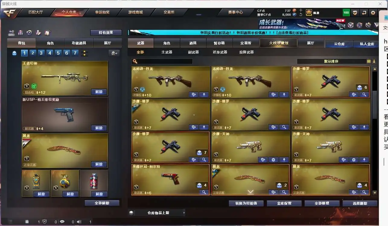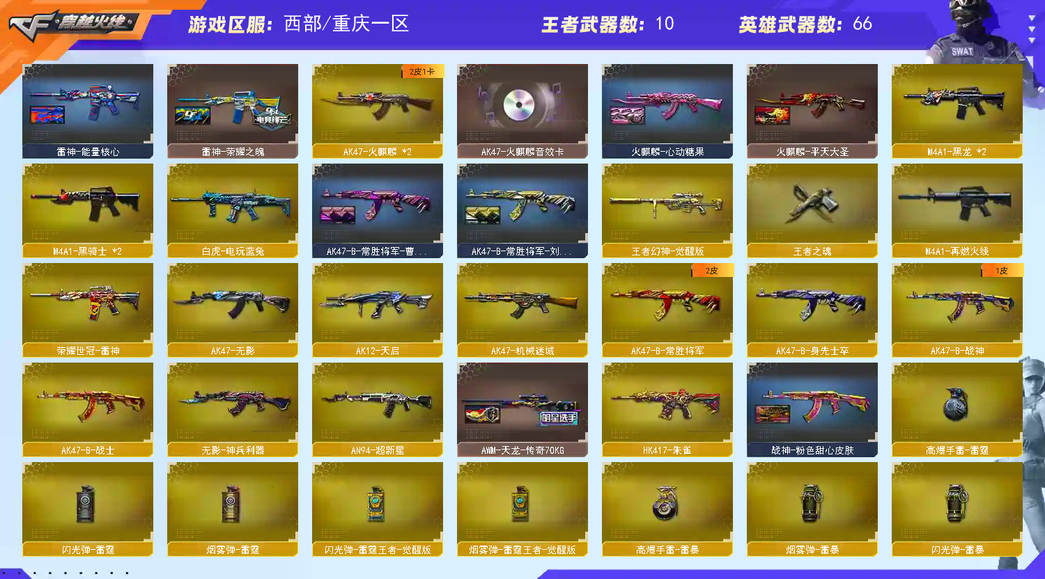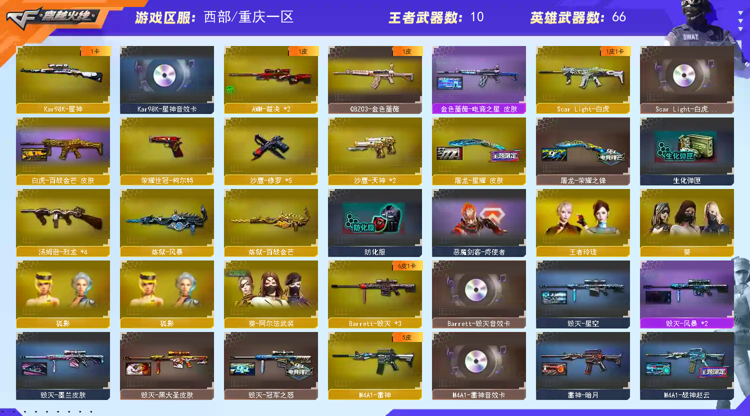 【98k星神+音效卡】【王者幻神】【幻神冠军之幻皮肤】【scar白虎+卡】【qbz金色蔷薇】【hk417朱雀】【火麒麟+卡】【黑龙】【雷神+卡+荣耀之魄】【黑骑士】【毁灭+卡+cfs2018+冠军之怒】【裁决】 【武器:王者之心 王者炎心 荣耀世冠雷神 白虎电玩蓝兔 天龙 炼狱 烈龙*4】 【7手呛:修罗*5 天神*2 荣耀世冠柯尔特 】 【9刀具:屠龙*4 龙啸 麒麟刺 尼泊尔雷霆 斩神刀雷暴 王者之锋 】 【3雷套:雷霆 雷暴 竞技荣光 】 【小人呛:天龙曼陀罗 】 【音效卡:星神音效卡 白虎音效卡 毁灭音效卡 雷神音效卡 火麒麟音效卡 】 【角色:葵 狐影 王者玲珑 】