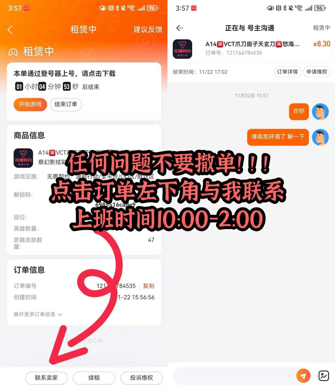 首次租号弹高危环境上班时间(早10:00—凌晨两点) 不要直接撤单!!!!!!!!!! 不要直接撤单!!!!!!!!!! 因段位不符撤单累计一次永久拉黑,因租错号撤单累计两次永久拉黑,租号后15分钟内无特殊理由撤单累计两次永久拉黑,因不看账号描述(比如禁言)撤单累计两次永久拉黑,仅被顶号一次就撤单累计一次永久拉黑,因上把租客对局未完成撤单累计一次永久拉黑 安卓和苹果全平台互通 高危环境冻结保护无法组队匹配请先不要维权撤单!请截屏订单页面并加 1.严禁使用外设、骂人、挂机、、改名等违规行为,发现永久拉黑,永不恢复,本店几百个无畏契约手游账号将永远不可租。 2.此帐号价值已达刑事立案金额,并已在南京市公安局备案虚拟财产,开挂作弊行为会严肃处理。 3.禁止使用被封机械码的设备租号,如有请恢复手机出厂设置(刷机)再租。 禁止动用点券,发现永久拉黑。 封号时长超过30天会联系警方严肃处理!封号一个月赔偿金额2000元起步,封号三个月赔偿金额7000元起步。封号十年赔偿金额20000元起步 专业起诉团队,近五年百分百胜诉。 请勿使用外挂,非官方安装包,改肤软件等非法插件启动游戏、照成账号封禁必联系平台提供资料追究法律责任!文明游戏切勿开G,切勿以身试法。通过正常充值获得皮肤的游戏账号,属于个人财产,受法律保护。《刑法》第二百七十五条规定故意毁坏公私财物,数额较大(5000元以上)或者有其他严重情节的,处三年以下有期徒刑、拘役、或者罚金;数额巨大或者有其他特别严重情节的,处三年以上七年以下有期徒刑。 如出现任何有损账号的行为导致账号封停,我们会将恶意租客的注册手机号、姓名、身份证信息和登录游戏ip地址提交给公安局进行立案,追究其刑事责任。✅