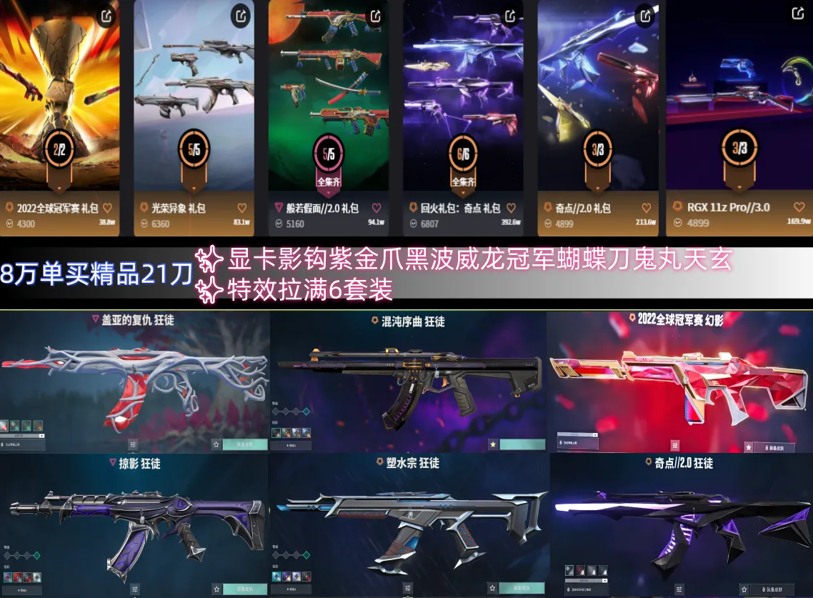 精品21刀✨显卡影钩紫金爪✨黑波威龙冠军奇点蝴蝶刀✨22冠军盖亚奇点2混沌塑水狂徒✨6套装特效拉满