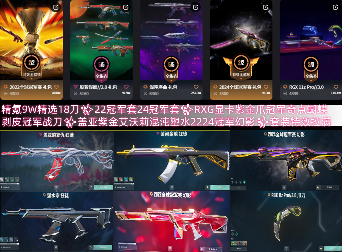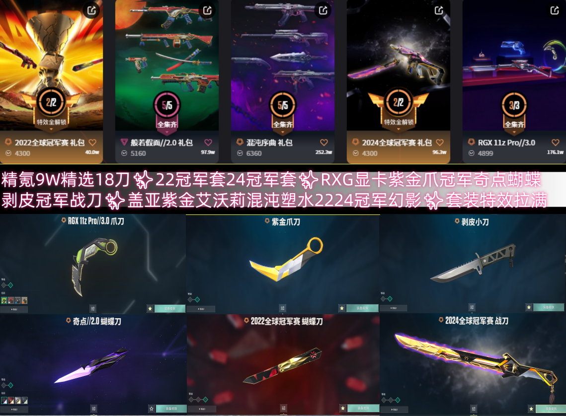 精氪9W精选18刀✨22冠军套24冠军套✨RXG显卡紫金爪冠军奇点蝴蝶剥皮冠军战刀✨盖亚紫金艾沃莉混沌塑水2224冠军幻影✨套装特效拉满