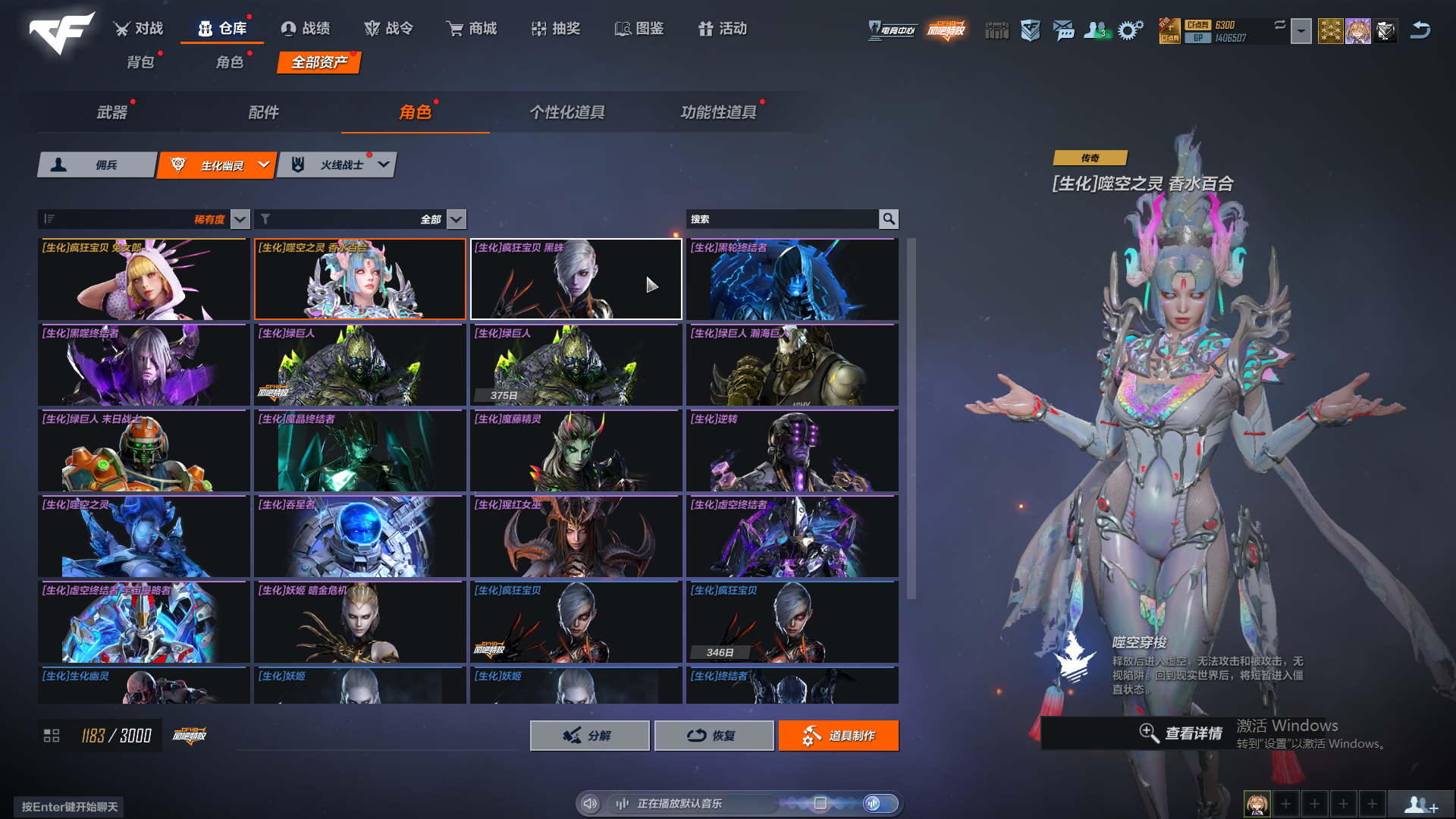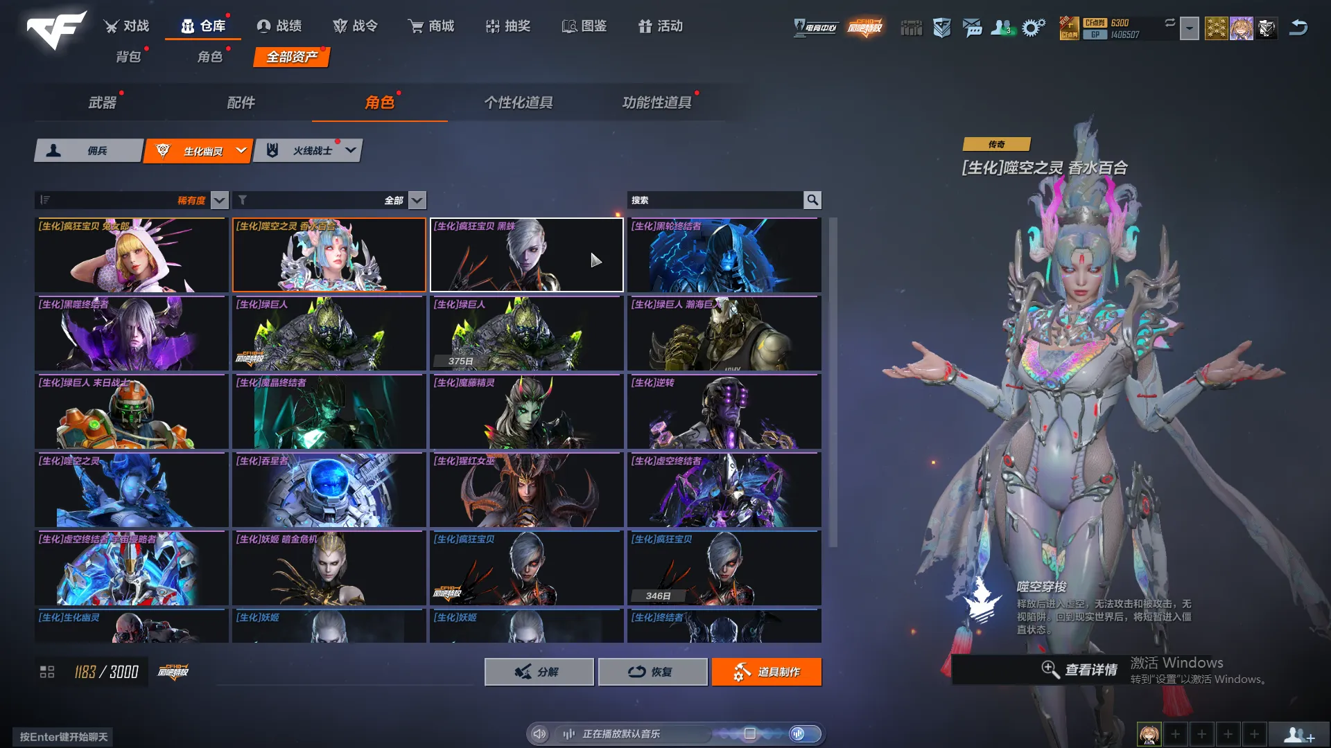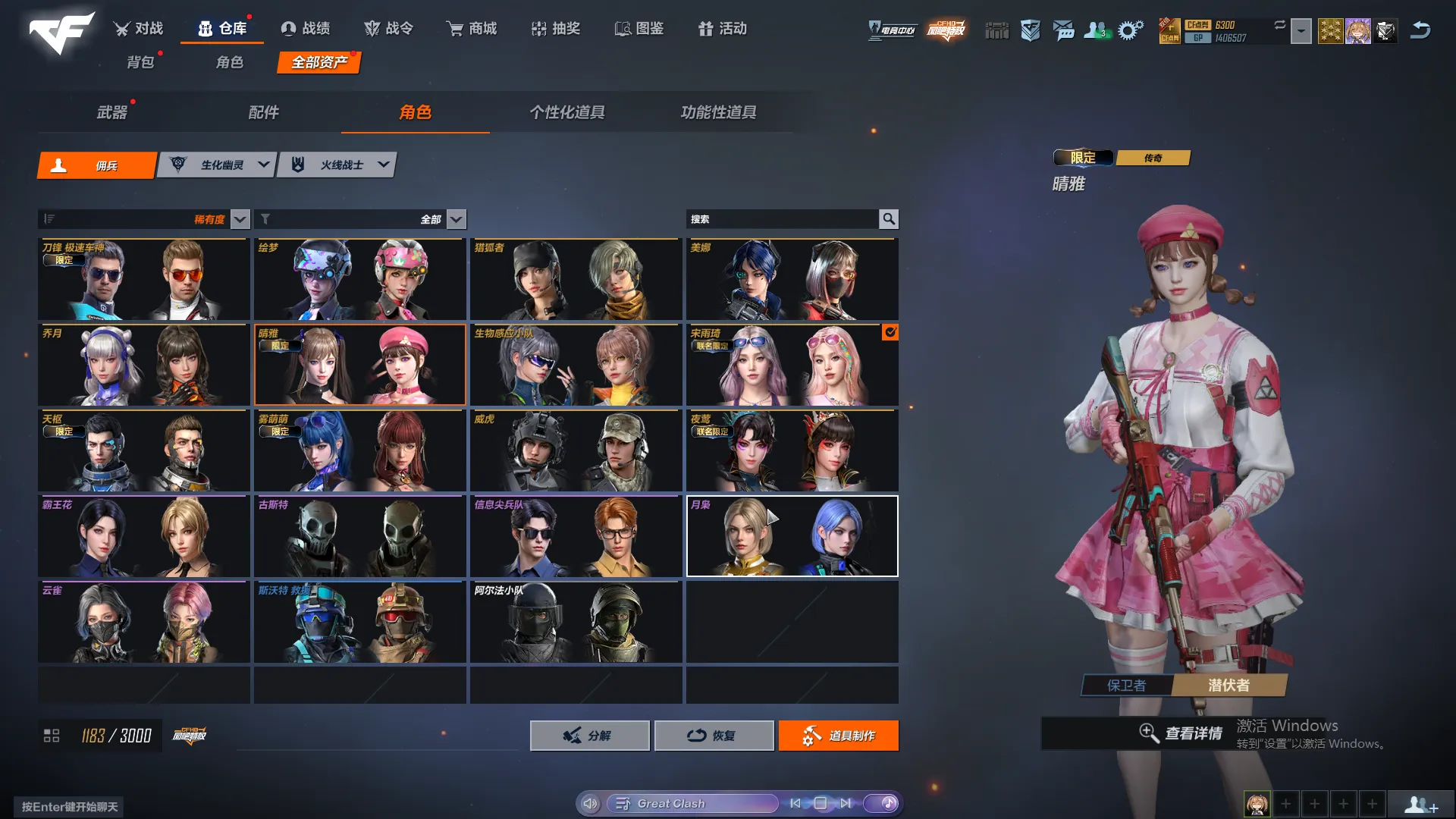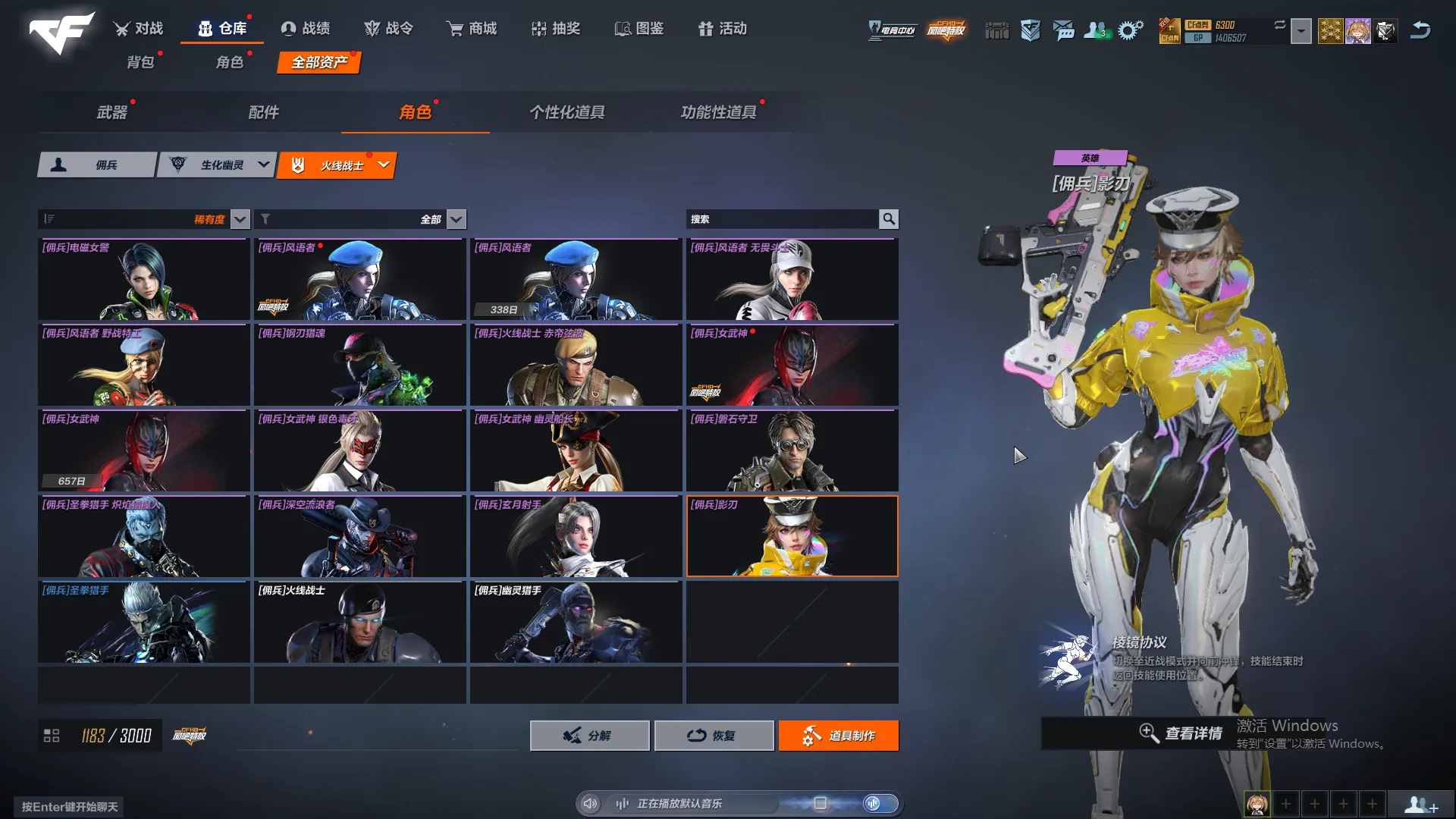 生化号,主要打怒气和追击。武器熟练度全满,主要好的人物有晴雅,雨琦弟弟,雾萌萌,夜莺。追击幽灵人物有阿飘和香水百合,逆转,魔晶,小黑子,女巫,太空人,英雄有影刃,牛仔,女警,磐石,玄月。怒气有猴子和皮肤,陀螺人,虚空,黑轮,魔腾,女鬼兔女郎都有。枪皮数量一般,枪皮有图,比不上富哥,够用就行。