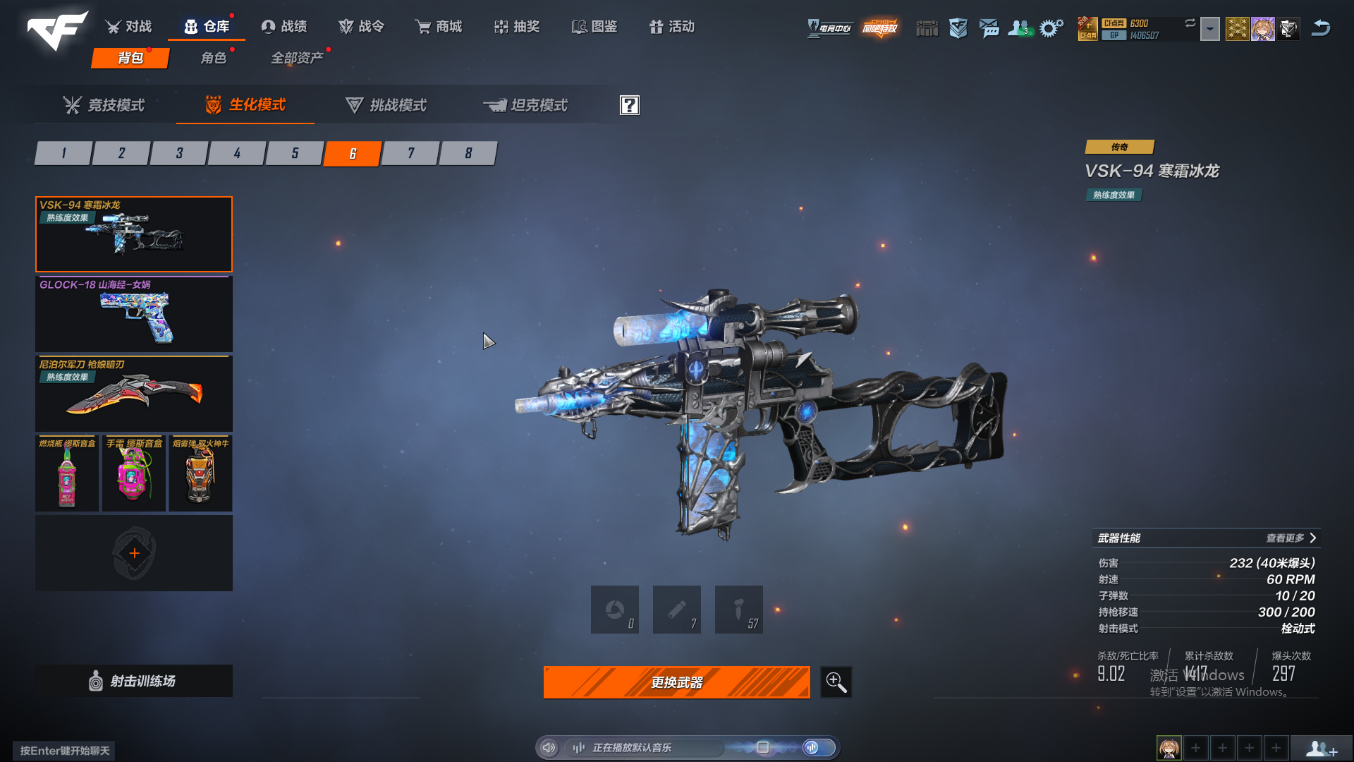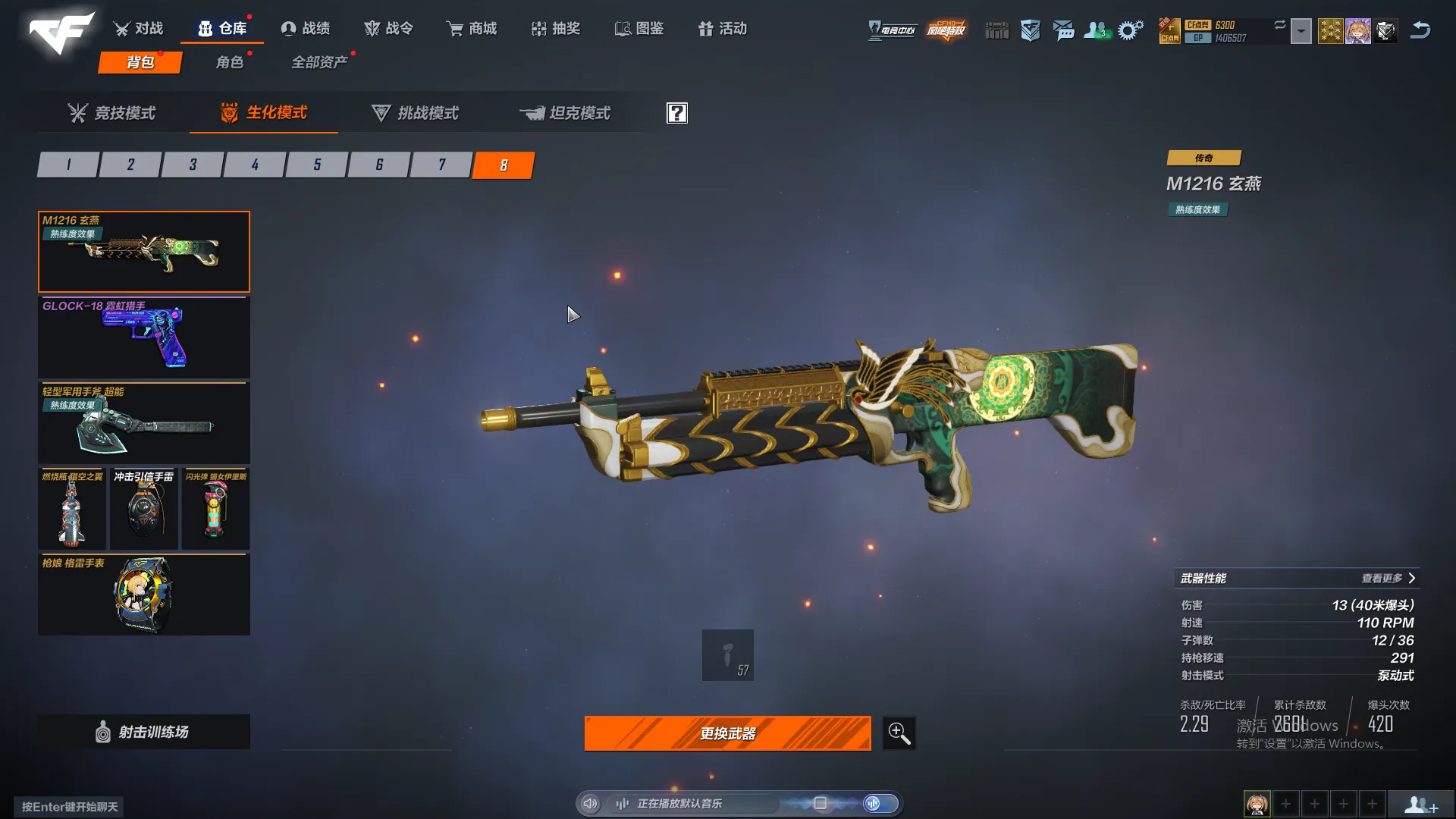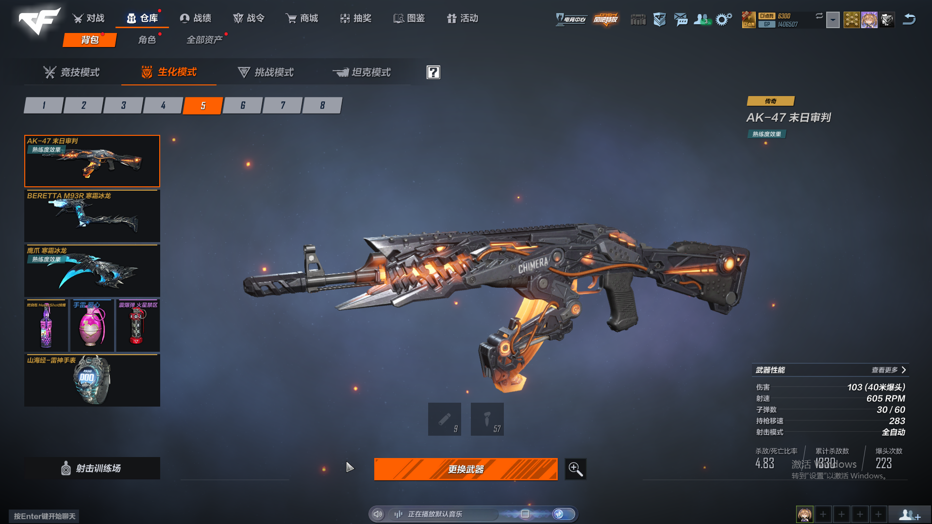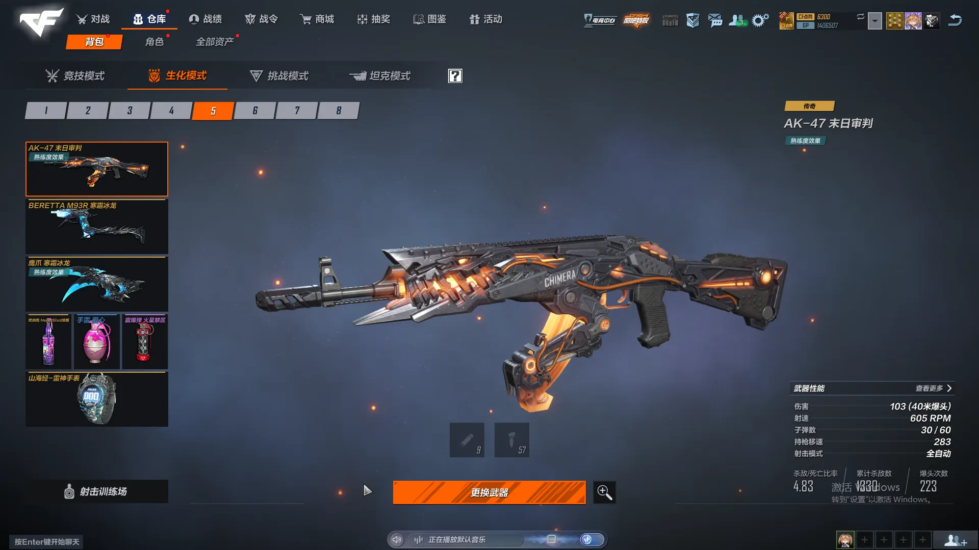 生化号,主要打怒气和追击。武器熟练度全满,主要好的人物有晴雅,雨琦弟弟,雾萌萌,夜莺。追击幽灵人物有阿飘和香水百合,逆转,魔晶,小黑子,女巫,太空人,英雄有影刃,牛仔,女警,磐石,玄月。怒气有猴子和皮肤,陀螺人,虚空,黑轮,魔腾,女鬼兔女郎都有。枪皮数量一般,枪皮有图,比不上富哥,够用就行。