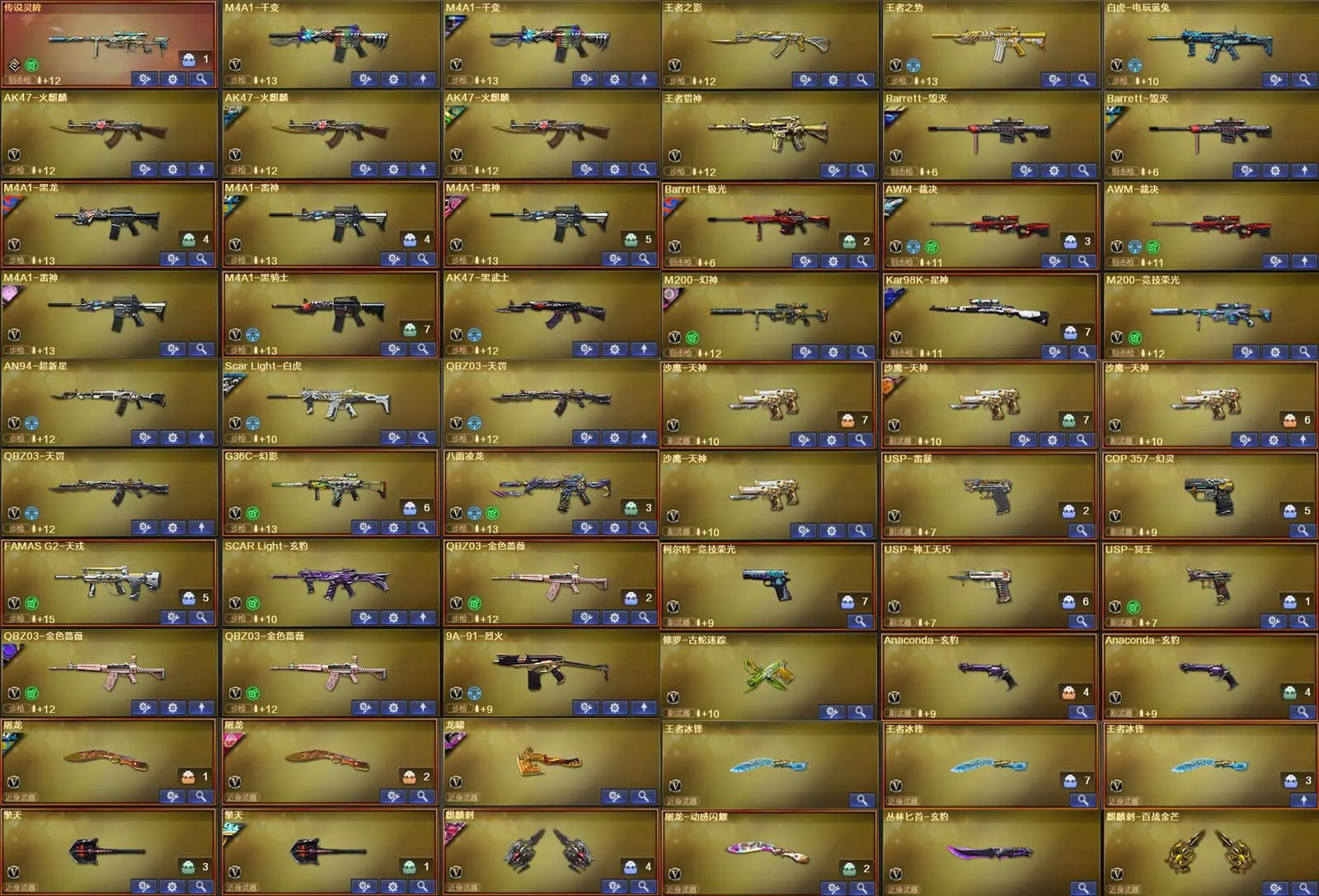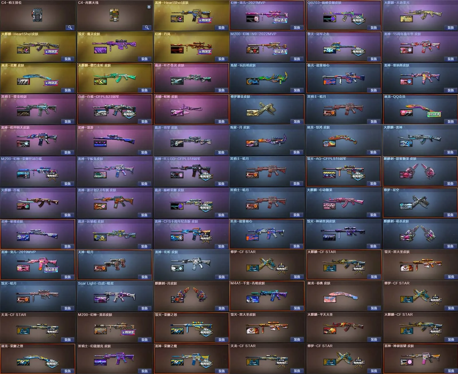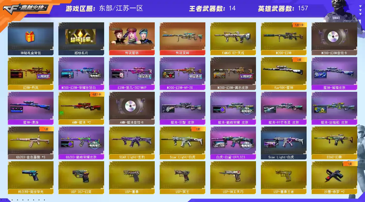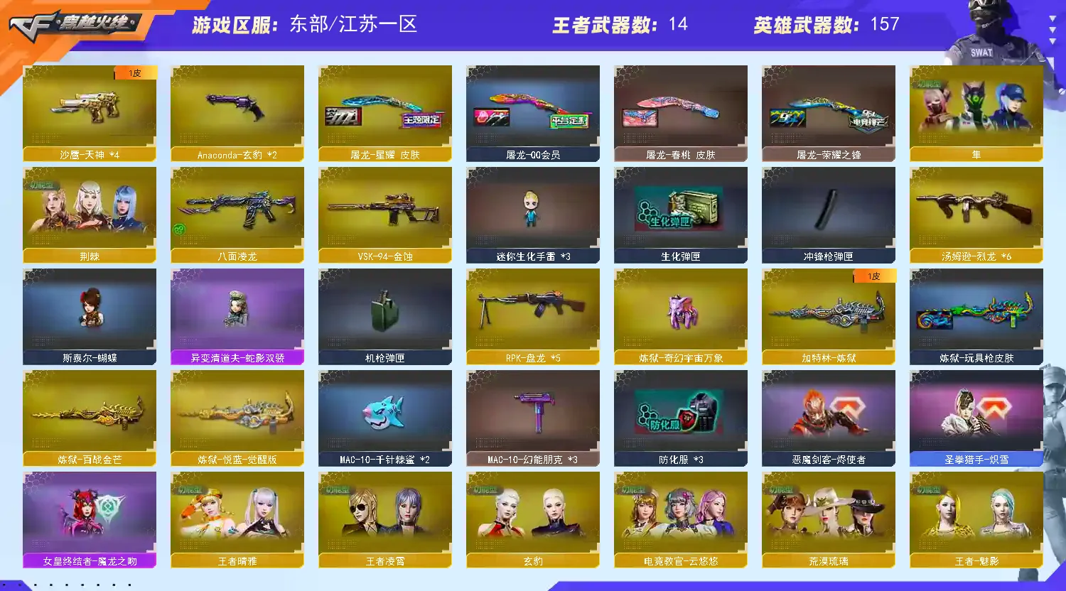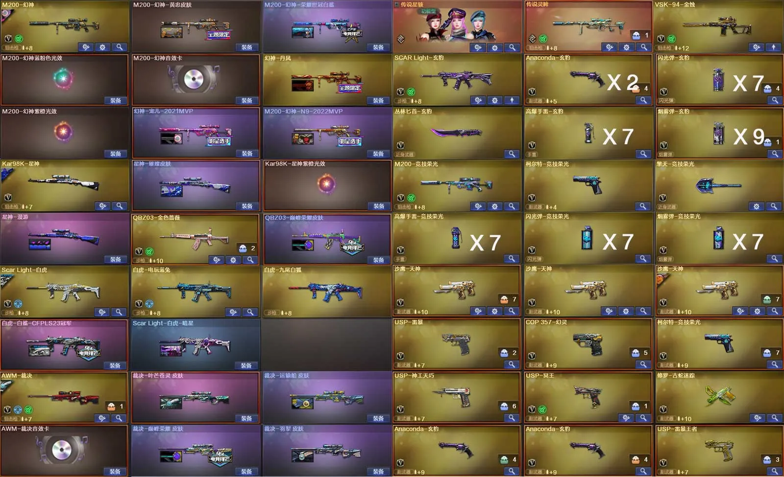 多四防角色,各种皮肤武器光效玩偶道具,欢迎来体验!武器太多,截不了那么多图!【此号全部装备太多截不了太多图,还有很多神器未截图,普通CF点武器也是一百多个就不截图了(满背包满道具爆破、生化、挑战武器应有尽有多个玩偶主流武器多光效),主流枪械都有皮肤】