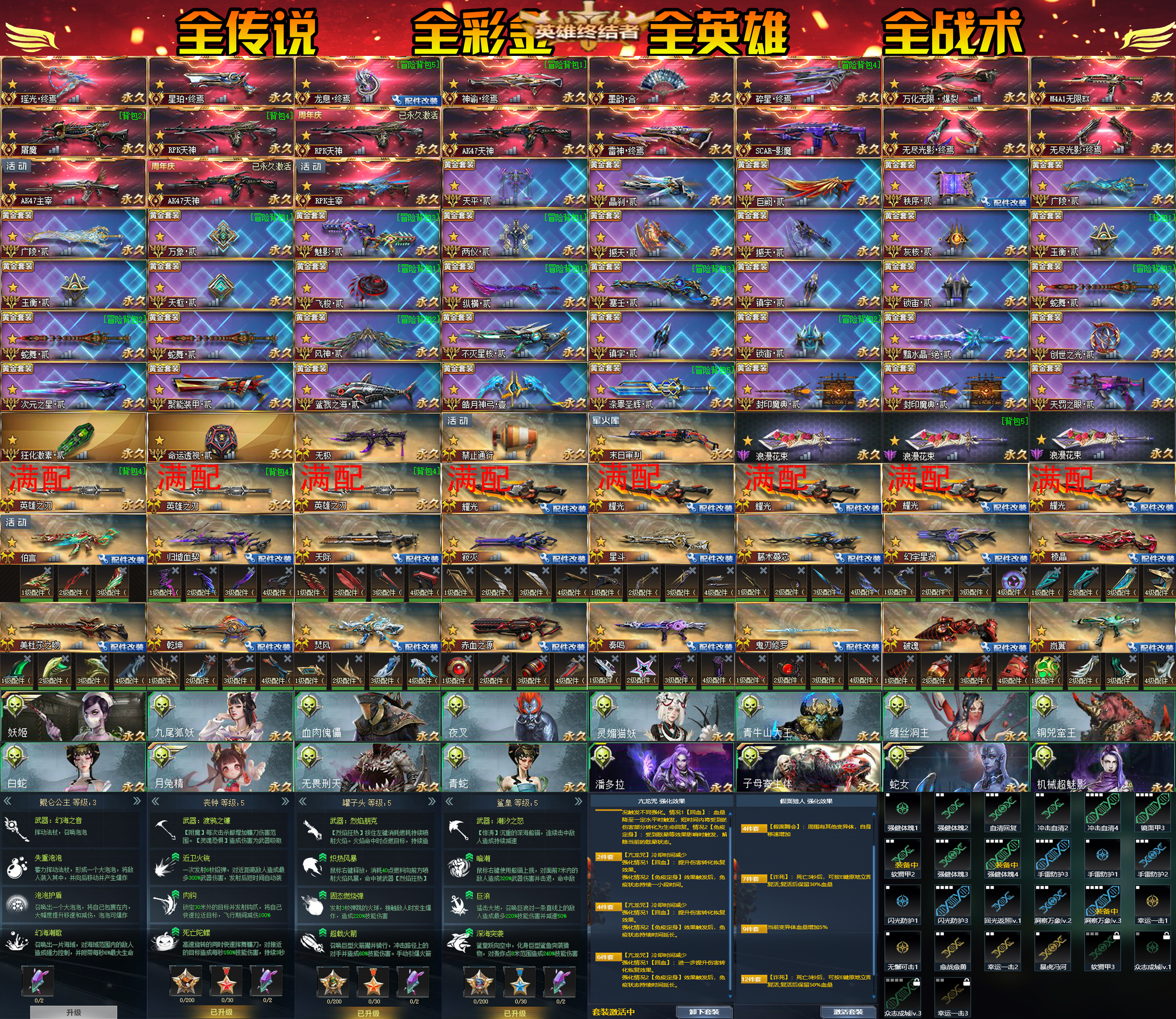 满配件武器:伯言◆归墟血契◆破魂◆星斗◆天际◆寂灭◆岚翼◆美杜莎之吻◆乾坤◆棱晶◆赤血之源◆焚风◆鬼刃修罗◆奏鸣◆藤木蔓芯◆创世星环◆幻彩星涡◆闪击◆尘埃◆幽冥◆绝境◆玄天◆末世◆弧光◆黑炎◆三连城◆核子裂变◆双跳跳锤◆迷你派拉◆裂隙行者◆双帝王战锤◆幻彩天虹◆子龙◆伏虎◆尘羽◆轮回之刺◆蛮牙◆三炎凰◆夜枭◆盖亚◆骑兵◆赛博野兽◆玄武◆魔杰座◆天引◆陷阵◆空间掌握者◆万兽◆浪淘沙◆逐浪◆凝视(升华)◆风暴◆降临◆三英雄之刃◆三灵狩◆镭射◆獠牙◆三原石之怒◆翎羽◆腐化劣魔◆含光承影◆守卫者◆藏锋◆幻锋◆无踪◆终末之弩◆猎犬◆英勇比伯◆致远星◆领域◆螳螂臂◆破空◆冬日温情◆裂星◆双皮寂静白龙◆霜雪◆原石之力◆瞬影◆虚空连弩(不死鸟)