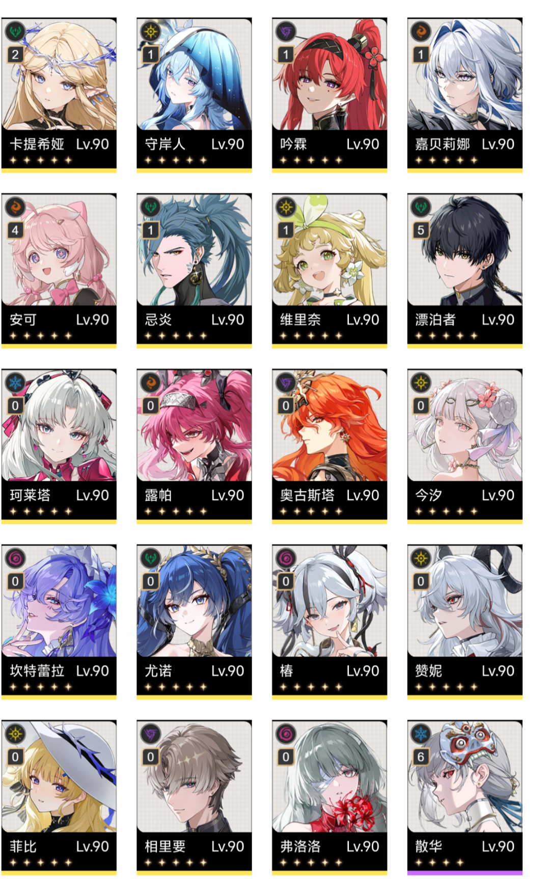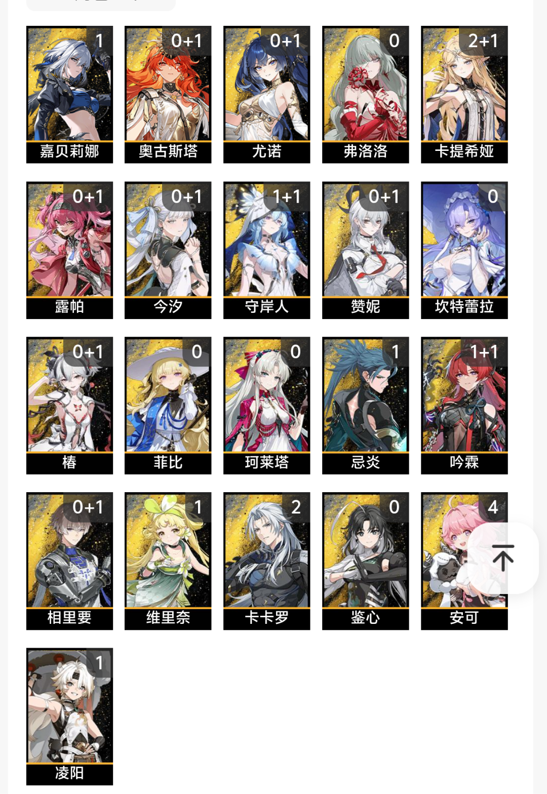 嘉贝莉娜1+1赞妮0+1今汐0+1守岸人1+1吟霖1+1椿0+1卡提希娅2+1露帕0+1相里要0+1奥古斯塔0+1尤诺0+1,有今夕,散华皮肤,不许动用号上任何资源抽卡,感谢理解,祝您生活愉快!