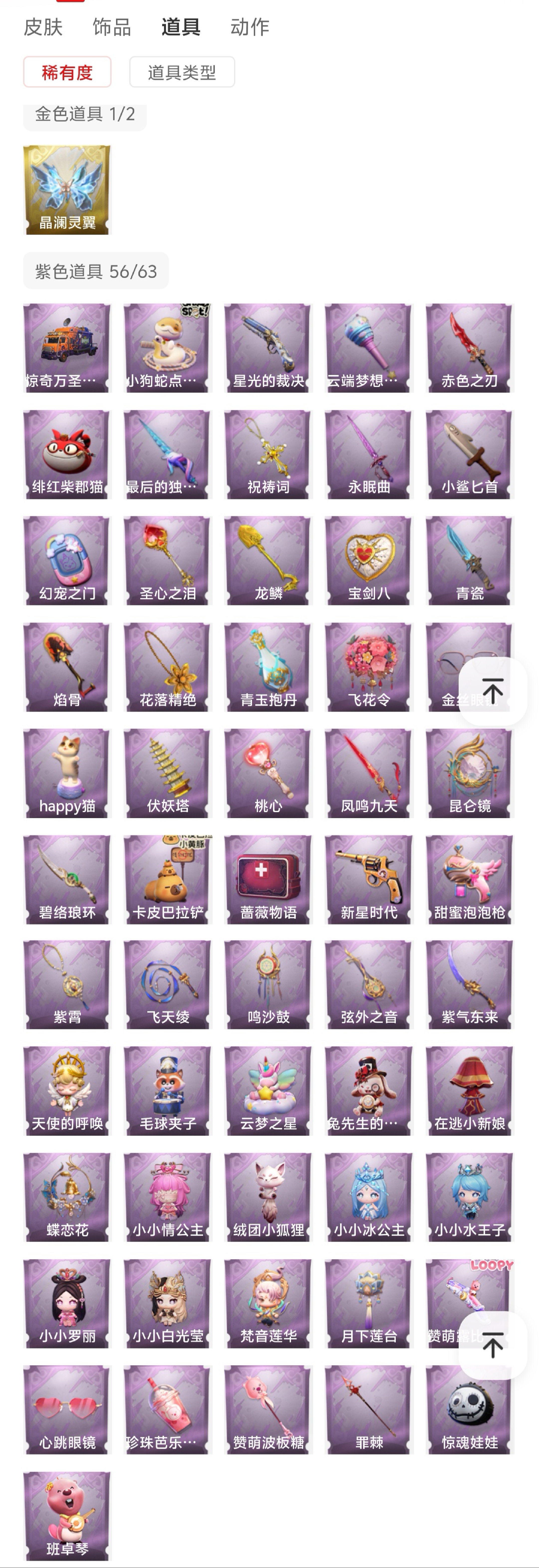【道具皮肤】喷气背包-晶澜灵翼、摸金符-花落精绝、长鞭-飞天绫、刺刀-紫气东来、铲子-龙鳞、铲子-卡皮巴拉小黄豚铲、黄牛能量饮料-青玉抱丹、刺刀-青瓷、桃木剑-凤鸣九天、转轮手枪-新星时代、短管猎枪-星光的裁决、急救包-蔷薇物语、摸金符-祝祷词、音响-happy猫、夜视仪-金丝眼镜、除颤仪-弦外之音、铲子-焰骨、桃木剑-最后的独角兽、音响-鸣沙鼓、铲子-圣心之泪、额外的背包-飞花令、传送按钮-幻宠之门、腰包-绯红柴郡猫、刺刀-碧络琅环、刺刀-小鲨匕首、长鞭-小狗蛇点点鞭、传送按钮-昆仑镜、腰包-月下莲台、腰包-宝剑八、专业手电-云端梦想计划、桃木剑-永眠曲、刺刀-赤色之刃、电击枪-甜蜜泡泡枪、摸金符-紫霄、葫芦-伏妖塔