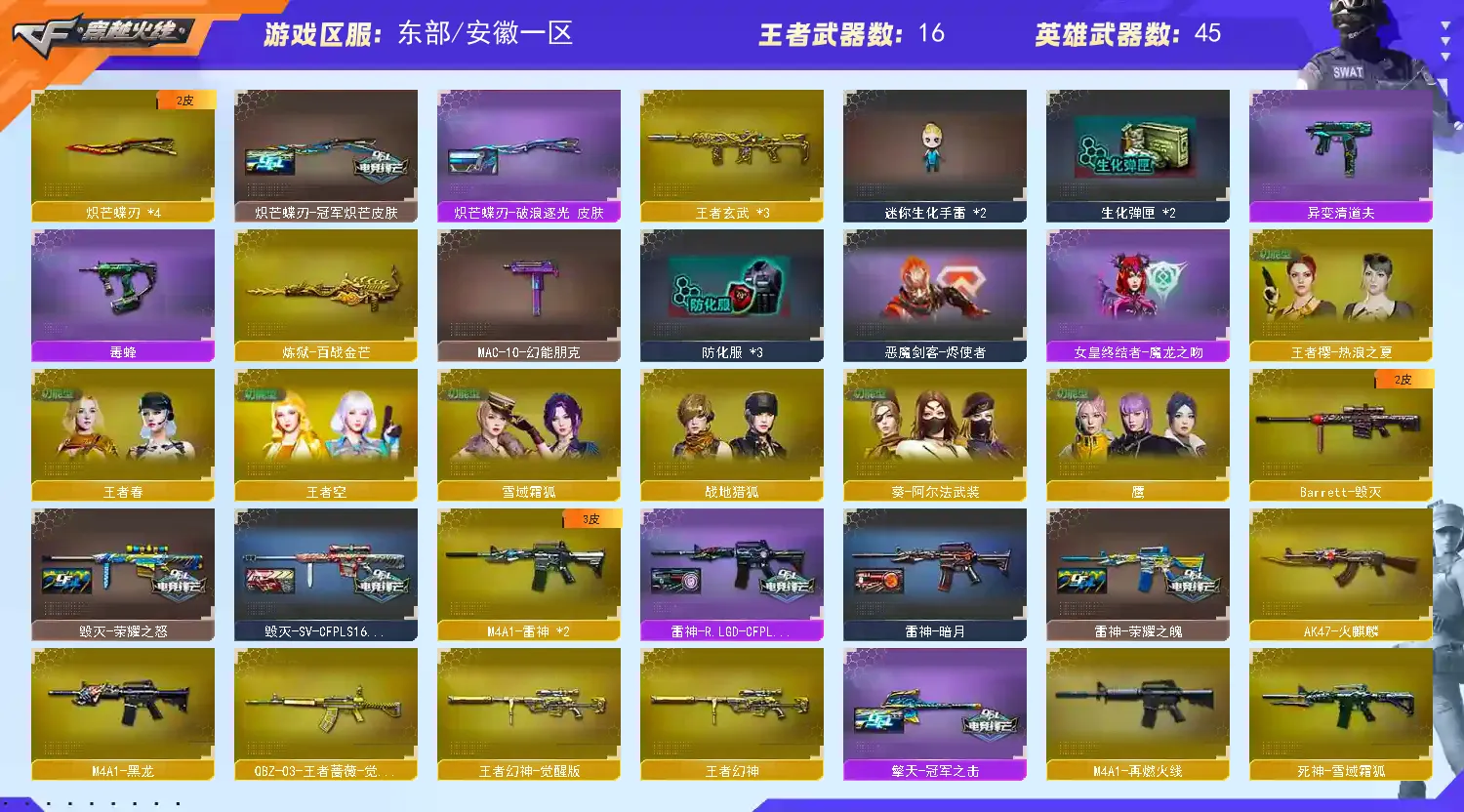 精品专玩多人生化空中遗迹4把蝴蝶刀3玄武生化追击专属,爆破全装备qbz幻神G36C白虎王者幻神觉醒版跟非觉醒版各一个,雷暴套,冠军之特2白鲨柯尔特,热门狙击枪三件套带精品皮(王者春,王者空,鹰,毒蝰术士,隼)(犯规排位挂机巅峰赛)依法追究买家责任,拉黑此平台永久租号