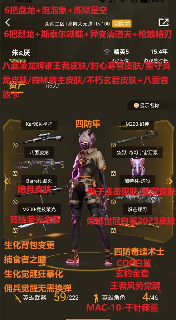 T0生化号✅传说幽冥+八面凌龙5皮+音效✅幻神✅星神✅泡泡象6盘龙+6烈龙蝴蝶+炽芒蝶刃✅竞技荣光全套✅玄豹套✅全弹匣