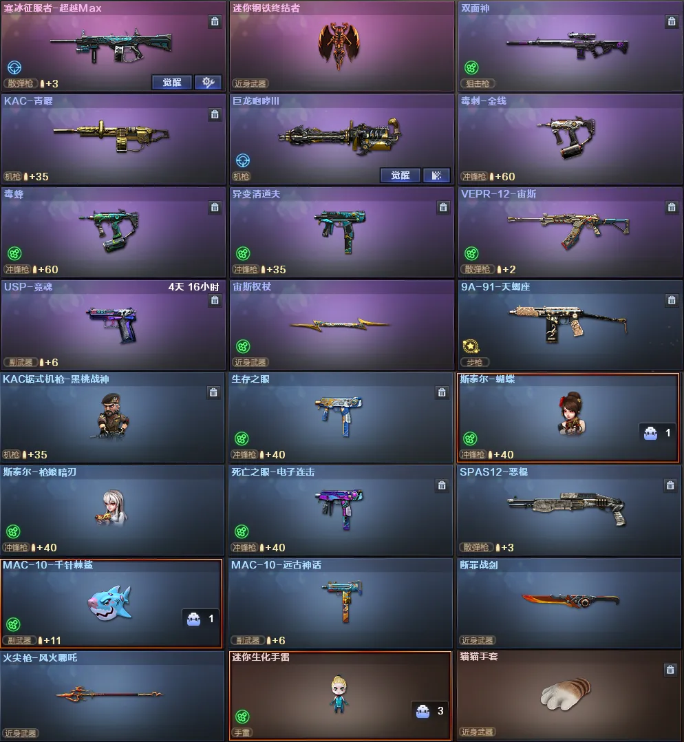 小人枪武器特殊武器:火麒麟零纪元、炼狱奇幻宇宙万象、炼狱秦狮、MAC-10龙宝、COP白鲨、迷你钢铁终结者、KAC黑桃战神、斯泰尔蝴蝶、斯泰尔枪娘暗刃、MAC-10-千针棘鲨、迷你地狱终结者、猫猫手套、迷你生化手雷X2