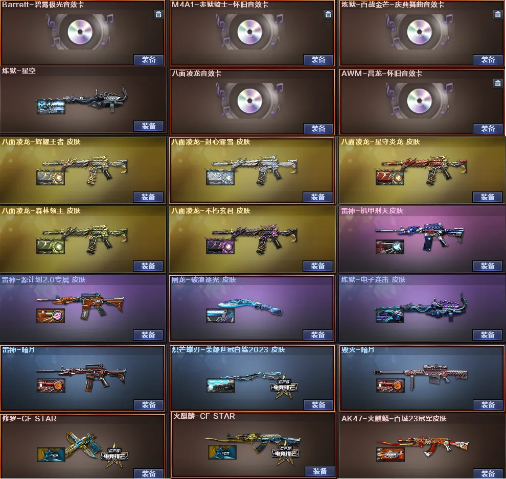 音效卡:八面凌龙音效卡、炼狱百战金芒庆典舞曲音效卡、赤狱骑士怀旧音效卡、碧霄极光音效卡、昌龙怀旧音效卡
