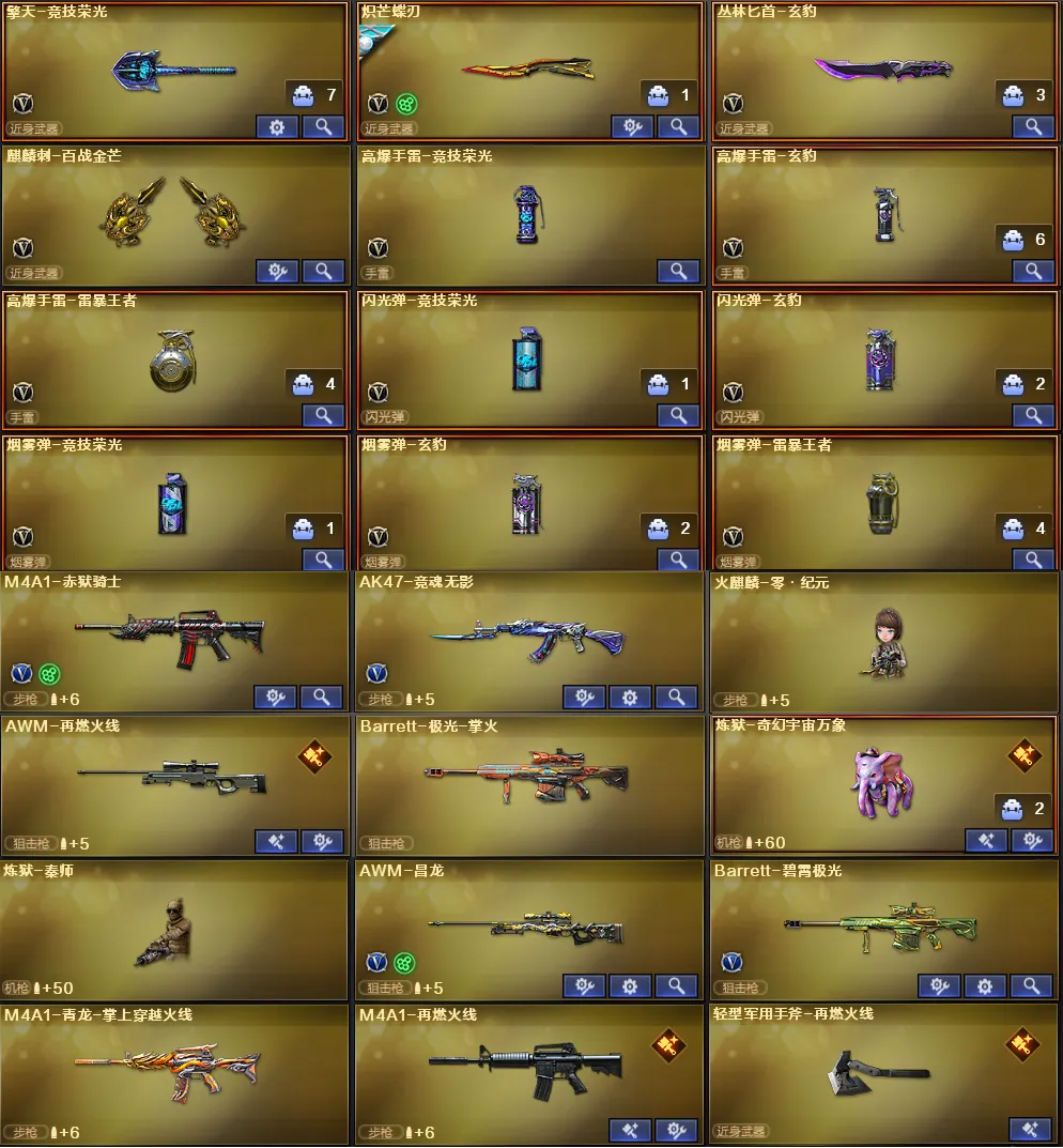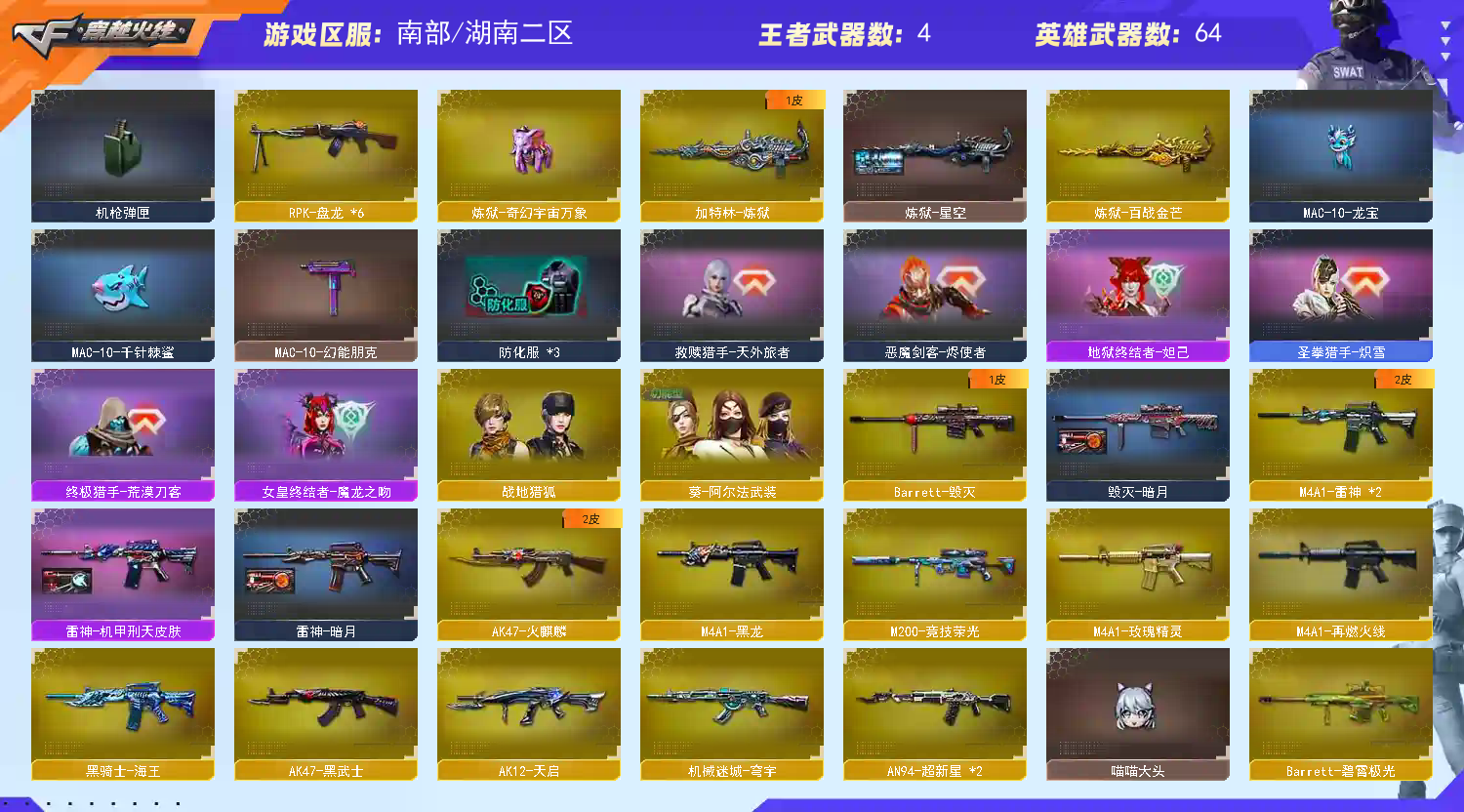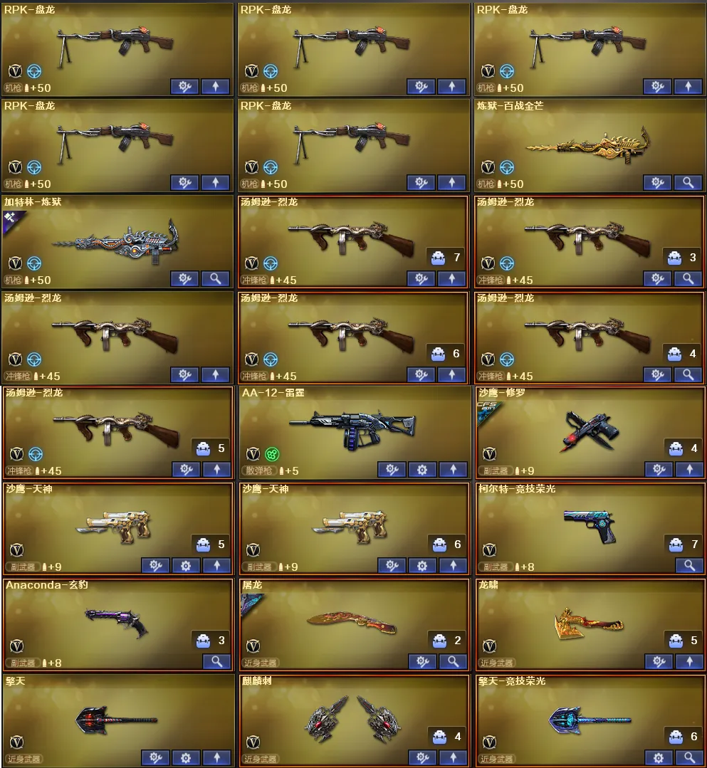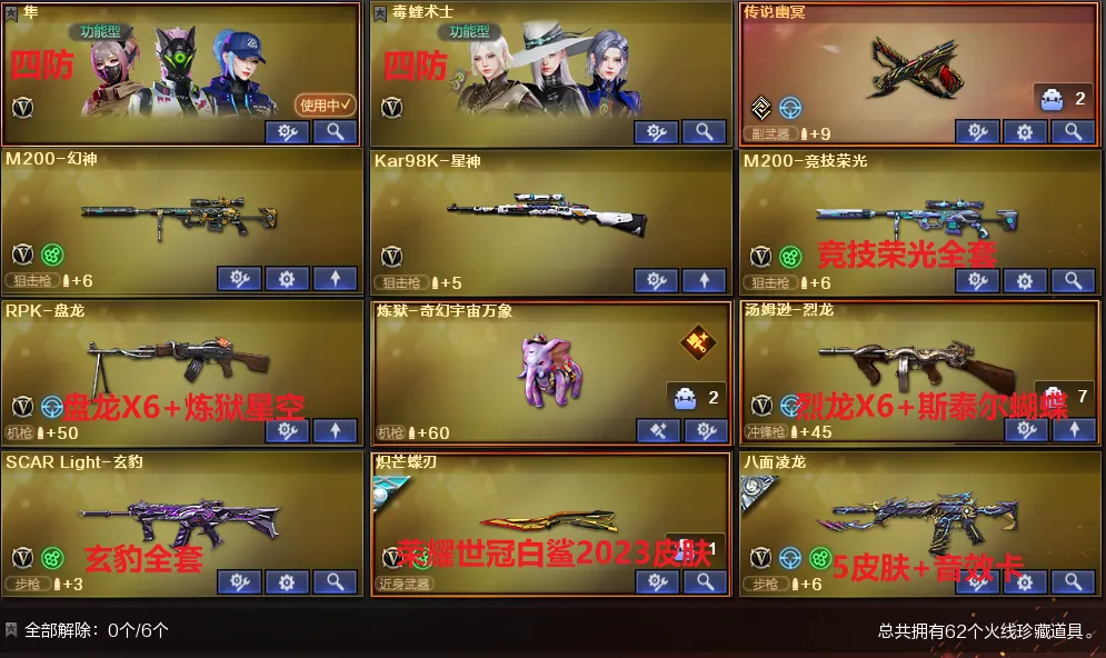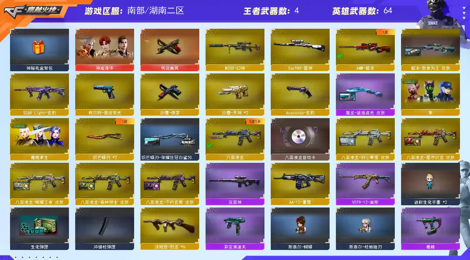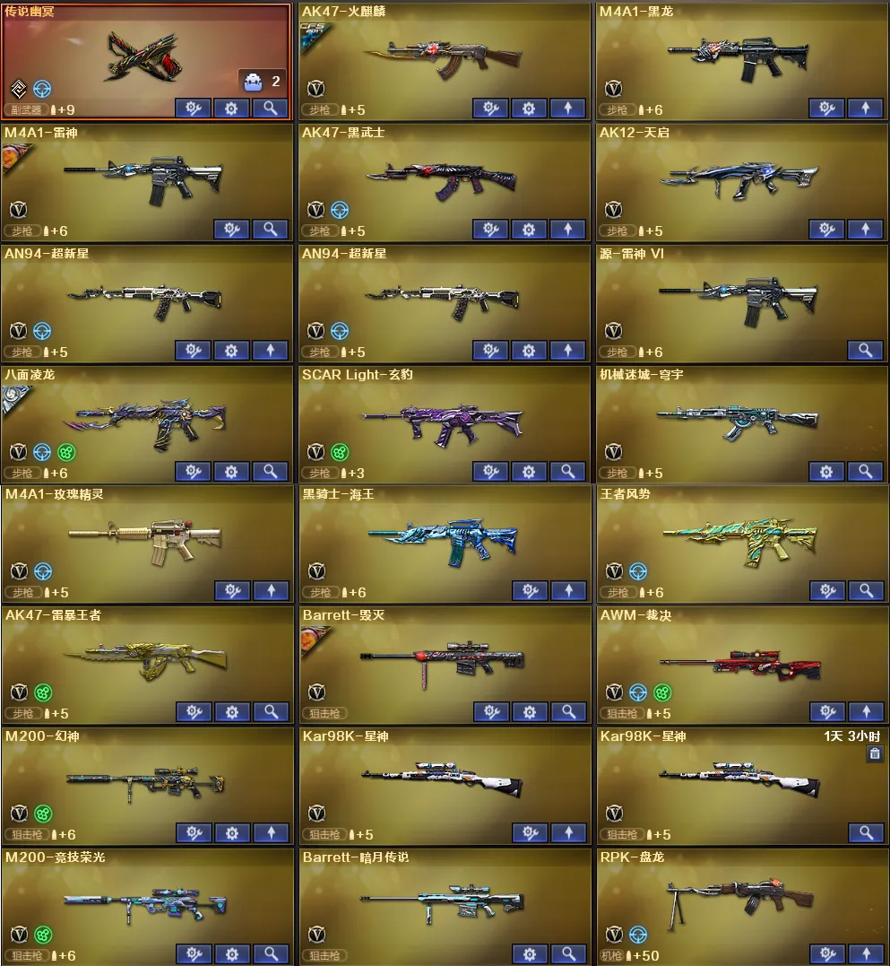 稀有武器:传说幽冥、八面凌龙、炽芒蝶刃、M200幻神、98K星神、烈龙X6+斯泰尔蝴蝶+异变清道夫、盘龙X6+炼狱奇幻宇宙万象+炼狱百战金芒、M200竞技荣光、SCAR Light玄豹、王者风势觉醒、火麒麟、黑龙、雷神、黑武士、天启、超新星X2、源雷神、机械迷城穹宇、玫瑰精灵、黑骑士海王、AK47雷暴、毁灭、裁决、暗月传说、A12雷霆、修罗、天神X2、柯尔特竞技荣光、Anaconda玄豹、屠龙、龙啸、擎天、麒麟刺、擎天竞技荣光X2、丛林匕首玄豹、麒麟刺百战金芒、AK47竞魂无影、昌龙、碧霄极光、寒冰征服者超越MAX、双面神、KAC青曜、巨龙咆哮3、毒刺金线、毒蜂、异变清道夫、VEPR12宙斯、宙斯权杖、生存之眼