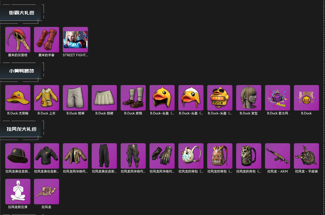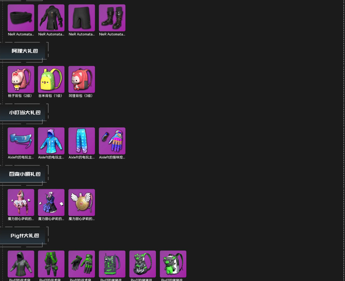 【优质套装】蒸汽朋克大礼包,小黄鸭套装,拉风龙大礼包,小兔学院大礼包,街霸大礼包,PGC 2022 大礼包,小叮当大礼包,尼尔大礼包,西游记大礼包,百变小樱礼包,星魂大礼包,Pigff大礼包,悲喜大礼包,阿狸大礼包,新女团礼包,危险玩偶屋超级大礼包,叛逆兔大礼包