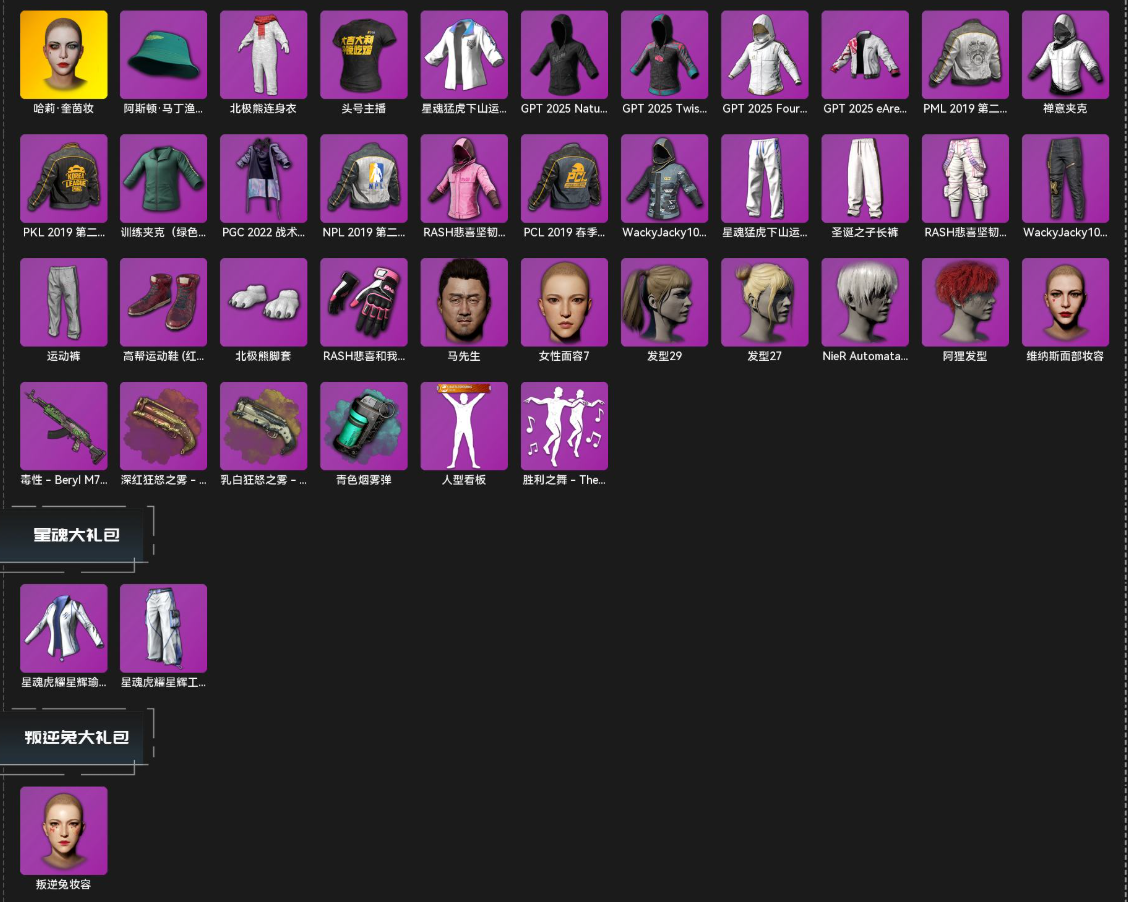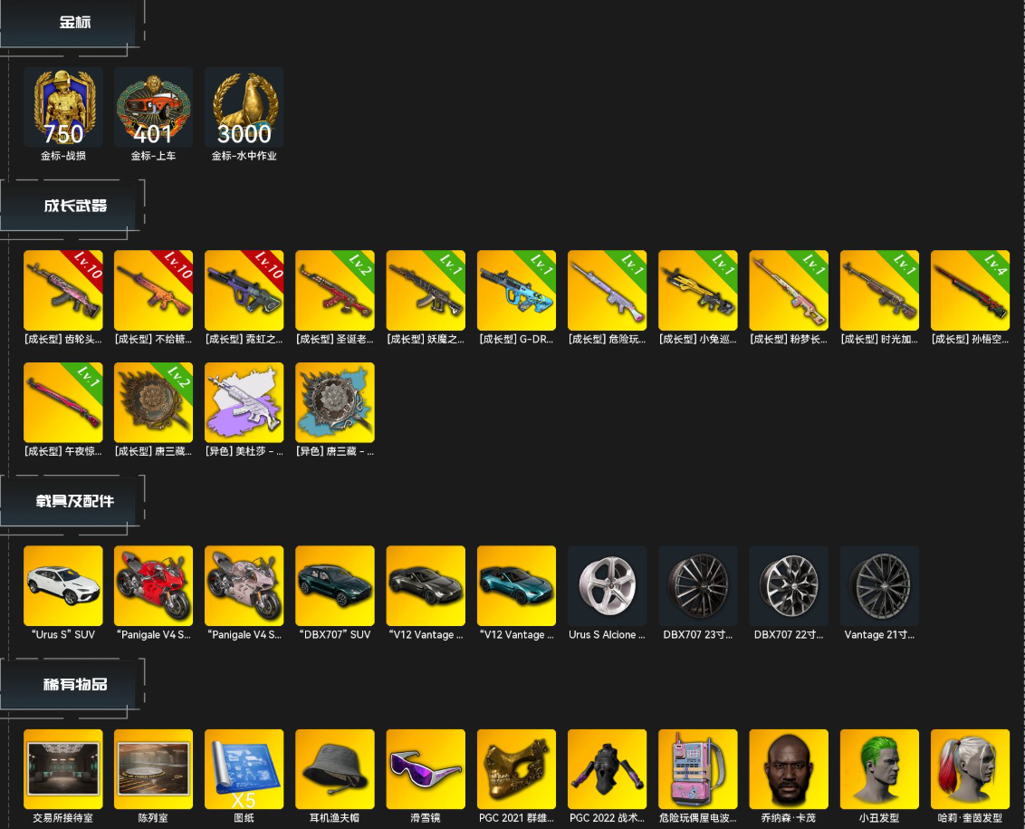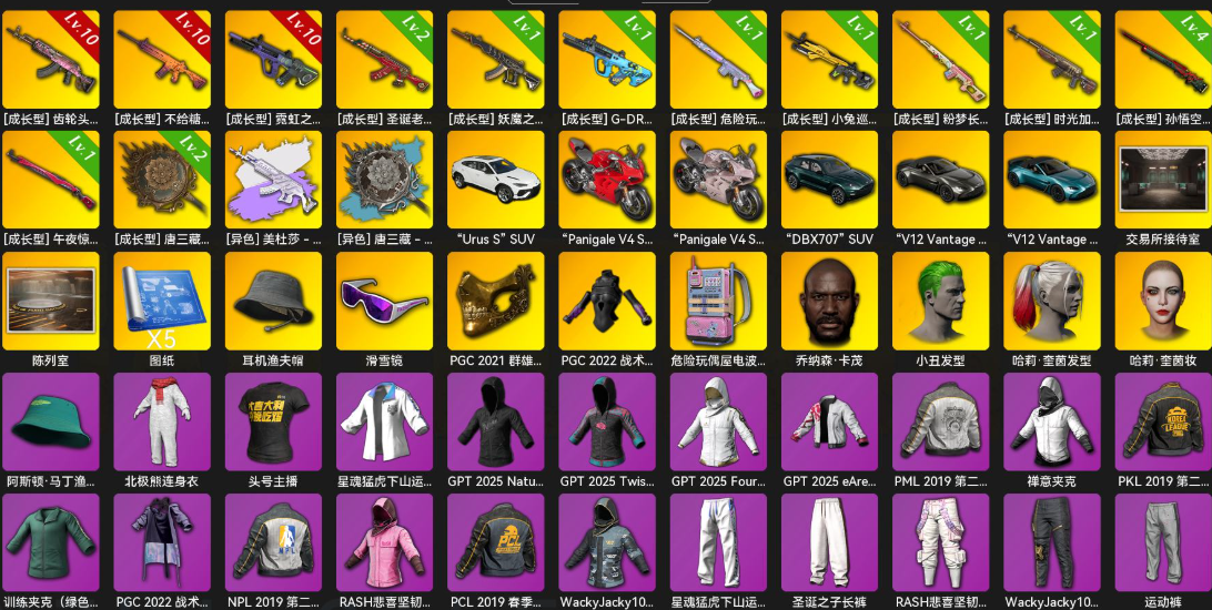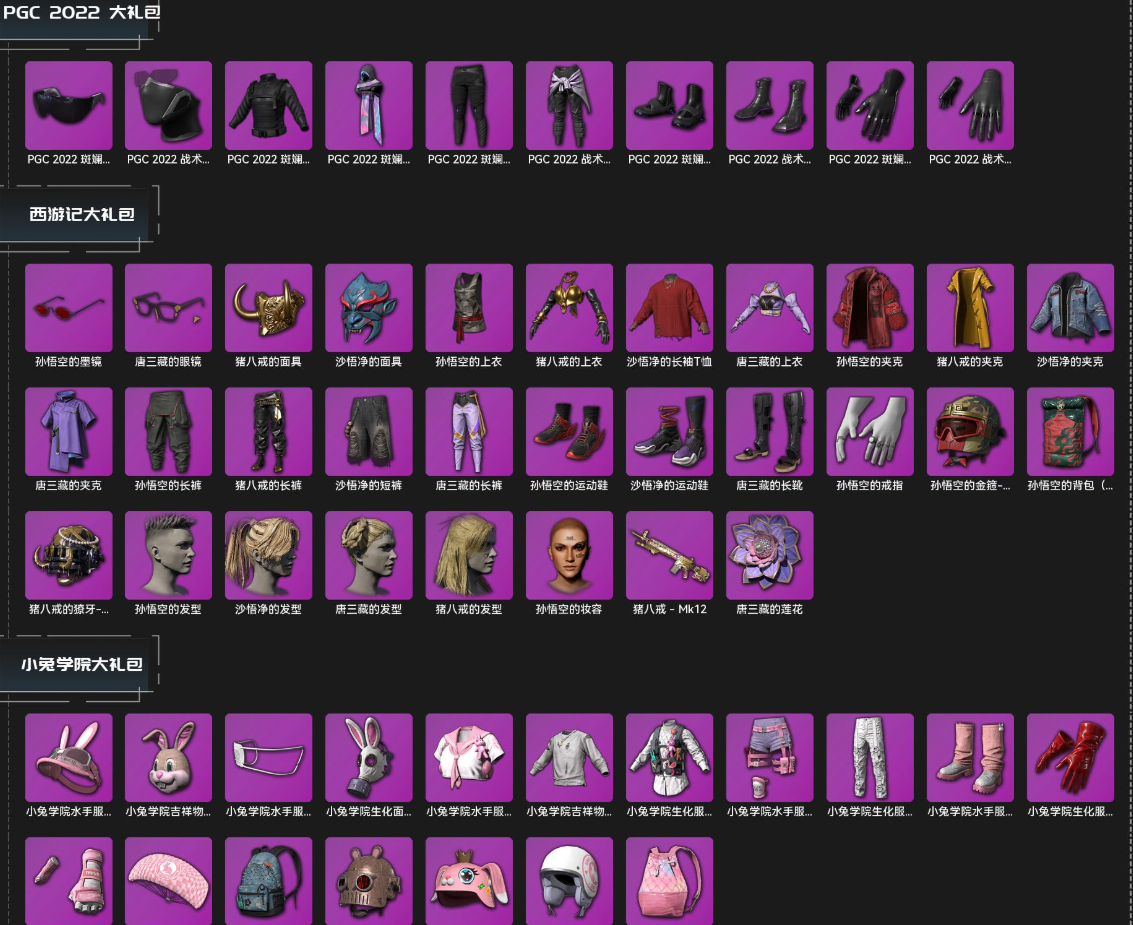 【优质装备】孙悟空的金箍-头盔(3级),魔力甜心萨莉的幸运背包(2级),阿狸背包(3级),猪八戒的獠牙-头盔(3级),RASH悲喜的背包(1级),拉风龙的背包(3级),B.Duck-头盔(3级),Pigff的猪猪战术小队电波干扰背包,小兔学院降落伞,RASH悲喜的背包(3级),吉米背包(1级),拉风龙的背包(1级),小兔学院-头盔(2级),小兔学院背包(1级),B.Duck-头盔(1级),RASH悲喜的背包(2级),危险玩偶屋电波干扰背包,小兔学院背包(2级),PUBG x NewJeans LOGO-头盔(2级),小兔学院-头盔(3级),B.Duck-头盔(2级),拉风龙的背包(2级),桃子背包(2级),兔兔也朋克降落伞,孙悟空的背包(2级),小兔学院-头盔(1级)