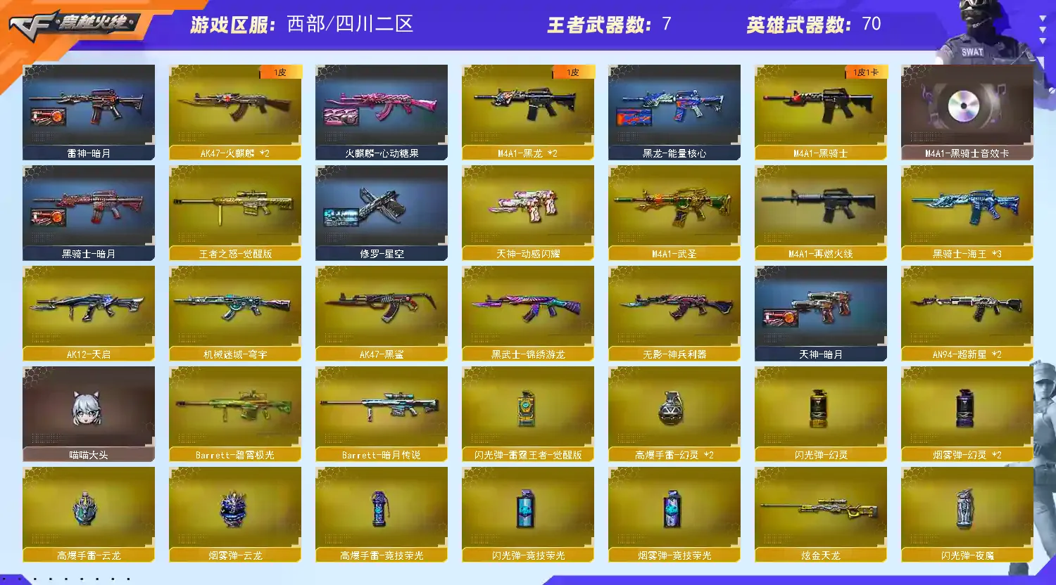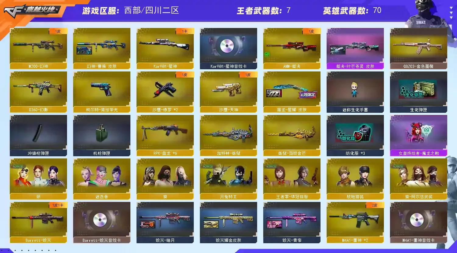【m200幻神+曹操】【98k星神+音效卡 】【6盘龙 炼狱*2】【g36c幻影】【qbz金色蔷薇】【火麒麟】【黑龙】【雷神+卡+白鲨冠军】【黑骑士+卡】【毁灭+卡】【裁决 】【武器:武圣 天启 王者之势 王者之戮 王者冰魄 海王 】【5手枪:修罗*2 天神*2 竞技荣光 】【10刀具:屠龙*3 龙啸 擎天 麒麟刺 幻灵之峰 竞技荣光 麒麟刺 龙啸 】【雷套:幻灵雷 竞技荣光雷 】【小人枪:cop白鲨】【音效卡:星神音效卡 黑骑士音效卡 雷神音效卡 毁灭音效卡 】【四防角色:研 月兔特工 王者零华冠丽服 职业经理 】