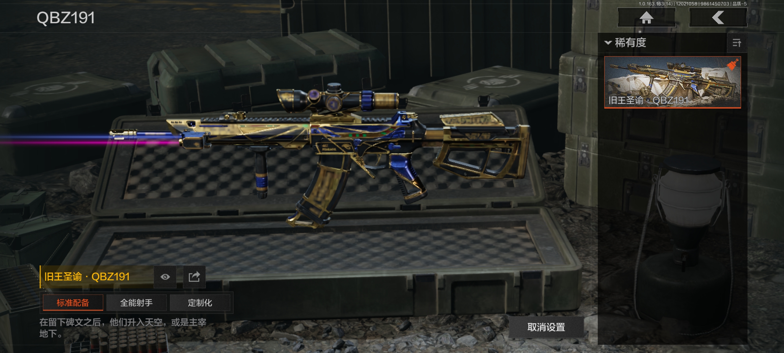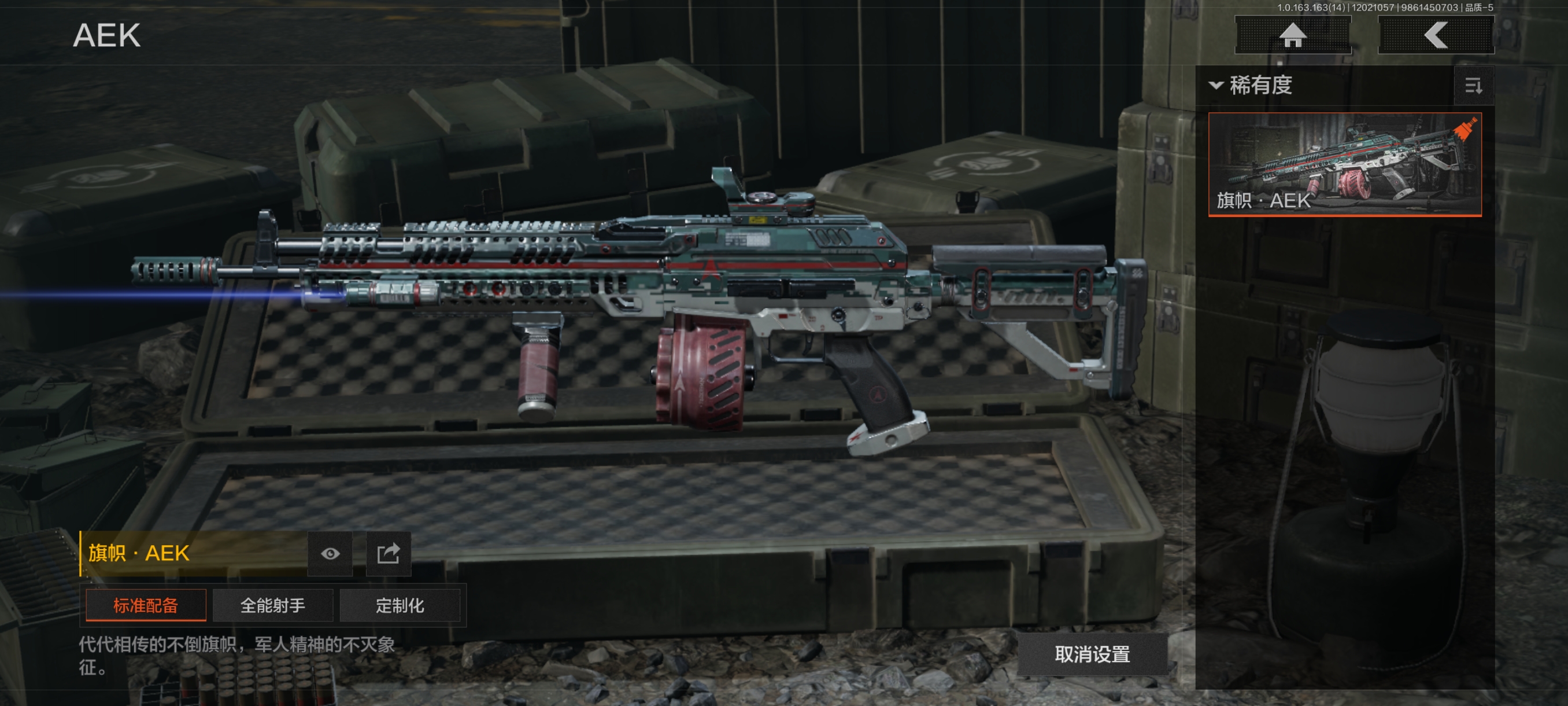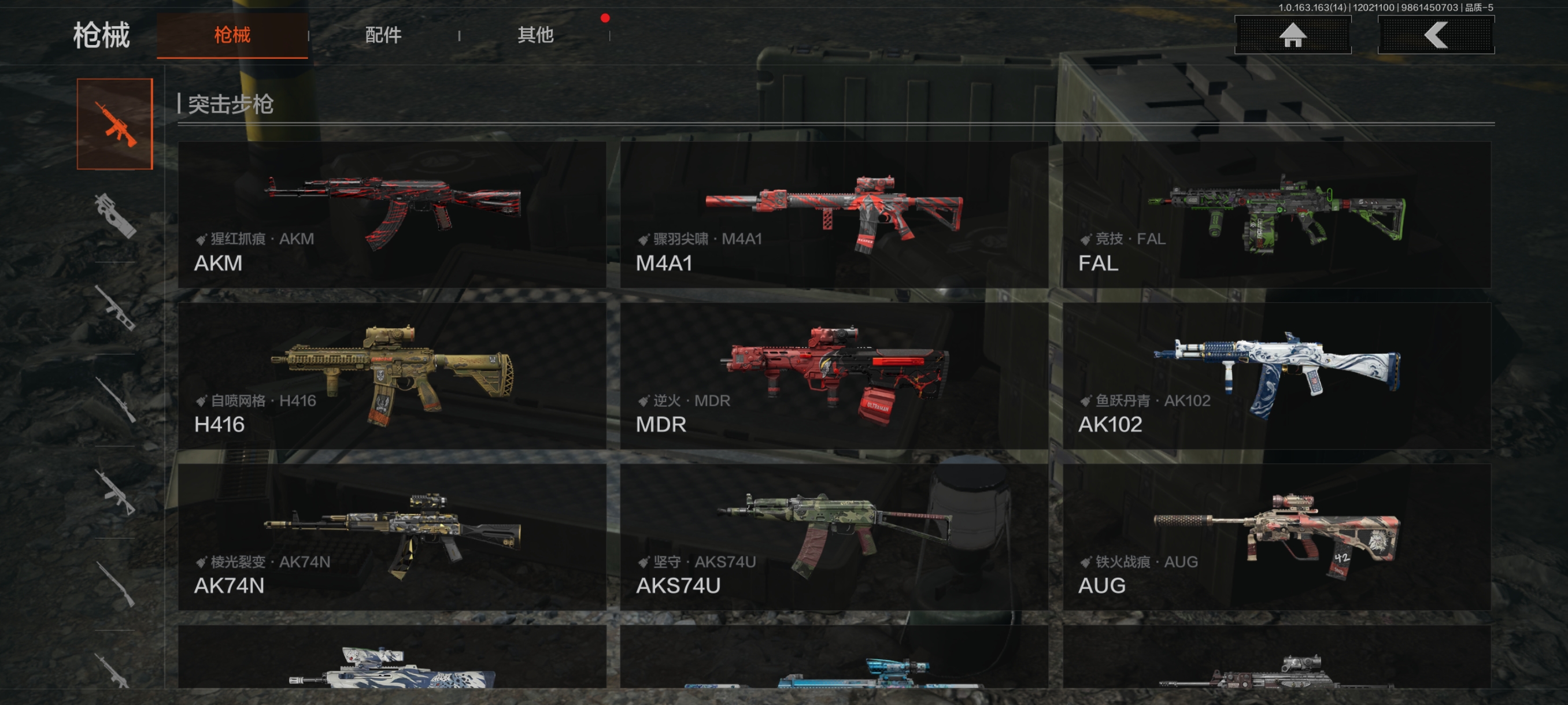 30级,历史最高段位:暗区传说【近战武器】:瀚星斩铁,涂鸦利刃,胜利军刀,冬日冰镐,精英指虎,突击匕首,工兵铲,来战开山刀;【角色皮肤】:硝云余响作战服,黑暗行者特摄戏服,钢铁壁垒作战服,噤声者吉利服,城市户外运动套装,王国卫队礼装轻装,都市夜影套装,街区守卫;【手套】:噤声者作战手套,冬日手套;【突击步枪】:包络战术AKM,火力倾泻AKM,猩红抓痕AKM,来战AKM,潜渊蛇鳞M4A1,骤羽尖啸M4A1,特遣小队M4A1,战术大师M4A1,德尔塔小队M4A1,竞技M4A1,黑金国际M4A1,竞技FAL,真实之眼FAL,历战FAL,秋宴FAL,自喷网格H416,逆火MDR,竞技MDR,鱼跃丹青AK102,玄墨披挂AK102,洞窟遗迹AK102,来战AK74N,山地伪装AK74N,棱光裂变AK74N,白狼连队AK74N,骑士之剑AKS74U,最后防线AKS74U,火绒AKS74U,坚守AKS74U,龙影AKS74U,竞技AUG,火力倾泻AUG,铁火战痕AUG,雪山之王F2000,炎夏浪花AR57,骑士之剑ACE31,旗帜AEK,壁垒AN94,粉绒臻选AN94,绿松石数码Groza,虎纹Groza,铁火战痕FAMAS,幻象FAMAS,虎纹FAMAS,深水浴池FAMAS,青瓷涂层SCAR,绿海猎手SCAR,森林迷彩T951,绿松石数码T951,青瓷涂层T951,巡林客T951,百锻寒芒T951,飞鲨T951,沙漠数码T03,虎纹T03,利齿风暴T03,百锻寒芒T03,玄戈梨花T03,深潜T03,林地数码T03,北国内卫AK12,沙海AK12,骤羽尖啸AK12,沙海MCX,鱼跃丹青MCX,旧王圣谕QBZ191,绿松石数码9A91,绿海猎手AR15;【冲锋枪】:空勤特遣MP5,火力倾泻MP5,森林迷彩MP5,猩红抓痕MP5,深粉玫瑰MP5,利齿风暴MPX,激流MPX微型冲锋枪,青瓷涂层MPX,雪山之王MPX,星云火花P90,冬日精灵P90,绿海猎手P90,洞窟遗迹UZI,自喷网格UMP45,滑雪季UMP45,洞窟遗迹UMP45,玄墨披挂MAC10,殷红渐变MAC10,多边棱彩MAC10,利齿风暴T79,镀铬寒铁T79,沙色Vector45,绿松石数码T85,山地伪装Vector9,洞窟遗迹Vector9,龙影Suomi,滑雪季Suomi,战术大师Suomi,绿海猎手CPW,醒目提示MP5K;【射手步枪】:旗帜SVDS,猩红羽翼VSS,钢铁数码VSS,典礼武备MK14,旗帜脉冲M110,绿海猎手M110,缟兵玄墨M110,全地形数码M110,绿松石数码DBR,鱼跃丹青QBU191,绿松石数码QBU191;【栓动步枪】:白垩游魂莫辛,棱光裂变莫辛,滑雪季莫辛,轰炸小子AX50,骑士之剑SJ16,战术大师SJ16,深粉玫瑰SJ16,绿松石数码SJ16;【轻机枪】:壁垒RPK16,旗帜RPK16,战术大师RPK16,怒火重燃RPK16,虎纹M249,猩红抓痕M249,多边棱彩M249;【霰弹枪】:绿海猎手M870,多边棱彩M870,玄墨披挂MP133,典礼武备S12K,沙海S12K,醒目提示S12K,胜利S12K,无畏USAS12,沙海USAS12,真实之眼SPR310,四色花DP12,火漆DP12,雪原凌锋DP12;【卡宾枪】:绿松石数码SKS,绿海猎手M14,多边棱彩M96,绿海猎手Mini14,滑雪季BM59,洞窟遗迹BM59,虎纹BM59;【手枪】:涂鸦G18C,午夜梦魇G18C,绿松石数码沙漠之鹰,洞窟遗迹沙漠之鹰,青瓷涂层T05,滑雪季F57,水蓝F57,深潜F57,灰白回纹M300,猩红抓痕M300;