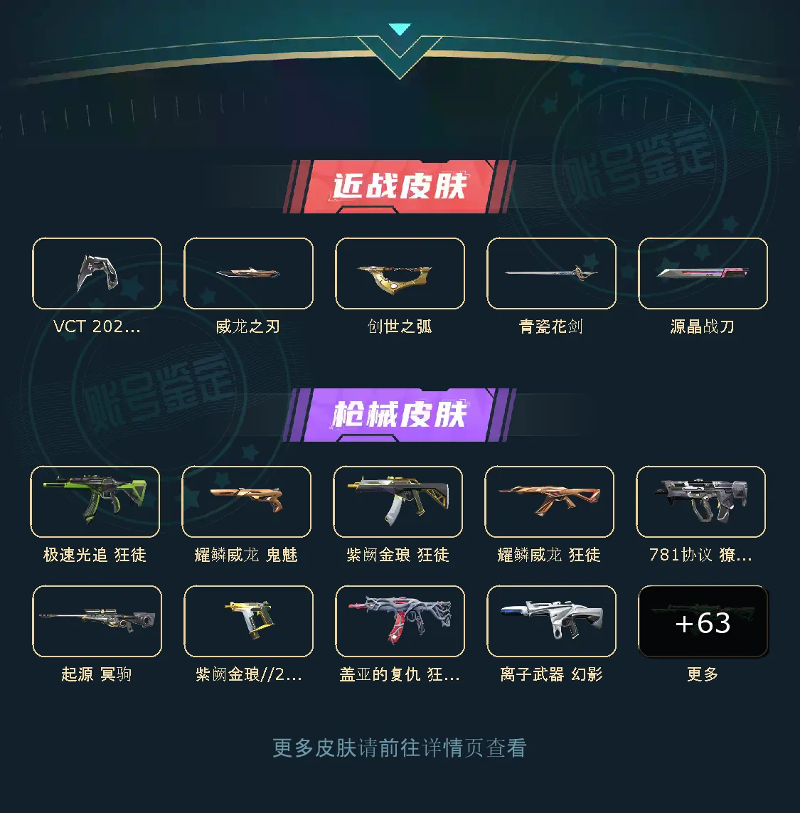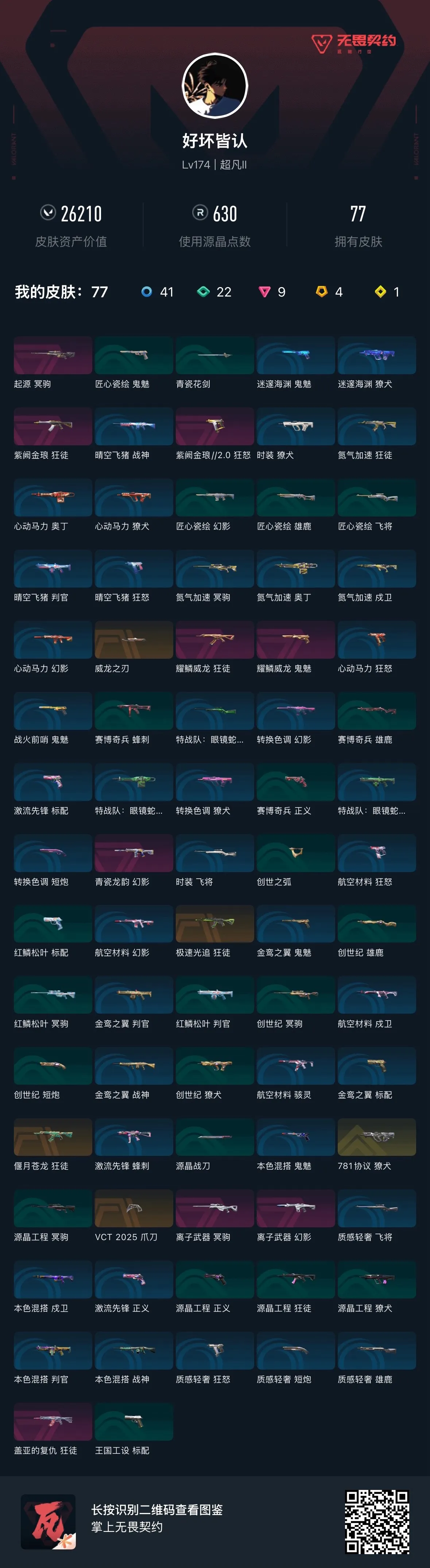 77件皮肤图鉴 全角色 有绝版VCT爪刀 威龙全套 盖亚狂徒 离子幻影 显卡狂徒 青龙狂徒 781撩犬 青花瓷 离子冥驹 起源冥驹 等等武器…