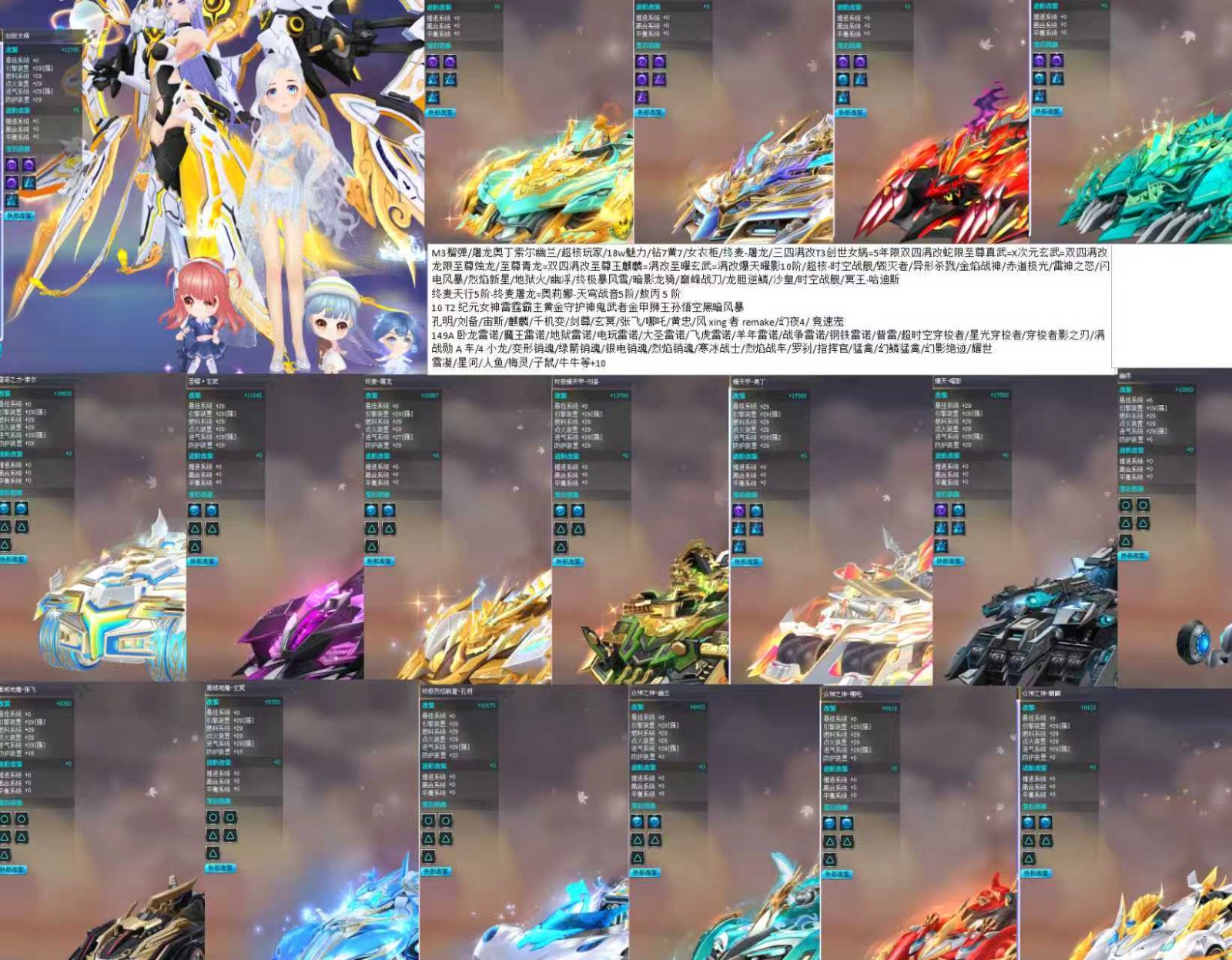 星辰幻象璀璨 /M3榴弹/爆天甲 甜甜/屠龙奥丁索尔幽兰/超核玩家/19w魅力/钻7黄7/女衣柜/终麦-屠龙/三四满改T3创世女娲=5年限双四满改蛇限至尊真武=X次元玄武=双四满改龙限至尊烛龙/至尊青龙=双四满改至尊玉麒麟=满改至曜玄武=满改爆天曜影10阶/超核·时空战舰/毁灭者/异形杀戮/金焰战神/赤道极光/雷神之怒/闪电风暴/烈焰新星/地狱火/幽浮/终极暴风雪/暗影龙骑/巅峰战刀/龙胆逆鳞/沙皇/时空战舰/冥王·哈迪斯