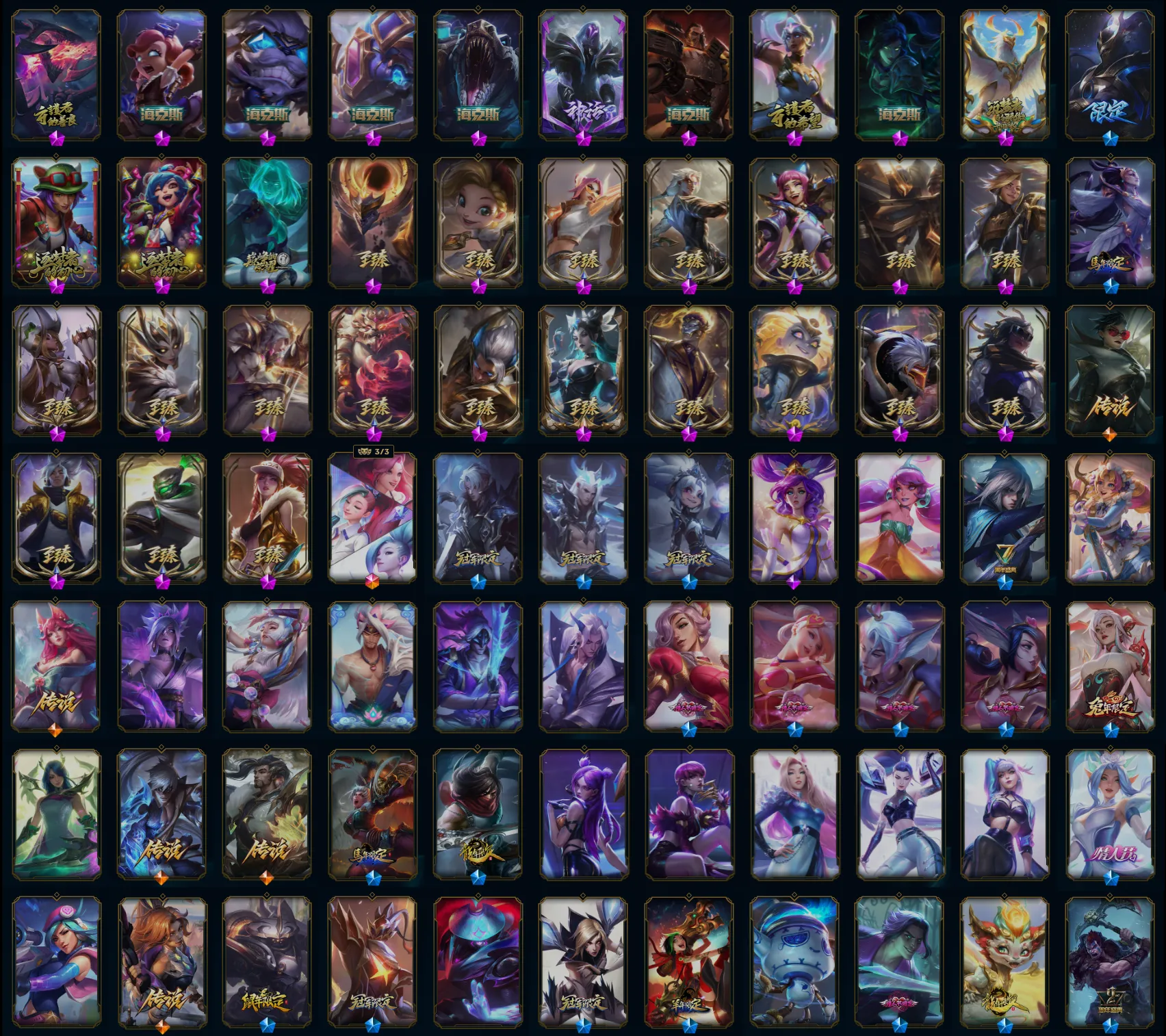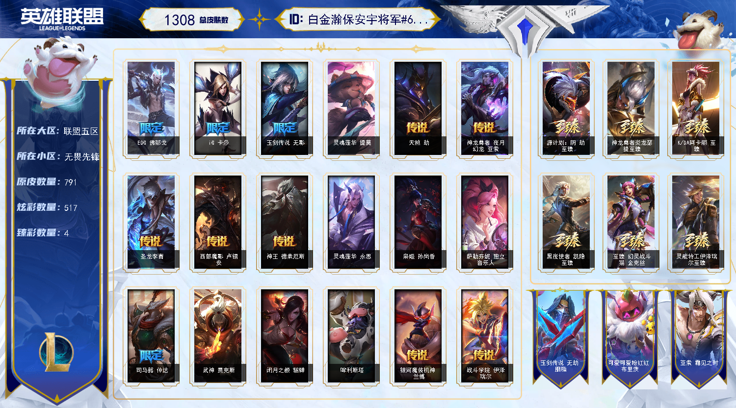【重要皮肤】机神玄武盖伦至臻 永恒星灵佐伊至臻 星之守护者辛德拉至臻 幻灵战斗猫金克丝至臻 女帝黛安娜至臻 魔女婕拉至臻 奥术师佐伊至臻 真实伤害亚索至臻 真实伤害赛娜至臻 灵能特工伊泽瑞尔至臻 福牛守护者菲奥娜至臻 源计划阴劫至臻 暗星墨菲特至臻 神龙尊者炎龙瑟提至臻 黑夜使者凯隐至臻 神龙尊者均衡之龙沃利贝尔至臻 征服者贾克斯至臻 焰执事布兰德至臻 KDA阿卡丽至臻 魅惑女巫厄运小姐至臻 灰烬骑士派克 海克斯科技安妮 海克斯科技雷克顿 海克斯科技克格莫 海克斯科技吉格斯 暗星科加斯 黎明使者卡尔玛 恐惧新星德莱厄斯 摄魂使者薇恩 胜利剑圣易 胜利之王泰达米尔 荣誉使者玛尔扎哈 养蜂人辛吉德 勇敢的心德莱厄斯 玉剑传说无影 海珀利安小队Y03权天使卡蜜尔 银龙裁决泰隆 天龙之子斯莫德 剪纸仙灵艾瑞莉娅 替父从军花木兰 神龙烈焰金克丝 你看见过我的熊猫吗安妮 南天之怒沃里克 美猴王孙悟空 定海神珍孙悟空 玉净夜叉凯特琳 紫金罗刹莫甘娜 广寒仙子嫦娥 司马懿仲达 福牛守护者德莱厄斯 胜利女神瑟庄妮 胜利枪神卢锡安 水晶玫瑰迦娜 碎心之拳蔚 甜心之羽霞 甜心之翎洛 甜心宝贝安妮 甜心宝贝娑娜 穿心之剑菲奥娜 觅心游侠卢锡安 觅心魔灵奥莉安娜 幽梦玫瑰泰隆 水晶玫瑰婕拉 北极星守望者佐伊 冬境仙灵索拉卡 寒冬精灵璐璐 雪球也能爆炸吉格斯 圣诞老人布隆 持胡萝卜的雪人易 狂心冰王图奇 夺命美人卡特琳娜 平安夜女神娑娜 圣诞糖果棒厄运小姐 魅惑女巫妮蔻 魅惑女巫迦娜 魅惑女巫崔丝塔娜 魅惑女巫奈德丽 魅惑女巫伊莉丝 伯爵卡萨丁 死亡誓约维克托 南瓜头王子阿木木 海之歌艾希 海之歌泽丽 泳池派对普朗克 泳池派对黑默丁格 泳池派对厄运小姐 泳池派对菲奥娜 泳池派对格雷福斯 泳池派对李青 泳池派对雷克顿 穿星魔锋赵信 创战纪希维尔 克格汪 制胜金靴李青 制胜金球拉莫斯 EDG厄斐琉斯 EDG佛耶戈 EDG佐伊 DWG凯南 DWG奈德丽 FPX锤石 FPX薇恩 FPX普朗克 iG洛 iG卡莎 SSG霞 SSG洛 SSG纳尔 SSG嘉文四世 SSG伊泽瑞尔 SKTT1艾克 SKTT1奥拉夫 SKTT1卡莉丝塔 SKTT1雷克顿 SSW泰隆 SSW图奇 SSW辛吉德 SKTT1贾克斯 SKTT1婕拉 SKTT1李青 SKTT1薇恩 暗杀星奥莉安娜 暗杀星努努和威朗普 暗杀星慎 Fnatic迦娜 Fnatic库奇 Fnatic古拉加斯 冰雪节辛吉德 防暴天使凯尔 冠军典狱长锤石 冠军掠夺者卡兹克 冠军之矛卡莉丝塔 冠军之血希瓦娜 春晖神女奇亚娜 鬼影森森茂凯 鬼影重重魔腾 海贼瑞兹 胡桃夹子萨科 警用试作体K9内瑟斯 密林猎手提莫 南瓜头费德提克 圣诞开心鬼提莫 圣诞狂欢基兰 圣诞狂欢努努和威朗普 圣诞老人古拉加斯 圣诞驯鹿克格莫 糖果使徒费德提克 无头骑士赫卡里姆 邪恶圣诞老人维迦 幸福女神乐芙兰 雪默丁格 雪装奈德丽 野兽猎人德莱文 野兽猎人泰达米尔 英勇玩具兵普朗克 勇者阿狸 征服者韦鲁斯 暗影沃里克 冠军之箭艾希 魅惑女巫菲奥娜 魅惑女巫辛德拉 战场BOSS吉格斯 2022全球总决赛阿兹尔 波比的巧克力工坊 地底世界崔斯特 都铎王朝图奇 十五周年纪念希维尔 十周年纪念安妮 源代码乐芙兰 神凰行者瑞羽圣凰艾尼维亚 机神白虎贾克斯 灵魂守卫乌迪尔 KDAALLOUT萨勒芬妮独立音乐人 KDAALLOUT萨勒芬妮明日新星 KDAALLOUT萨勒芬妮超级巨星