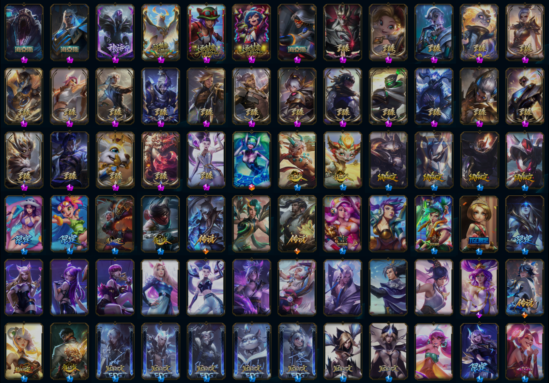 【传说皮肤】黎明使者锐雯 西部天使赛娜 星之守护者拉克丝 血石领主弗拉基米尔 提莫约德尔人的一大步 魔女伊芙琳 青花瓷伊泽瑞尔 合金巨兽努努和威朗普 泳池派对吉格斯 大天使长米迦勒凯尔 恶魔之刃泰达米尔 双重冰晶艾尼维亚 苍穹之光韦鲁斯 电玩女神娑娜 女主播迦娜 黑夜使者索拉卡 冰霜亚龙希瓦娜 战场女武神凯尔 神龙尊者昼日真龙亚索 神龙尊者夜月幻龙亚索 源计划泯灭雷克顿 霸天异形卡兹克 战斗学院凯特琳 陆地王者4WD布里茨 战斗学院伊泽瑞尔 铁哥们儿奥拉夫 黯黑魔龙希瓦娜 女警狙击凯特琳 冰霜之刃艾瑞莉娅 屠龙勇士潘森 欧米伽小队幽灵特工 暗星女王拉克丝 神龙尊者圣龙李青 最终BOSS维迦 驯龙炮手崔丝塔娜 炼狱魔犬内瑟斯 星之守护者霞 神王德莱厄斯 西部魔影卢锡安 源计划净化薇恩 枯萎之壤泽拉斯 暗星尊烬 烈焰雄心崔丝塔娜 律政大亨蒙多 黑夜使者亚索 约德尔国队长提莫 宇航员诺提勒斯 源计划联合艾希 未来战士凯特琳 女皇艾希