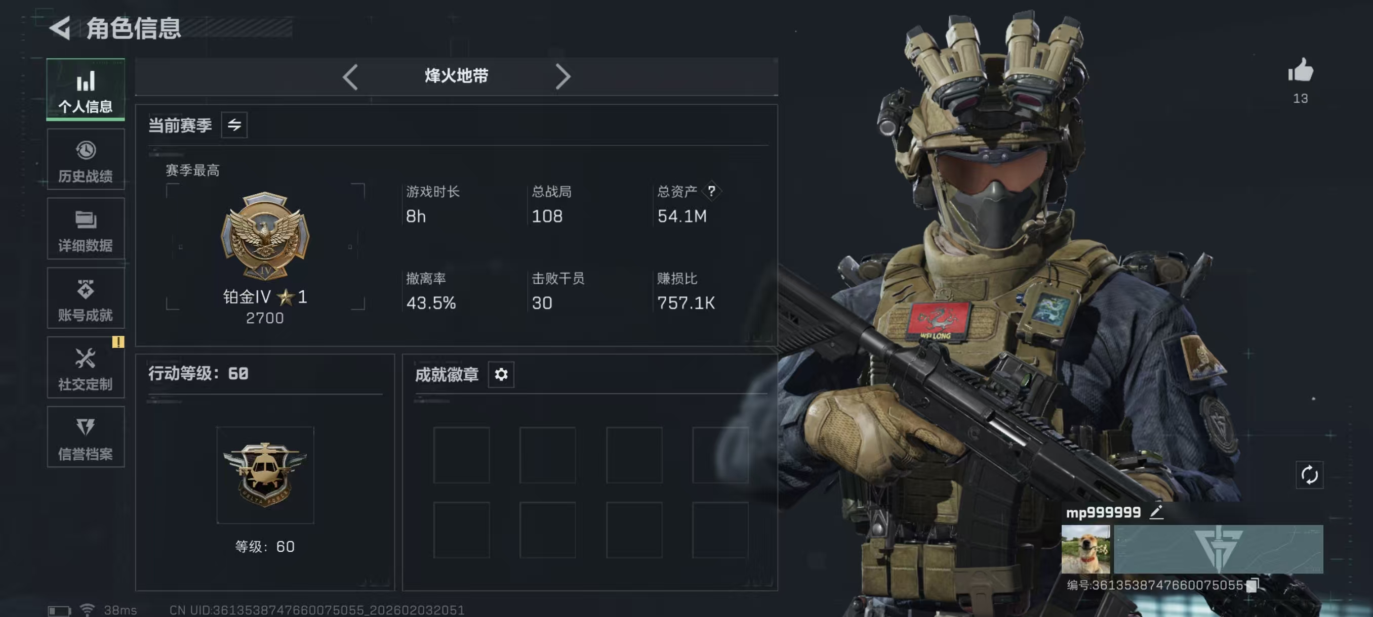 - 烽火地带段位: 铂金