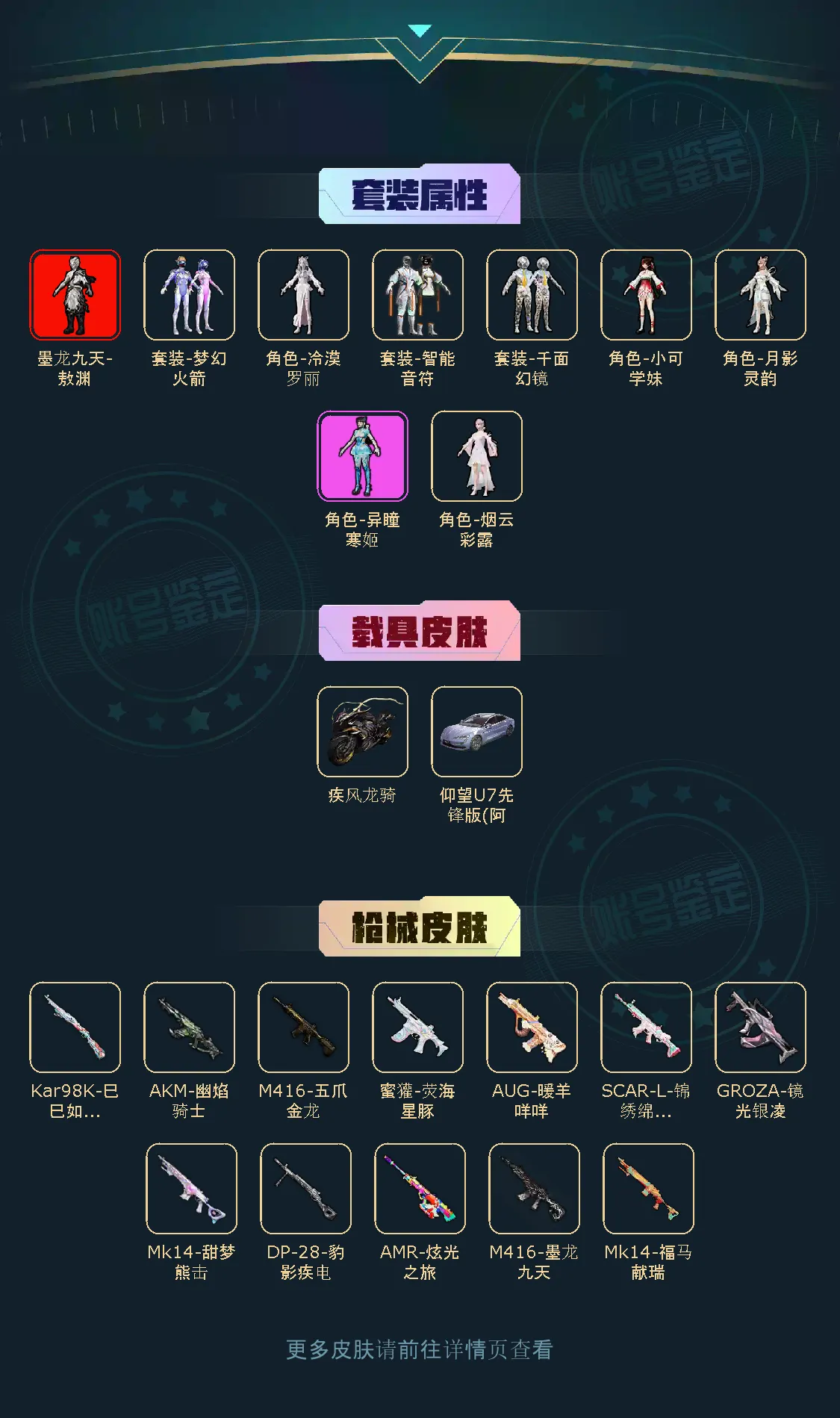 【稀有资产】墨龙九天-敖渊[2级]/M416-五爪金龙/AUG-暖羊咩咩/AKM-幽焰骑士/M416-墨龙九天/角色-Mark.06/套装-深海小丑鱼/套装-粉红小猪/套装-浪漫天命/套装-雪山精英/套装-暗影哥特/套装-龟仙人/套装-晶辉守护/套装-绒宝小鹅/玩偶服-憨乐熊二/角色-摩登魅猫/角色-俏兔智灵/角色-银尘/角色-冰公主/角色-情公主/角色-海琴烟