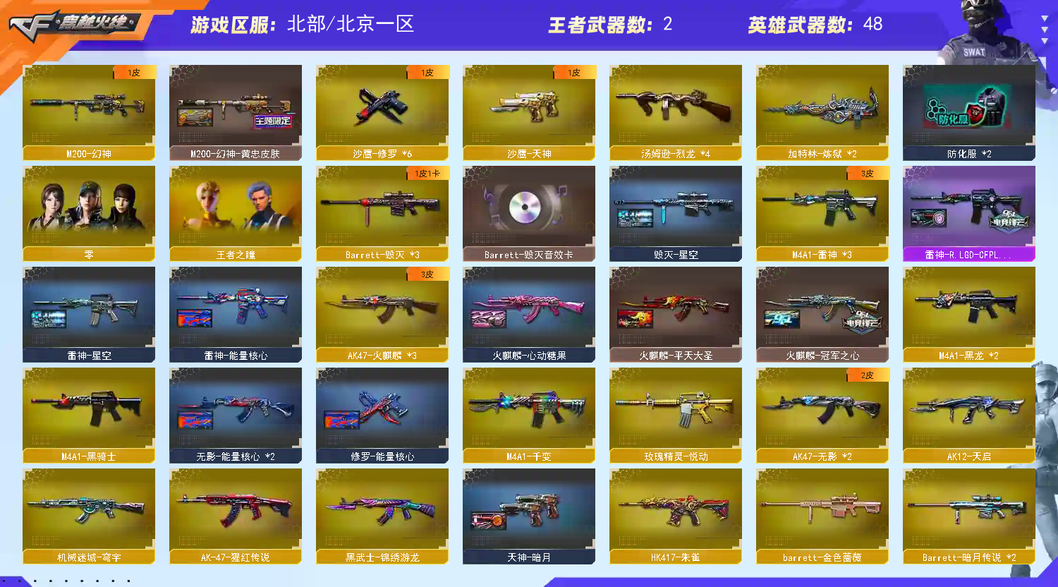 【M200幻神+幻神黄忠】【朱雀】【4烈龙+死亡之眼】【雷神LGD冠军+火麒麟冠军之心】【毁灭音效卡】【四防王者刀锋】【火麒麟+雷神+黑骑士+毁灭+炼狱】【火麒麟绝迹】【超级护目镜+炫彩背包】【工具钳+手雷包