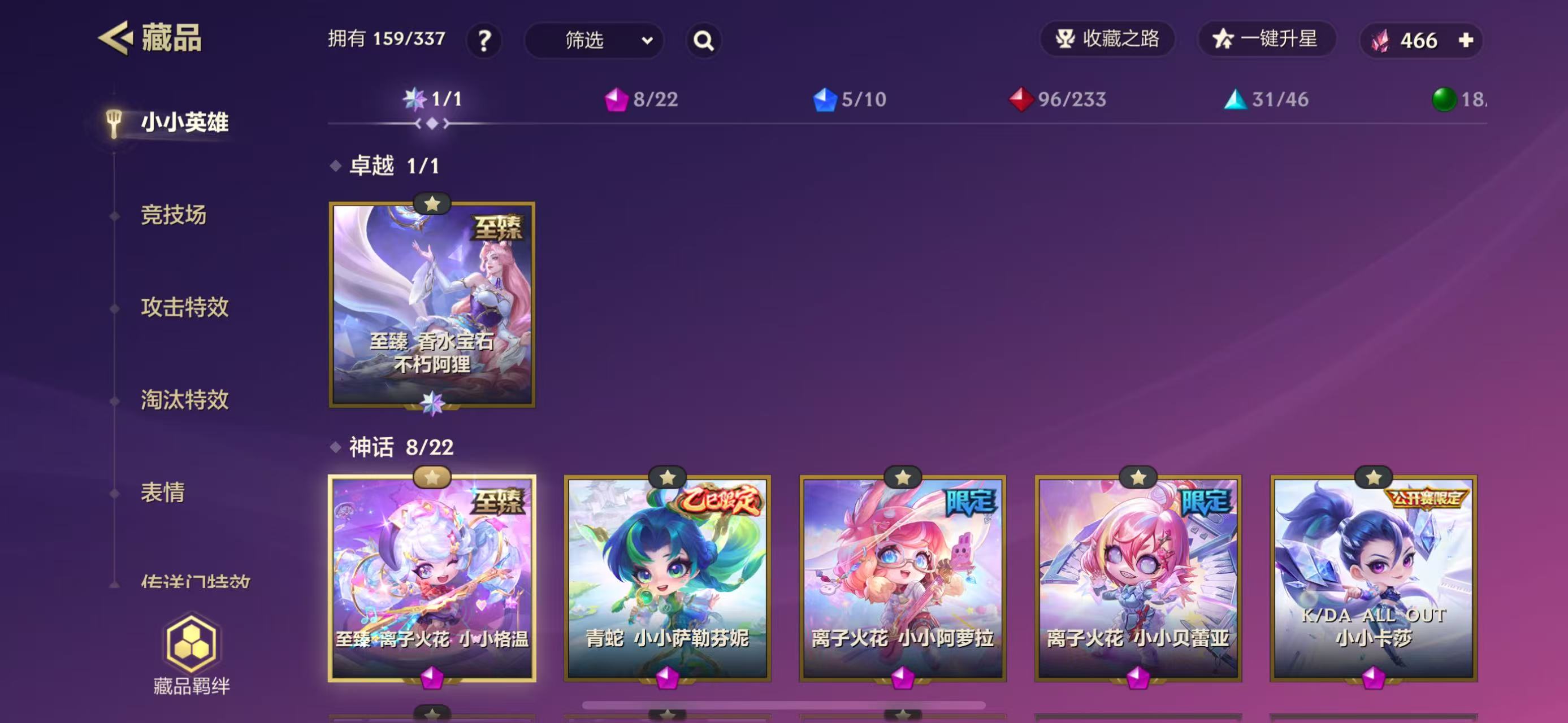 至臻香水宝石不朽阿狸离子火花小小格温小小阿罗拉小小贝蕾拉青蛇小小萨勒芬妮KDA小小卡莎神话多