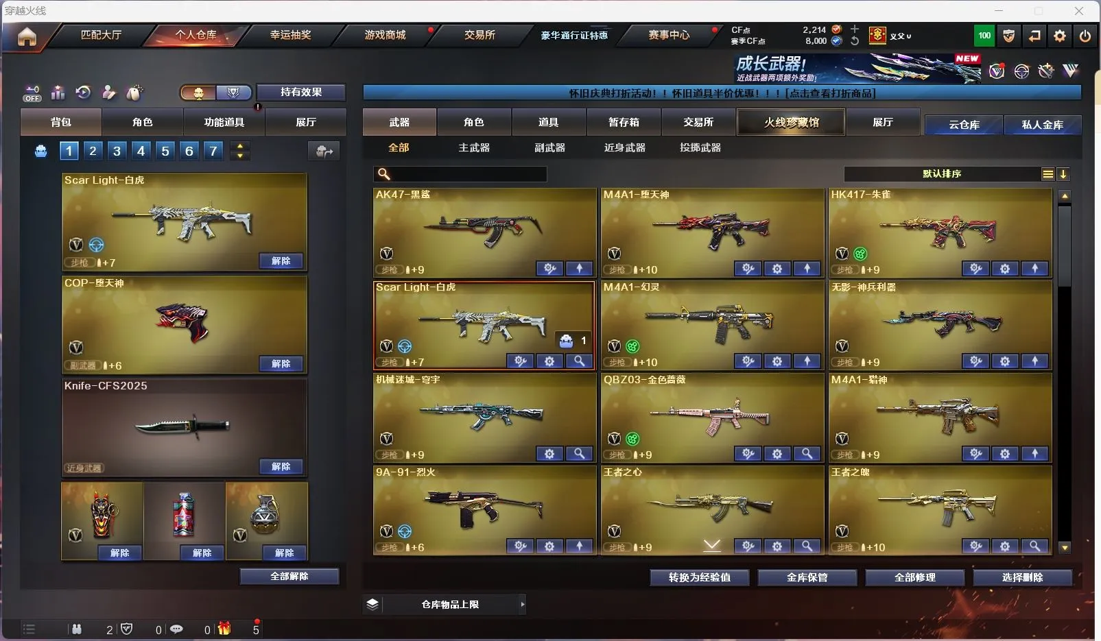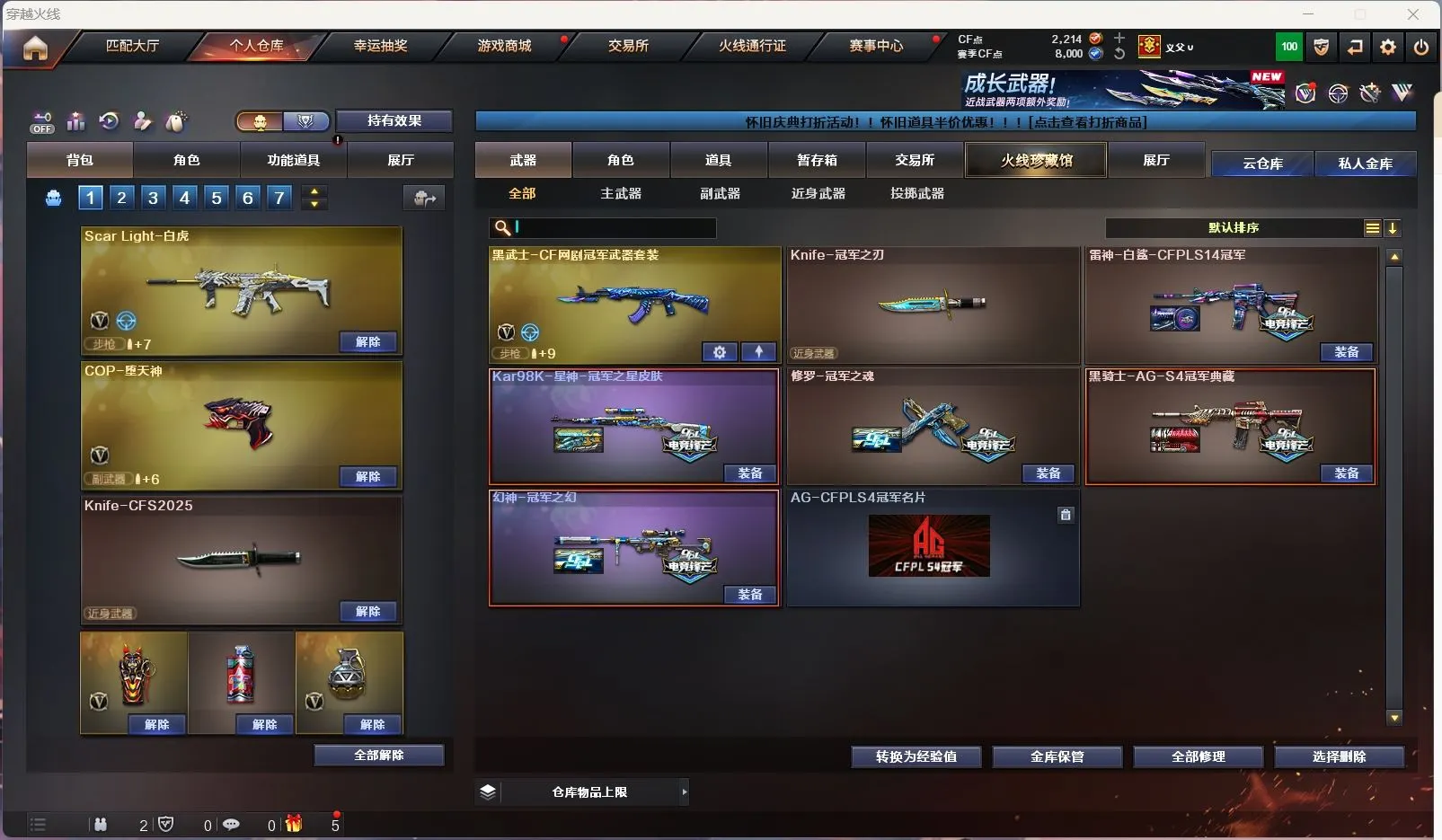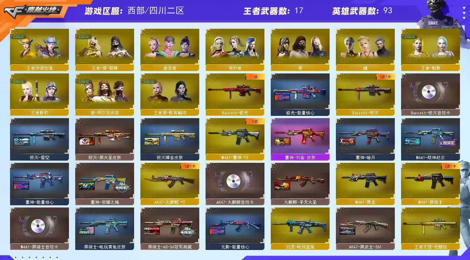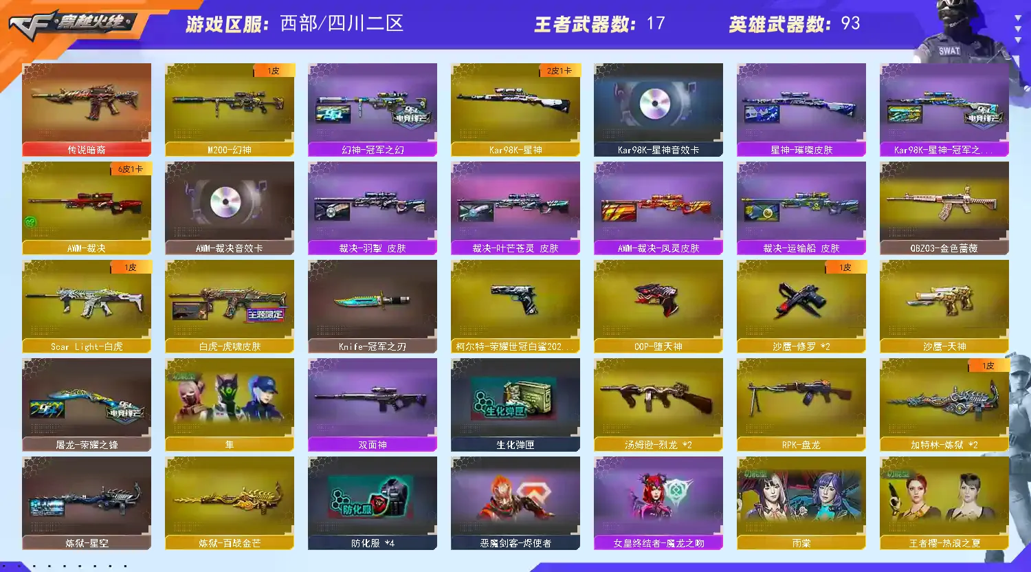 【亮点解析 星神三件套 裁决三件套 】【m200幻神+冠军之幻+冠军之刃】【98k星神+音效卡+冠军之星+璀璨】【王者星神 】【传说暗裔】【scar白虎+虎啸】【qbz金色蔷薇】【朱雀】【火麒麟+卡】【黑龙】【雷神+白鲨冠军+荣耀之魄】【黑骑士+卡】【毁灭+卡+cfs2018】【极光】【裁决 +卡+叶芒苍灵】【堕天神套】【武器: 堕天神 幻灵 王者之心 王者之魄 海王 荣耀世冠雷神 王者风势 白虎电玩 盘龙 炼狱*3 烈龙*3】【5手枪:修罗*2 天神 堕天神 柯尔特荣耀世冠白鲨】【12刀具:屠龙 龙啸 擎天 尼泊尔雷霆 堕天神 幻灵之峰 麒麟刺 荣耀世冠龙啸 】【7雷套:雷霆雷 堕天神雷*6】【小人枪:毁灭孙三炮】【音效卡:星神音效卡 裁决音效卡 火麒麟音效卡 毁灭音效卡 黑骑士音效卡 】【四防角色:雨棠 隼 王者葵貂蝉 王者魅影 王者葵惊若翩鸿 王者沙漠玫瑰 王者影豹 】