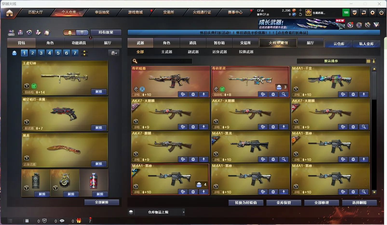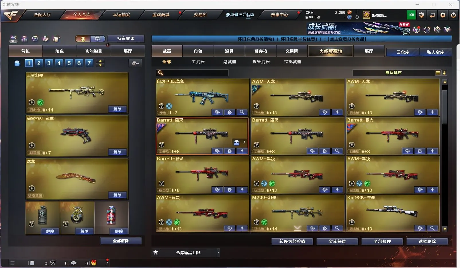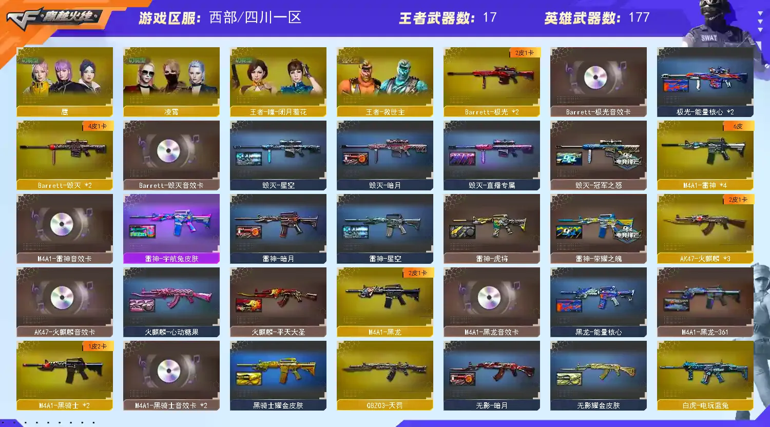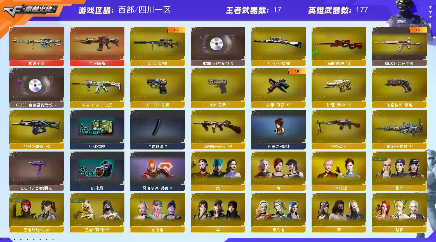 【m200幻神+音效卡+usp雷暴】【98k星神】【王者幻神 王者星神 】【传说暗裔 传说圣灵】【scar白虎】【qbz金色蔷薇+卡】【qbz天罚】【朱雀】【火麒麟+卡】【黑龙+卡】【雷神+卡+荣耀之魄】【黑骑士+卡】【毁灭+卡+ag15冠军+冠军之怒】【极光+卡】【裁决 】【雷暴套 夜魔套 】【武器:武圣 青龙 雷暴 夜魔 王者之心 王者之武 王者之魄 王者之势 王者之戮 王者之幻 王者之鲨 白虎电玩 盘龙 炼狱*2 烈龙*2】【12手枪:修罗*7 天神*2 武圣 雷暴 夜魔 幻灵】【24刀具:屠龙*3 龙啸 擎天 麒麟刺*7 尼泊尔雷霆 堕天神 幻灵之峰 斩神刀雷暴 夜魔 王者之啸 王者之击】【19雷套:雷暴雷*7 夜魔雷*7 幻灵雷*5】【小人枪:火麒麟绝迹 火麒麟灵狐 雷神小红 斯太尔蝴蝶 】【音效卡:毁灭音效卡 黑骑士音效卡 雷神音效卡 极光音效卡 黑龙音效卡 幻神音效卡 金色蔷薇音效卡 火麒麟音效卡 】【四防角色:王者葵貂蝉 王者瞳闭月羞花 王者玲珑小乔 职业经理 】