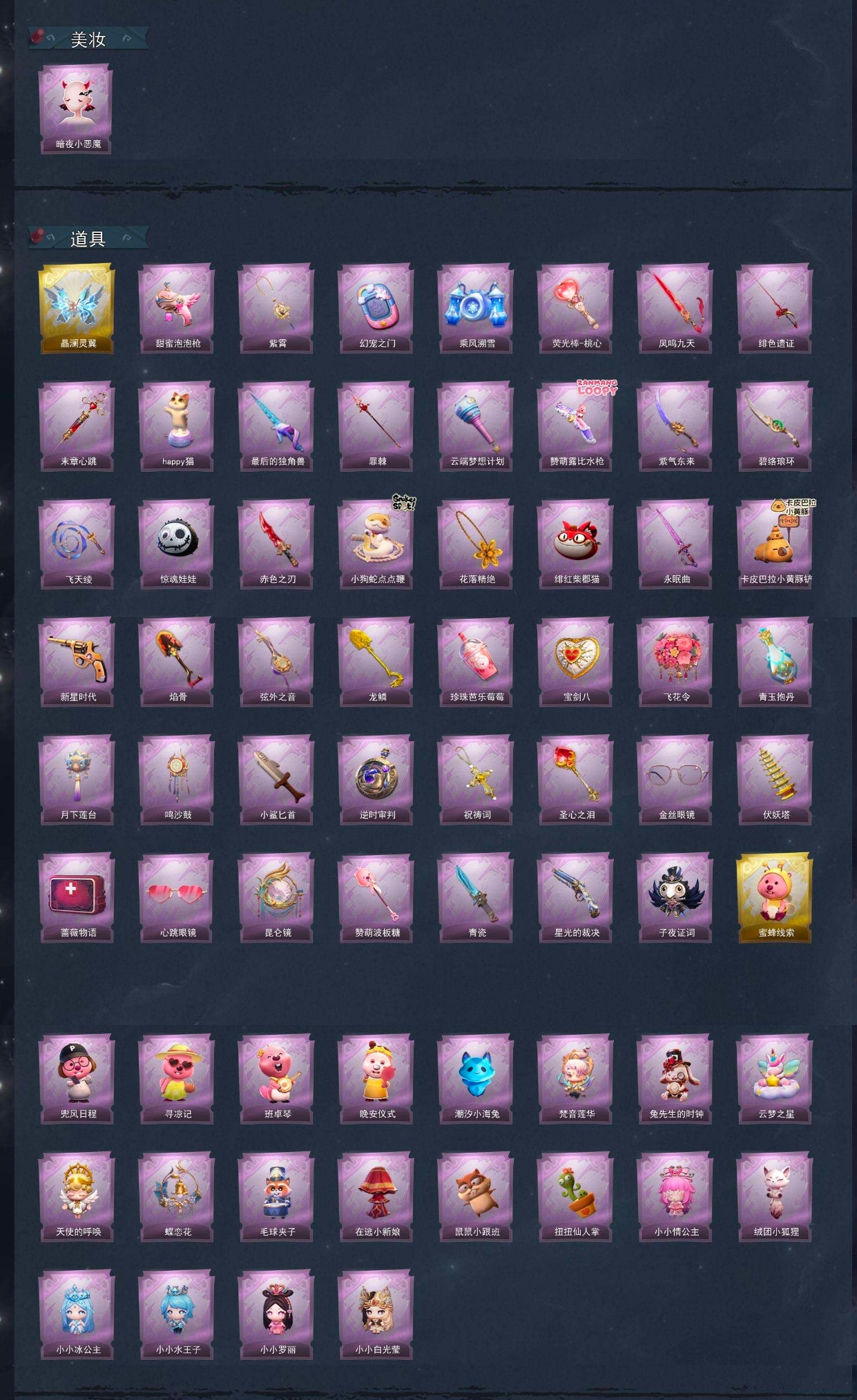 【道具皮肤】喷气背包-晶澜灵翼、电击枪-甜蜜泡泡枪、摸金符-紫霄、传送按钮-幻宠之门、喷气背包-乘风溯雪、桃木剑-凤鸣九天、桃木剑-绯色遗证、急救包-末章心跳、音响-happy猫、桃木剑-最后的独角兽、专业手电-云端梦想计划、短管猎枪-赞萌露比水枪、刺刀-紫气东来、刺刀-碧络琅环、长鞭-飞天绫、腰包-惊魂娃娃、刺刀-赤色之刃、长鞭-小狗蛇点点鞭、摸金符-花落精绝、腰包-绯红柴郡猫、桃木剑-永眠曲、铲子-卡皮巴拉小黄豚铲、转轮手枪-新星时代、铲子-焰骨、除颤仪-弦外之音、铲子-龙鳞、黄牛能量饮料-珍珠芭乐莓莓、腰包-宝剑八、额外的背包-飞花令、黄牛能量饮料-青玉抱丹、腰包-月下莲台、音响-鸣沙鼓、刺刀-小鲨匕首、传送按钮-逆时审判、摸金符-祝祷词、铲子-圣心之泪、夜视仪-金丝眼镜、葫芦-伏妖塔、急救包-蔷薇物语、夜视仪-心跳眼镜、传送按钮-昆仑镜、铲子-赞萌波板糖、刺刀-青瓷、短管猎枪-星光的裁决、背饰-子夜证词、背饰-蜜蜂线索、背饰-兜风日程、背饰-寻凉记、背饰-班卓琴、背饰-晚安仪式、背饰-潮汐小海兔、背饰-梵音莲华、背饰-兔先生的时钟、背饰-云梦之星、背饰-天使的呼唤、背饰-蝶恋花、背饰-毛球夹子、背饰-在逃小新娘、背饰-鼠鼠小跟班