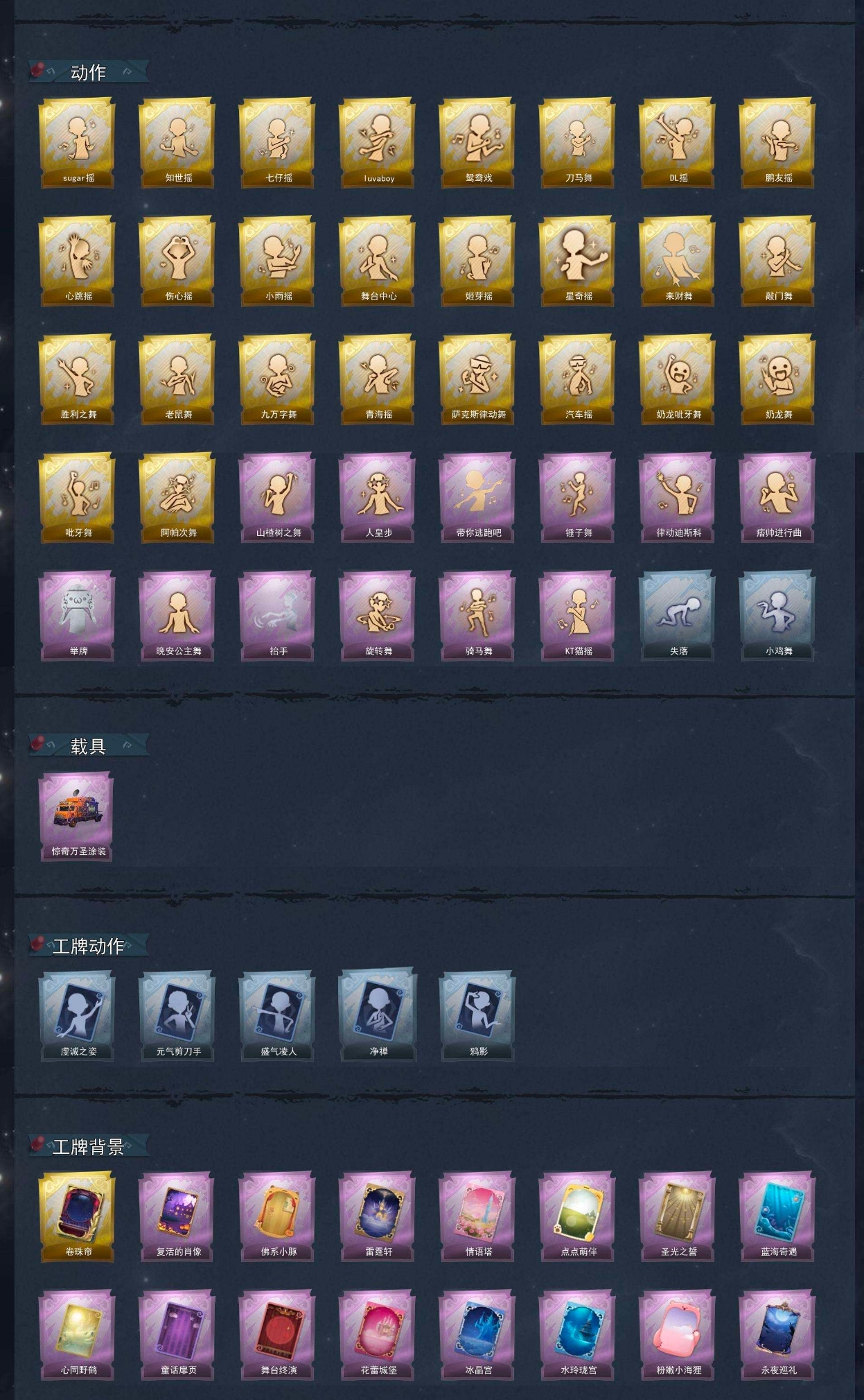 【动作】sugar摇、知世摇、七仔摇、luvaboy、鸳鸯戏、刀马舞、DL摇、鹏友摇、心跳摇、伤心摇、小雨摇、舞台中心、姬芽摇、星奇摇、来财舞、敲门舞、胜利之舞、老鼠舞、九万字舞、青海摇、萨克斯律动舞、汽车摇、奶龙呲牙舞、奶龙舞、吡牙舞、阿帕次舞、山楂树之舞、人皇步、带你逃跑吧、锤子舞、律动迪斯科、痞帅进行曲、举牌、晚安公主舞、抬手、旋转舞、骑马舞、KT猫摇、失落、小鸡舞