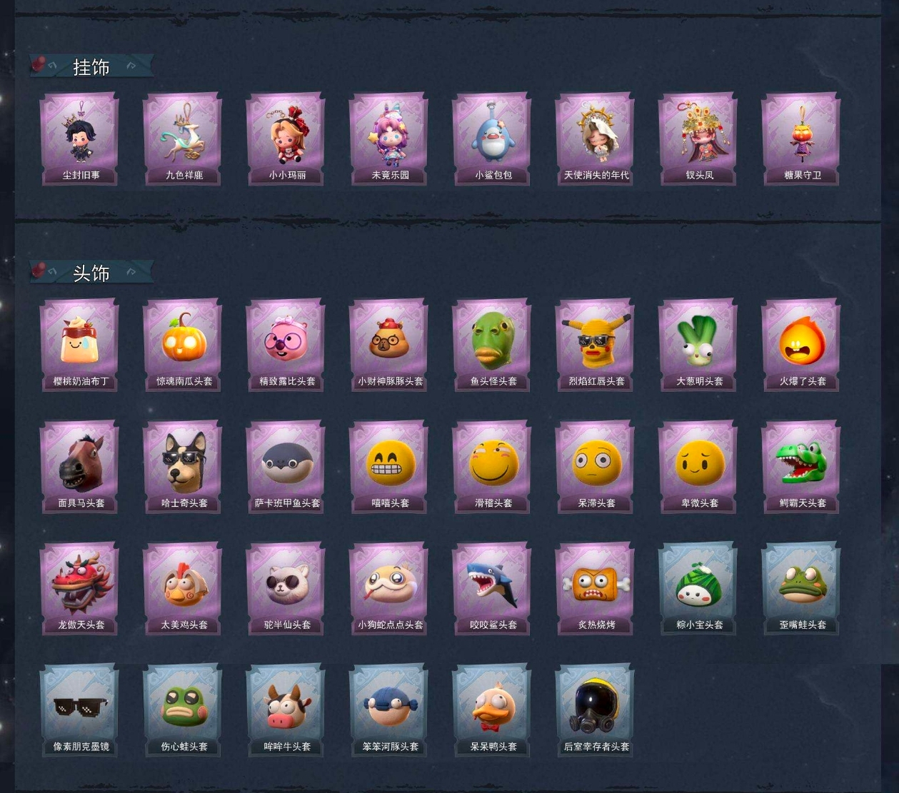 【头饰】樱桃奶油布丁、惊魂南瓜头套、精致露比头套、小财神豚豚头套、鱼头怪头套、烈焰红唇头套、大葱明头套、火爆了头套、面具马头套、哈士奇头套、萨卡班甲鱼头套、嘻嘻头套、滑稽头套、呆滞头套、卑微头套、鳄霸天头套、龙傲天头套、太美鸡头套、驼半仙头套、小狗蛇点点头套、咬咬鲨头套、炙热烧烤、粽小宝头套、歪嘴蛙头套、像素朋克墨镜、伤心蛙头套、哞哞牛头套、笨笨河豚头套、呆呆鸭头套、后室幸存者头套