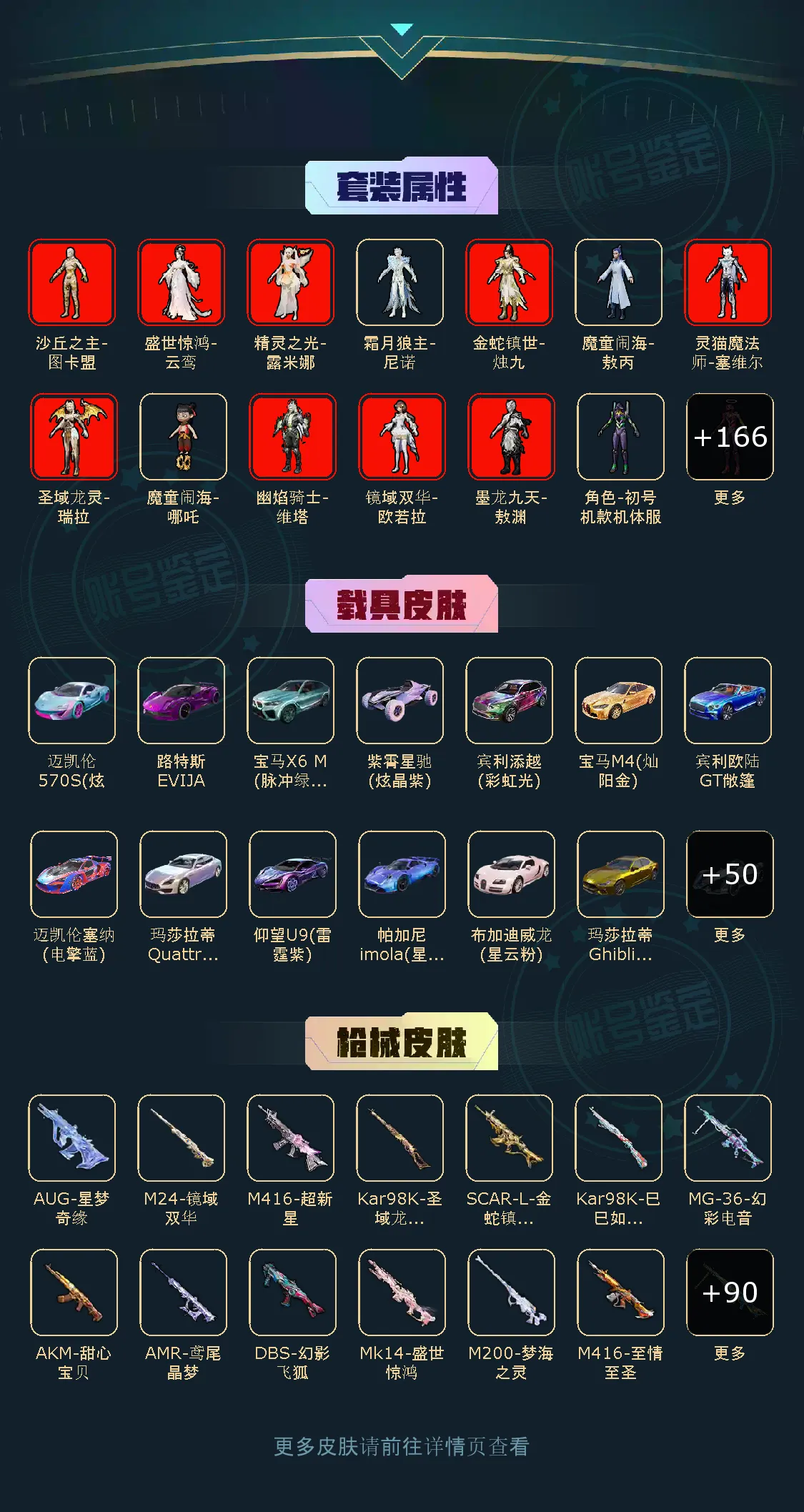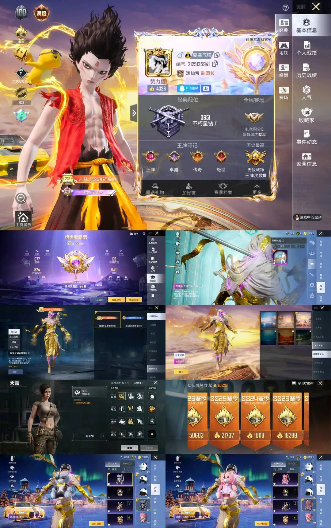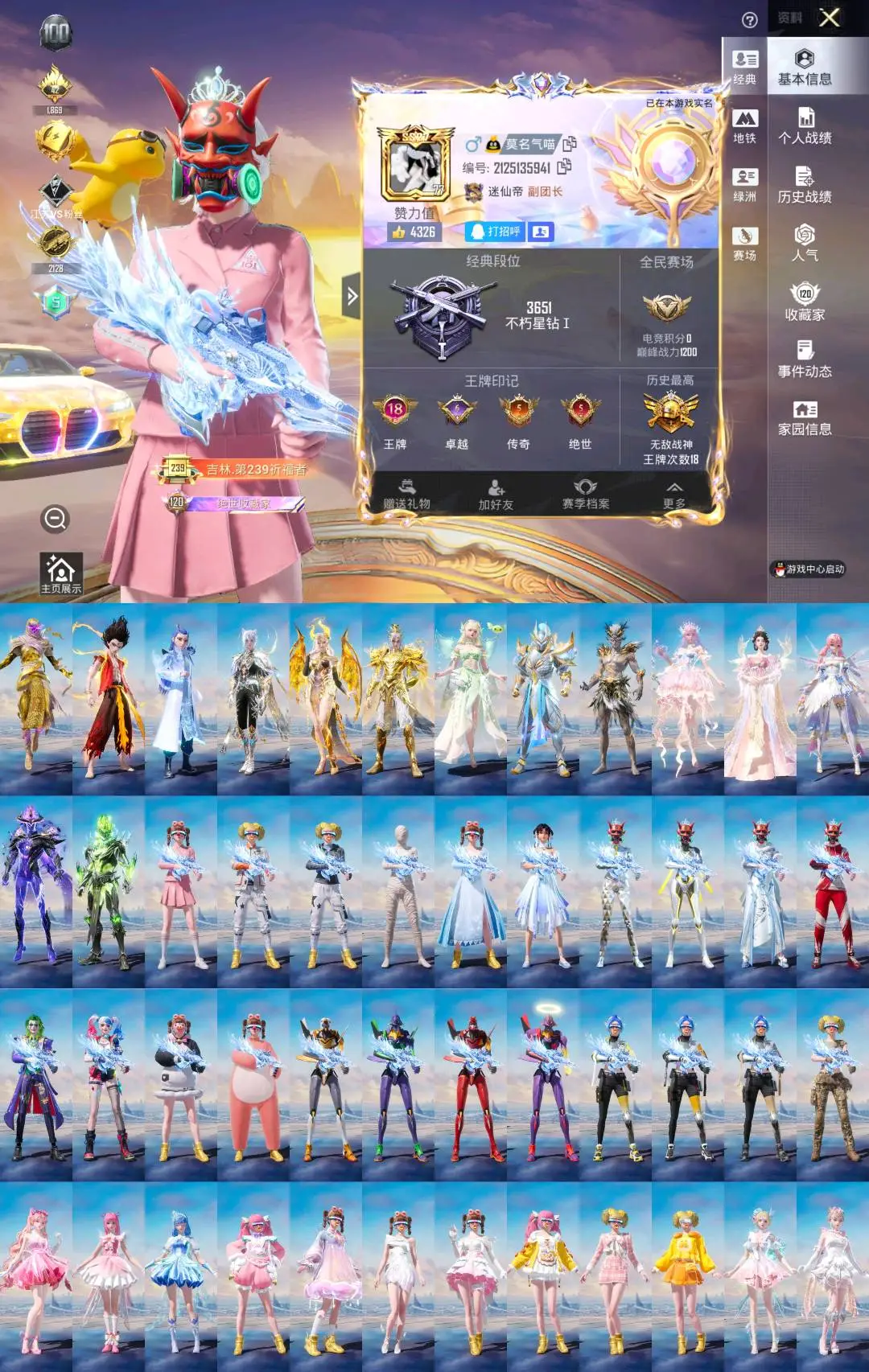 卓越王牌7星169粉,61载具,683套装,19王牌印记,无敌战神历史最高段,616671热力值 平底锅-仲夏莫吉托/平底锅-林间仙鹿/Famas-初号机 觉醒Ver./AKM-甜心宝贝/SCAR-L-梦幻火箭/SCAR-L-童趣迷兔/AUG-星梦奇缘/M416-风花雪月/AUG-星之彼岸/SCAR-L-甜梦小狐/M762-甜心娃娃/M762-电糖天使/GROZA-旋转彩虹/GROZA-香水柠檬/M416-暖熊萌萌/AKM-幽焰骑士/SCAR-L-天蓬元帅/Famas-觉醒初号机/M416-心之恋语/SCAR-L-纯梦嫁纱/GROZA-超新星/M16A4-葫芦兄弟/M416-五爪金龙/AKM-魔法神域/M16A4-垂柳戏鸭/AKM-炫紫旋律/AKM-白勺歌姬/GROZA-精灵之光/M416-墨龙九天/GROZA-焦糖拿铁/M762-冷魅冰骑/AKM-百合蜜语/M416-至情至圣/SCAR-L-时空协奏/SCAR-L-金蛇镇世/AUG-妙趣可丽/M762-甜蜜誓约/AUG-超新星/SCAR-L-机甲封神/M416-超新星/M16A4-晶梦幻蝶/AKM-梦之光华/SPAS-12-音爆索尼克/DBS-幻影飞狐/S12K-海渊国主/Mk14-盛世惊鸿/SKS-诡面斩/Mini14-荧光虫舞/Mk14-樱桃泡泡/SLR-暗夜玫瑰/VSS-烈焰拳霸/MK20-H-海螺星光/DP-28-扶摇飞仙/MG3-辉羽雀灵/DP-28-枪炮玫瑰/DP-28-幻梦音符/PKM-守护天翼/DP-28-金蝉行者/MG3-洛神天依/M249-古战神甲/MG-36-幻彩电音/M249-绒雪飘舞/M249-蓝莓炮弹/DP-28-豹影疾电/UZI-绮梦青鸾/P90-仙履奇缘/P90-电糖天使/汤姆逊-怪笑疯兔/Vector-红伞翩翩/P90-甜蜜草莓/P90-能量风暴/UMP45-宇宙意志/UMP45-雪国精灵/UMP45-相思残雪/UMP45-恐龙拽拽/野牛-流星咚咚/P90-沙丘之主/汤姆逊-冰川粉黛/UMP45-玉魂晶魄/P90-魔童闹海 敖丙/爆炸猎弓-雪梅暗香/燃点复合弓-时空协奏/烟雾弹-猫咪绅士/破片手榴弹-粉粉猫爪/AWM-璀璨巨星/Kar98K-伏魔团/Kar98K-圣域龙灵/AWM-花间之火/AWM-焰龙焚天/AMR-鸢尾晶梦/Kar98K-巳巳如意/Kar98K-创世·救赎/Kar98K-圣光天使/AWM-橘柚倾心/M24-镜域双华/AMR-炫光之旅/M200-玉鳞金羽/M200-梦海之灵/Kar98K-暗翼战神/M24-星之信仰/Kar98K-绿意幻情/玛莎拉蒂Ghibli(金)/玛莎拉蒂Ghibli(蓝)/兰博基尼Estoque(炫光金)/宝马M4(灿阳金)/玛莎拉蒂Quattroporte夜幕蓝/星河领航(炫晶粉)/天马凌跃(闪耀金)/玛莎拉蒂Quattroporte(幻星粉)/玛莎拉蒂Ghibli(粉)/虚妄之影(炫耀紫)/宾利欧陆GT敞篷(深空蓝)/萌喵橘座/越野奶龙龙/路特斯ELETRE(冰川蓝)/宝马X6 M(脉冲绿)/擎天重拳/宾利添越(彩虹光)/南瓜骑士/拉轰鸭鸭车/鬼马风驰/快艇-自由的鲸/快艇-塞莎KL27(霓虹粉)/快艇-瑞蒂奥Espera 34(宝石蓝)/特斯拉Cybertruck(极昼黑)/金龙耀世/灵鼠银迹/飞驰奶龙龙/Formula E Gen2(巅峰兰)/紫霄星驰(炫晶紫)/糖心拉力赛车(炫动紫)/羁绊之心/迈凯伦570S(炫冰蓝)/宝马i8(引力蓝)/路特斯EVIJA(电光紫)/仰望U9(雷霆紫)/布加迪威龙(星云粉)/宾利BATUR(星火红)/迈凯伦塞纳(电擎蓝)/帕加尼imola(星空蓝)/幽澜尊爵(静谧蓝)/兰博基尼SVJ(炫光金)/冰辰御座(钻石蓝)/暮色幽蹄/冰绡玉鳞/护世瑞兽/星梦玉骢/关羽赤兔马/赵云玉狮子马/黑曜夜骑/晶梦灵驹/照夜玉狮子/兰博基尼Aventador SVJ(炫光金)/疾风龙骑/杜卡迪 Panigale V4(星耀白)/辉羽雀灵自行车/双人摩托-梦幻火箭/圣光之翼(梦幻鎏光)/布尔玛摩托车/双人摩托-双刃魅影(红)/幽焰风驰摩托车/极速兔兔/盛世惊鸿摩托车/杜卡迪PanigaleV4(杜卡迪红)/