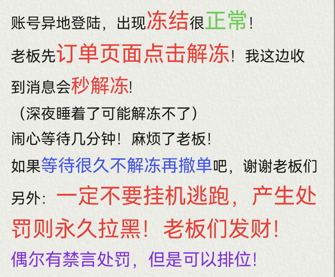 老板发财,若是游戏中异地冻结,请点击协助解除冻结,看到会立马解冻,可能会有一定延迟不要急着撤单 感谢!