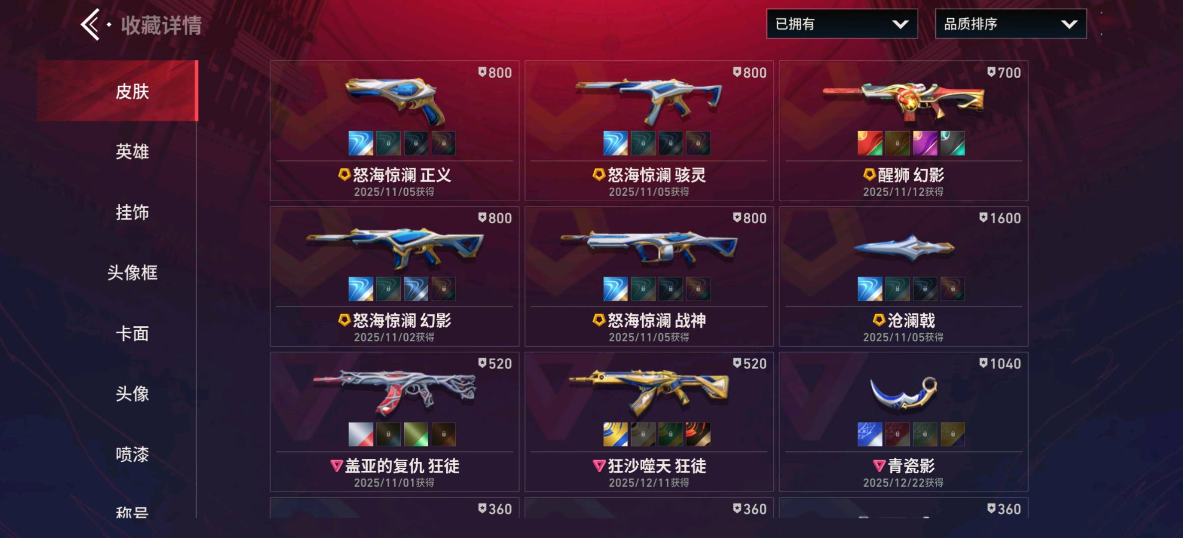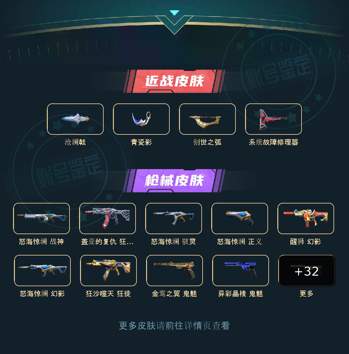封号必究!近战武器-沧澜戟,近战武器-青瓷影,近战武器-创世之弧; 【枪皮】:幻影-醒狮,幻影-怒海惊澜,正义-怒海惊澜,骇灵-怒海惊澜,战神-怒海惊澜,狂徒-狂沙噬天,狂徒-盖亚的复仇,獠犬-创世纪,冥驹-创世纪,冥驹-异彩晶棱,飞将-废土,正义-赛博奇兵,鬼魅-异彩晶棱,短炮-创世纪,骇灵-废土,骇灵-异彩晶棱,雄鹿-赛博奇兵,雄鹿-创世纪,战神-异彩晶棱,幻影-转换色调,幻影-航空材料,戍卫-航空材料,獠犬-转换色调,飞将-特战队眼镜蛇,飞将-时装,鬼魅-金鸾之翼,标配-金鸾之翼,短炮-转换色调,狂怒-航空材料,骇灵-航空材料,判官-特战队眼镜蛇,判官-金鸾之翼,奥丁-特战队眼镜蛇,战神-金鸾之翼;