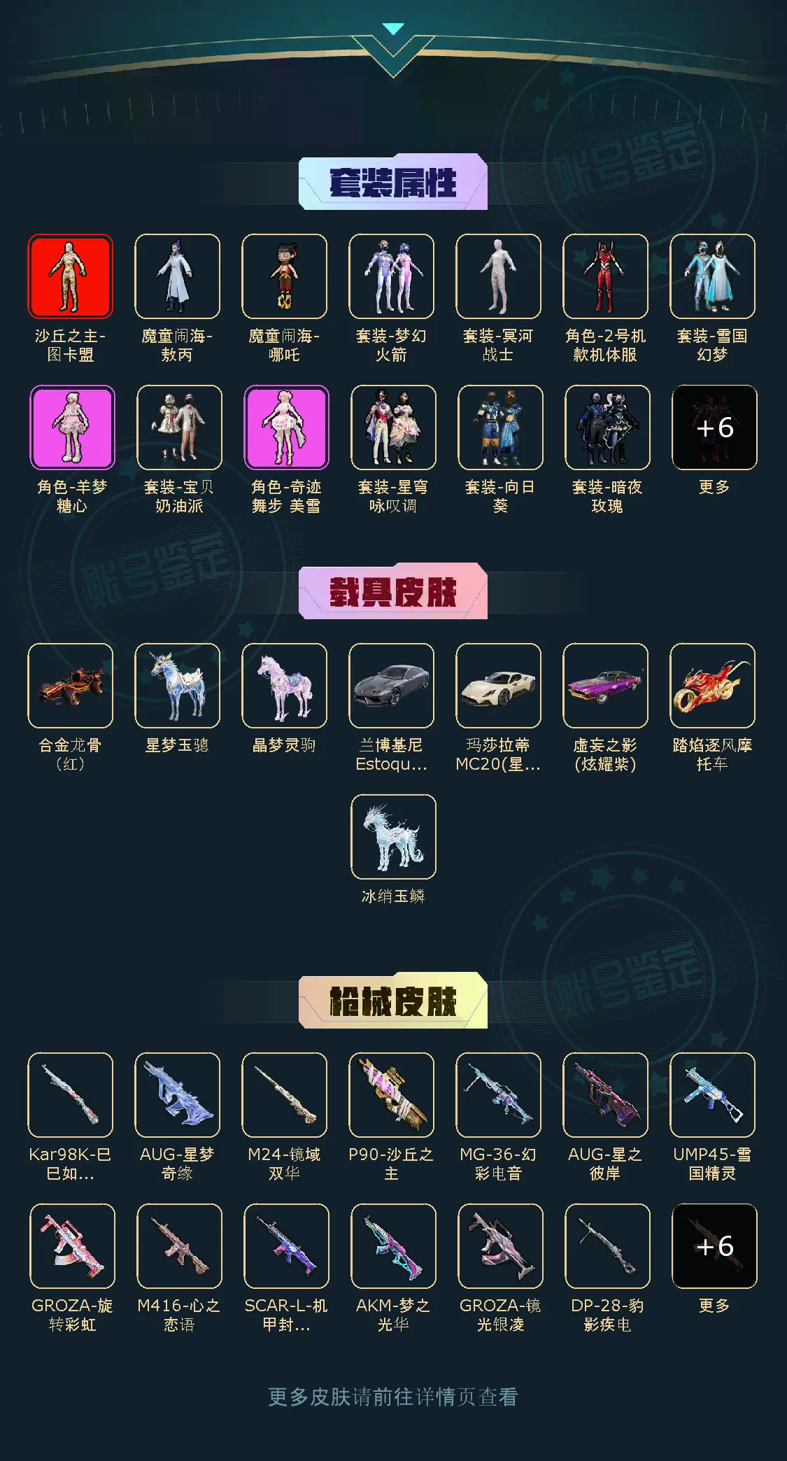 【稀有资产】沙丘之主-图卡盟[4级]/角色-魔童闹海-敖丙[2级]/角色-魔童闹海-哪吒[1级]/角色-2号机款机体服/套装-雪国幻梦/角色-千金淑猫/角色-羊梦糖心/M416-心之恋语/AUG-星之彼岸/AKM-梦之光华/AUG-星梦奇缘/M416-墨龙九天/SCAR-L-魔童闹海 哪吒/角色-零款战斗服/角色-真嗣款战斗服/熔岩游骑兵面罩/小恶魔头饰/木乃伊套装/套装-奇异狩猎者/套装-暗夜魅影/套装-粉红小猪/套装-浪漫天命/套装-雪山精英/套装-暗影哥特/套装-龟仙人/套装-晶辉守护/套装-绒宝小鹅/套装-净心行者/套装-狂沙舞者/套装-东方飞龙/角色-粉雾星云/角色-摩登魅猫/角色-许七安/角色-俏兔智灵/角色-海琴烟/信号枪-彩虹独角兽