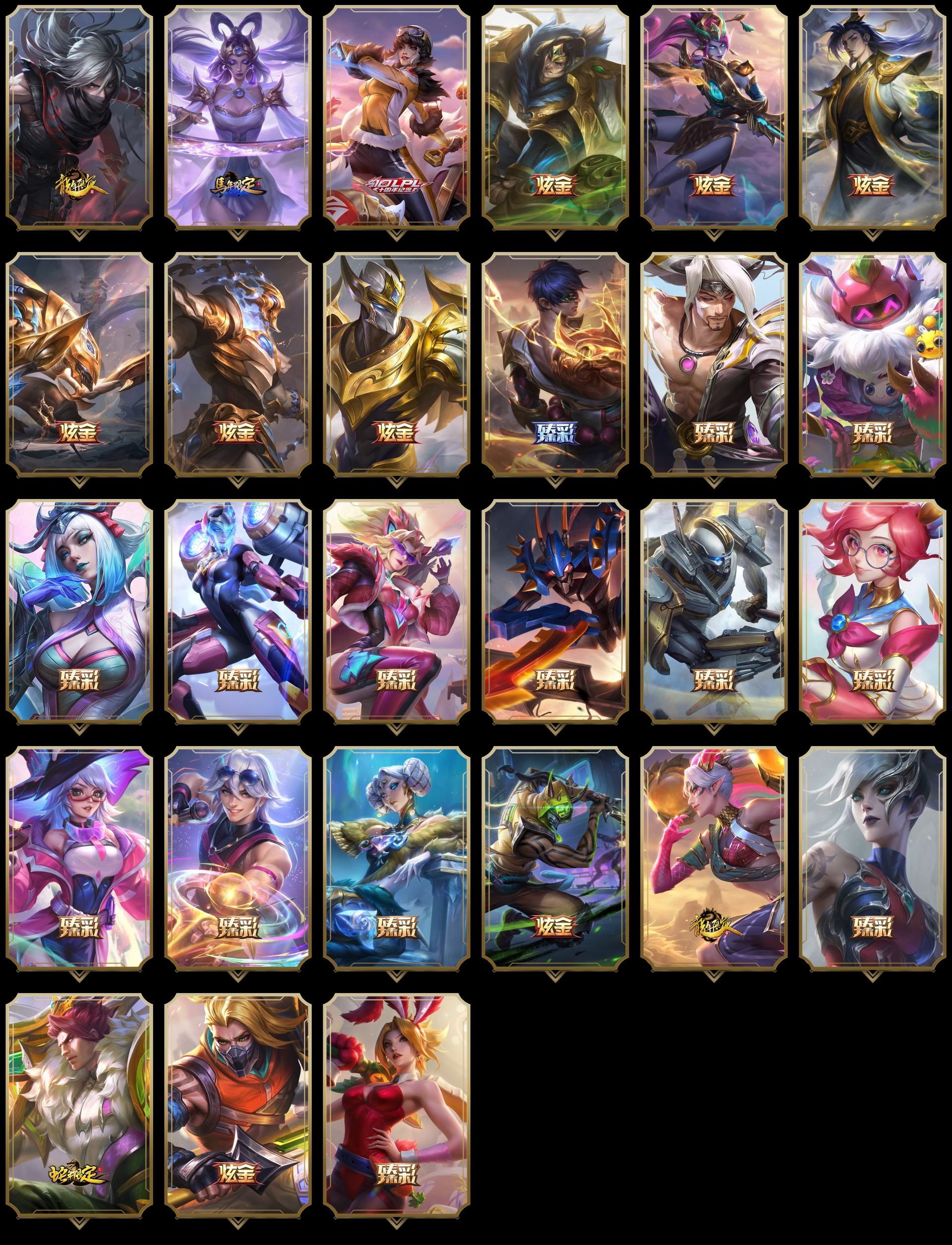 【重要皮肤】黑色玫瑰假面舞会卡特琳娜至臻 天龙之子伊泽瑞尔至臻 斗魂觉醒派克至臻 DRX亚托克斯至臻 至高天奎桑提至臻 战斗学院蕾欧娜至臻 太空律动璐璐至臻 魔女婕拉至臻 奥术师佐伊至臻 真实伤害亚索至臻 真实伤害赛娜至臻 福牛守护者菲奥娜至臻 源计划逆流塞拉斯至臻 黑夜使者凯隐至臻 征服者贾克斯至臻 KDA二代卡莎至臻 KDA一代卡莎至臻 KDA阿卡丽至臻 烈焰美人薇恩至臻 魅惑女巫厄运小姐至臻 绒毛菲兹至臻 玉剑传说武剑仙至臻 未来战士锤石至臻 黑夜使者李青至臻 海克斯科技安妮 海克斯科技克格莫 海克斯科技嘉文四世 新卧虎藏龙贾克斯 永恒之森奥恩 暗星科加斯 光明哨兵奥拉夫 黎明使者卡尔玛 零之枪骑赫卡里姆 摄魂使者薇恩 青年瑞兹 胜利女神希维尔 胜利巨口克格莫 哥特萝莉安妮 舞会公主安妮 创星之灵璐璐 钢铁军团拉克丝 养蜂人辛吉德 暗黑灵魂阿利斯塔 安妮梦游仙境 勇敢的心德莱厄斯 电玩女神厄运小姐 电玩勇者锐雯 电玩女神阿狸 玉剑传说无影 女帝厄运小姐 点心宝贝阿木木 龙的传人李青 银龙裁决泰隆 天龙之子斯莫德 替父从军花木兰 神龙烈焰金克丝 碧玉之牙卡西奥佩娅 古琴余韵娑娜 春晖神女拉克丝 你看见过我的熊猫吗安妮 北辰之威内瑟斯 南天之怒沃里克 美猴王孙悟空 定海神珍孙悟空 玉净夜叉凯特琳 紫金罗刹莫甘娜 广寒仙子嫦娥 虎痴之拳蔚 张辽文远 司马懿仲达 金猪烈焰瑟庄妮 烈焰美人薇恩 醒狮克格莫 神龙之翼库奇 福牛守护者安妮 胜利之树茂凯 胜利机器人布里茨 胜利枪神格雷福斯 胜利枪神卢锡安 胜利女神莫甘娜 胜利女神伊莉丝 甜心宝贝安妮 甜心宝贝娑娜 穿心之剑菲奥娜 觅心魔灵奥莉安娜 觅心女王艾希 觅心之翼奎因 冬境仙灵索拉卡 寒冬精灵璐璐 雪球也能爆炸吉格斯 圣诞捣蛋鬼金克丝 圣诞老人德莱文 持胡萝卜的雪人易 冰封王子蒙多 魄罗骑士瑟庄妮 夺命美人卡特琳娜 平安夜女神娑娜 圣诞糖果棒厄运小姐 魅惑女巫迦娜 魅惑女巫厄运小姐 魅惑女巫莫甘娜 魅惑女巫崔丝塔娜 魅惑女巫奈德丽 大魔法锅布里茨 死亡誓约劫 克烈古拉伯爵 泳池派对凯特琳 泳池派对塔莉垭 泳池派对厄运小姐 泳池派对塔里克 泳池派对格雷福斯 泳池派对李青 泳池派对蕾欧娜 泳池派对雷克顿 斩星魔剑易 穿星魔锋赵信 御星魔矢艾希 创战纪希维尔 送披萨的小姐姐希维尔 克格汪 DRX千珏 EDG佛耶戈 FPX薇恩 iG卡莎 iG艾瑞莉娅 iG乐芙兰 SSG霞 SSG洛 SSG纳尔 SSG塔莉垭 SKTT1扎克 SKTT1娜美 SKTT1艾克 SKTT1奥拉夫 SKTT1阿利斯塔 SKTT1卡莉丝塔 SKTT1瑞兹 SKTT1阿兹尔 SKTT1伊莉丝 SKTT1雷克顿 SSW锤石 SSW图奇 SSW辛吉德 SKTT1贾克斯 SKTT1劫 SKTT1婕拉 SKTT1李青 SKTT1薇恩 暗杀星奥莉安娜 暗杀星蒙多 暗杀星努努和威朗普 暗杀星伊泽瑞尔 暗杀星慎 Fnatic迦娜 Fnatic库奇 Fnatic古拉加斯 Fnatic嘉文四世 Fnatic卡尔萨斯 冰雪节格雷福斯 冰雪节玛尔扎哈 冰雪节辛吉德 冰雪兽纳尔 防暴机器人布里茨 防暴士兵格雷福斯 防暴士兵辛吉德 防暴天使凯尔 钢铁之翼艾尼维亚 冠军典狱长锤石 冠军掠夺者卡兹克 冠军之矛卡莉丝塔 冠军之刃锐雯2016 冠军之血希瓦娜 冠军之隐劫 冠军之志瑞兹 鬼影森森茂凯 鬼影重重魔腾 海贼瑞兹 红桃杰克崔斯特 胡桃夹子萨科 惊悚派对阿木木 惊悚派对费德提克 警用试作体K9内瑟斯 蓝色忧郁崔斯特 蒙多蒙多 密林猎手提莫 南瓜头费德提克 女猎手希维尔 圣诞精灵崔丝塔娜 圣诞开心鬼提莫 圣诞狂欢基兰 圣诞狂欢努努和威朗普 圣诞老人古拉加斯 圣诞玩偶波比 圣诞驯鹿克格莫 糖果使徒费德提克 外星装甲库奇 卧虎藏龙贾克斯 无头骑士赫卡里姆 喜庆之树茂凯 邪恶圣诞老人维迦 幸福女神乐芙兰 雪默丁格 雪装奈德丽 野兽猎人德莱文 野兽猎人瑟庄妮 野兽猎人泰达米尔 英勇玩具兵普朗克 勇者阿狸 勇者奈德丽 征服者阿利斯塔 征服者卡尔玛 征服者韦鲁斯 暗影沃里克 冠军之箭艾希 机械迷城加里奥 诺斯费拉图弗拉基米尔 阿木木主人不要我了 2021全球总决赛嘉文四世 波比的巧克力工坊 地底世界崔斯特 都铎王朝图奇 十五周年纪念希维尔 十周年纪念安妮 源代码乐芙兰 机神白虎贾克斯 机神苍狼瑟提 机神青龙德莱文 机神玄武盖伦 暗裔英雄盖伦 灵魂守卫乌迪尔 魔女娜美