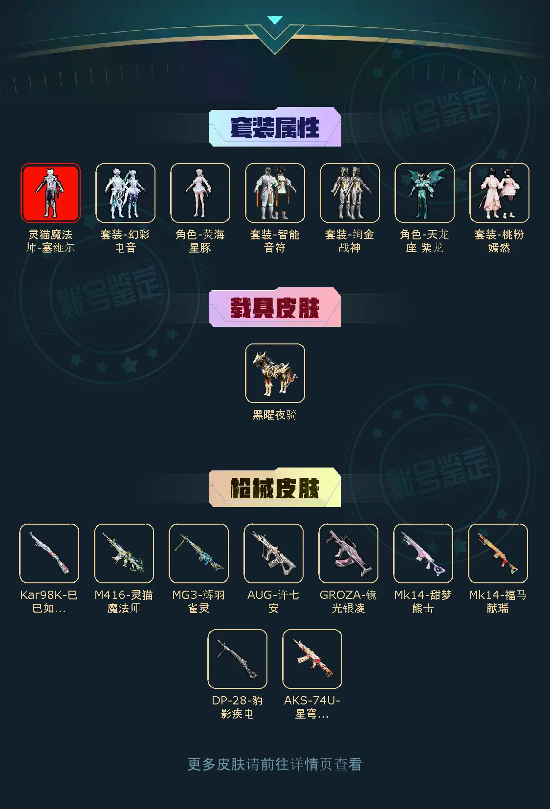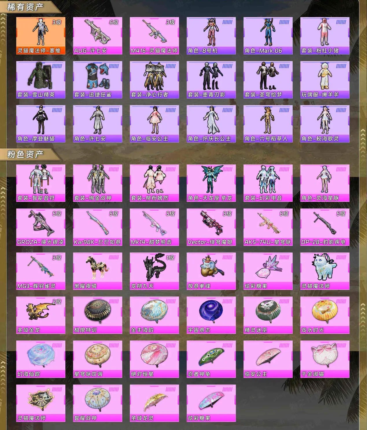 【稀有资产】灵猫魔法师-塞维尔[3级]/AUG-许七安/M416-灵猫魔法师/角色-8号机/角色-Mark.06/套装-粉红小猪/套装-雪山精英/套装-迅捷狂鲨/套装-净心行者/套装-墨青刃影/套装-圣穹绘梦/玩偶服-懒羊羊/角色-摩登魅猫/角色-许七安/角色-临安公主/角色-怀庆长公主/角色-六号稻草人/角色-鲛海歌灵