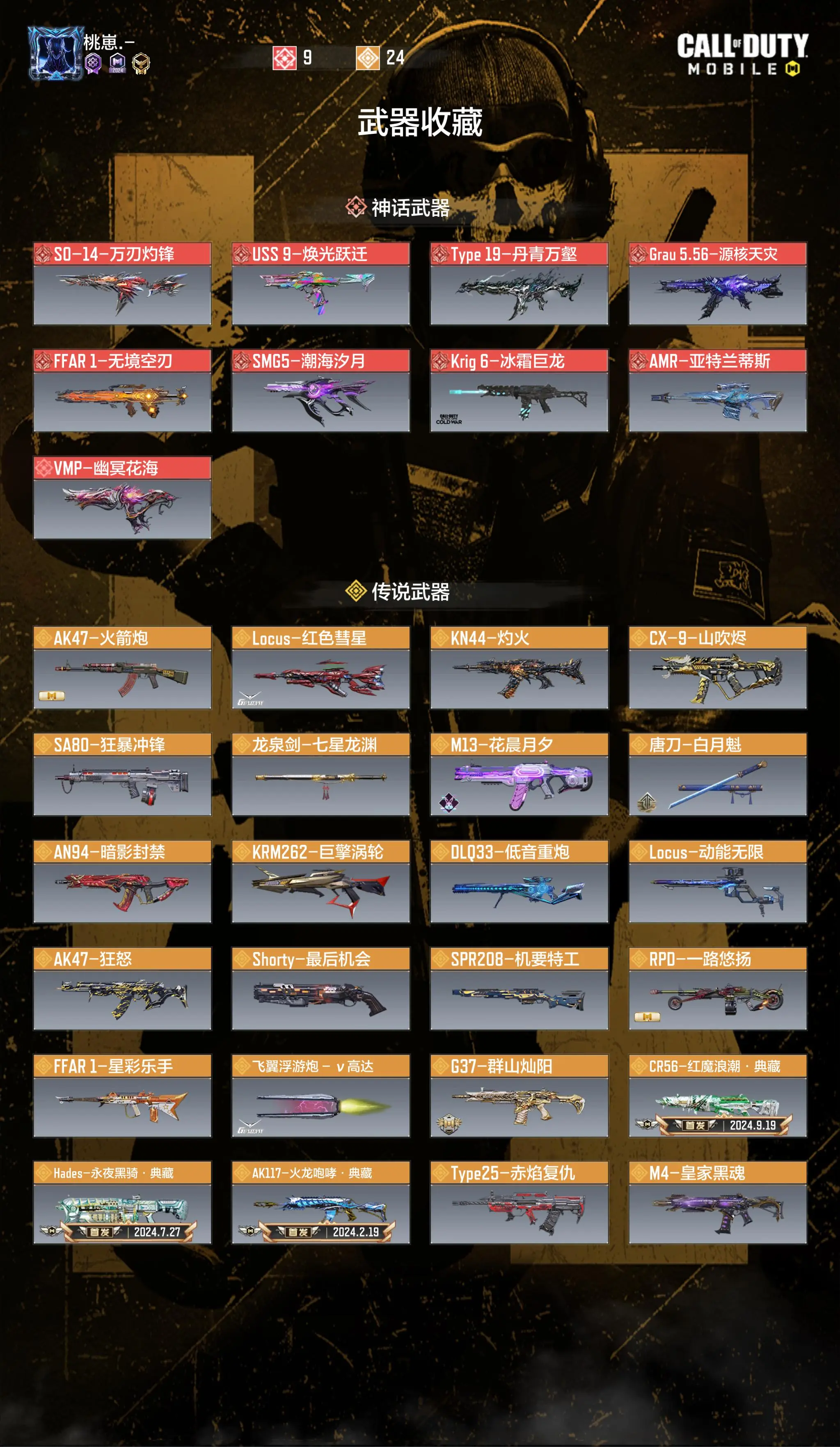 AK47-火箭炮 Locus-红色彗星 KN44-灼火 CX-9-山吹烬 SA80-狂暴冲锋 龙泉剑-七星龙渊 M13-花晨月夕 唐刀-白月魁 AN94-暗影封禁 KRM262-巨擎涡轮 DLQ33-低音重炮 Locus-动能无限 AK47-狂怒 Shorty-最后机会 SPR208-机要特工 RPD-一路悠扬 FFAR1-星彩乐手 飞翼浮游炮-v高达 G37-群山灿阳 CR56-红魔浪潮·典藏 Hades-永夜黑骑·典藏 AK117-火龙咆哮·典藏 Type25-赤焰复仇 M4-皇家黑魂