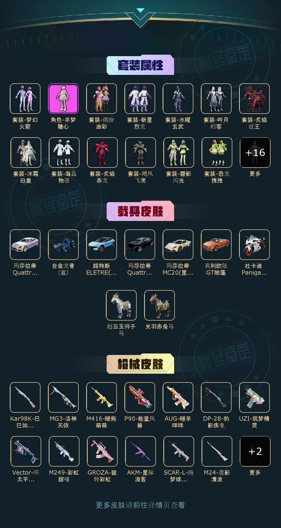 【稀有资产】玛莎拉蒂Quattroporte(幻星粉)[3级]/套装-彩虹甜喵/角色-羊梦糖心/套装-缤纷油彩/AUG-暖羊咩咩/M416-暖熊萌萌/M416-五爪金龙/套装-深海小丑鱼/套装-胖达圆圆/套装-暗影哥特/套装-龟仙人/套装-迅捷狂鲨/套装-恶魔人蛛/玩偶服-卖崽青蛙/角色-2B战斗服款/角色-俏兔智灵/角色-银尘/大砍刀-青龙偃月刀/撬棍-龙胆亮银枪