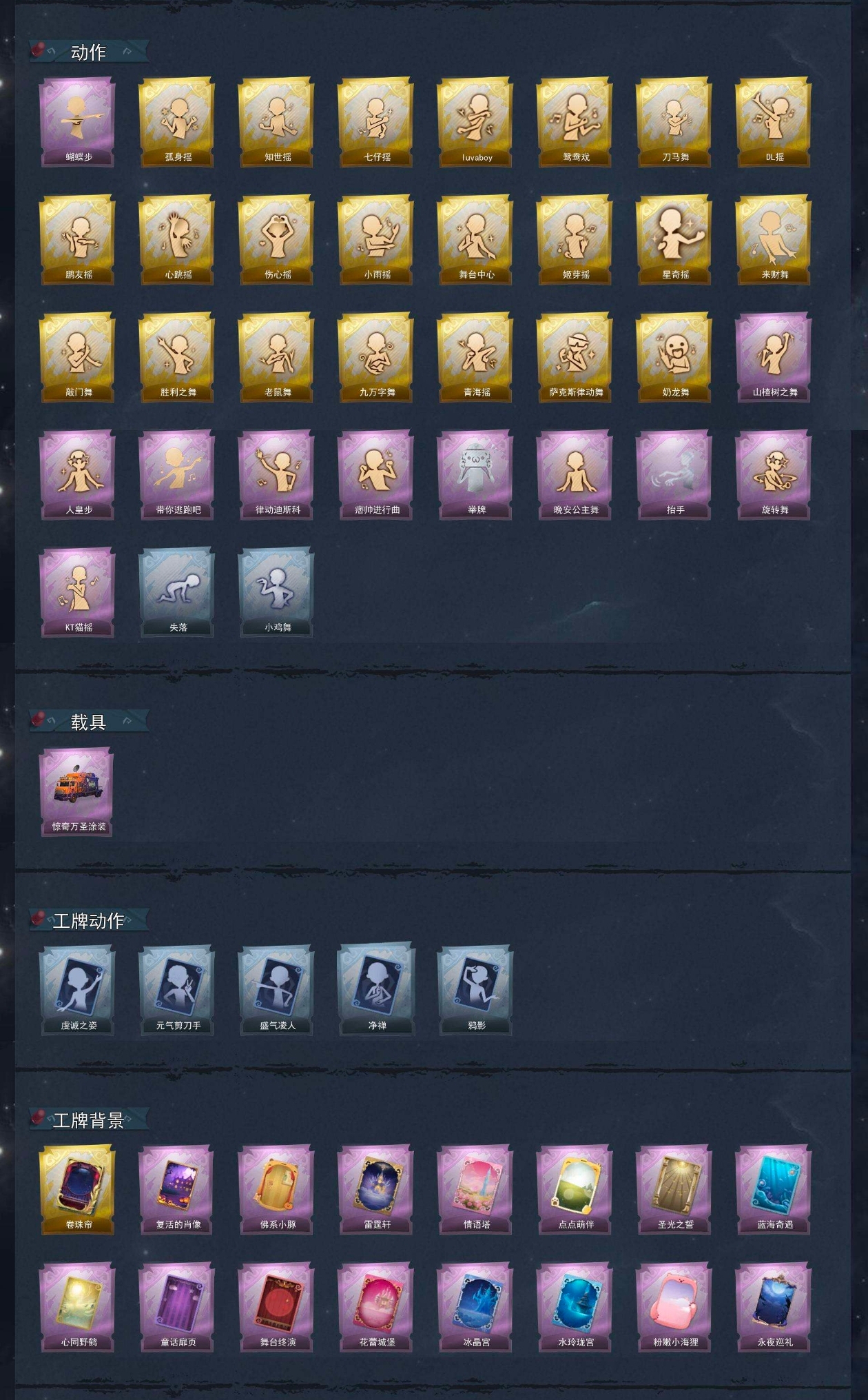 【道具皮肤】喷气背包-晶澜灵翼、腰包-私藏的银河、刺刀-赤色之刃、黄牛能量饮料-青玉抱丹、腰包-绯红柴郡猫、刺刀-碧络琅环、短管猎枪-星光的裁决、转轮手枪-新星时代、传送按钮-逆时审判、刺刀-紫气东来、急救包-末章心跳、铲子-龙鳞、铲子-焰骨、音响-鸣沙鼓、黄牛能量饮料-雪顶奇愿、音响-happy猫、除颤仪-弦外之音、摸金符-紫霄、腰包-惊魂娃娃、黄牛能量饮料-珍珠芭乐莓莓、喷气背包-乘风溯雪、腰包-宝剑八、额外的背包-飞花令、桃木剑-永眠曲、夜视仪-金丝眼镜、专业手电-云端梦想计划、夜视仪-心跳眼镜、电击枪-甜蜜泡泡枪、腰包-月下莲台、音响-冬夜暖忆、铲子-赞萌波板糖、葫芦-伏妖塔、摸金符-花落精绝、传送按钮-幻宠之门、专业手电-星寂、摸金符-祝祷词、急救包-蔷薇物语、桃木剑-最后的独角兽、桃木剑-绯色遗证、铲子-卡皮巴拉小黄豚铲、刺刀-小鲨匕首、传送按钮-昆仑镜、长鞭-缚誓之锁、短管猎枪-赞萌露比水枪、长鞭-小狗蛇点点鞭、桃木剑-凤鸣九天、长鞭-飞天绫、铲子-圣心之泪、背饰-子夜证词、背饰-蜜蜂线索、背饰-兜风日程、背饰-寻凉记、背饰-班卓琴、背饰-晚安仪式、背饰-白鼬趴趴、背饰-潮汐小海兔、背饰-梵音莲华、背饰-兔先生的时钟、背饰-云梦之星、背饰-天使的呼唤、背饰-蝶恋花、背饰-毛球夹子、背饰-在逃小新娘、背饰-鼠鼠小跟班