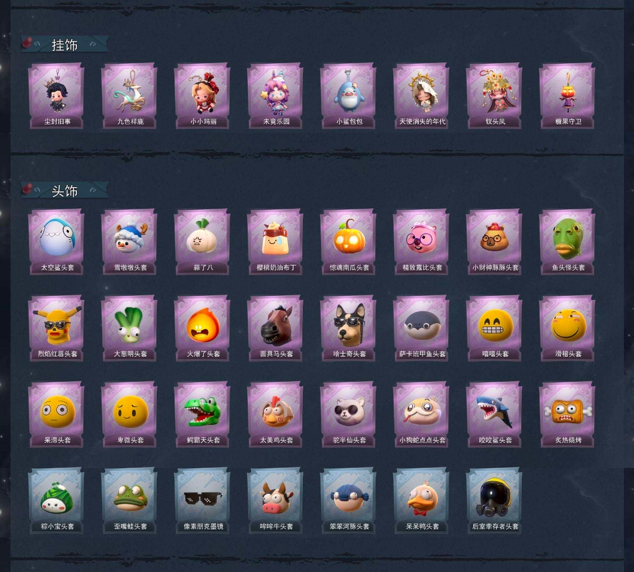 【头饰】太空鲨头套、雪墩墩头套、蒜了八、樱桃奶油布丁、惊魂南瓜头套、精致露比头套、小财神豚豚头套、鱼头怪头套、烈焰红唇头套、大葱明头套、火爆了头套、面具马头套、哈士奇头套、萨卡班甲鱼头套、嘻嘻头套、滑稽头套、呆滞头套、卑微头套、鳄霸天头套、太美鸡头套、驼半仙头套、小狗蛇点点头套、咬咬鲨头套、炙热烧烤、粽小宝头套、歪嘴蛙头套、像素朋克墨镜、哞哞牛头套、笨笨河豚头套、呆呆鸭头套、后室幸存者头套