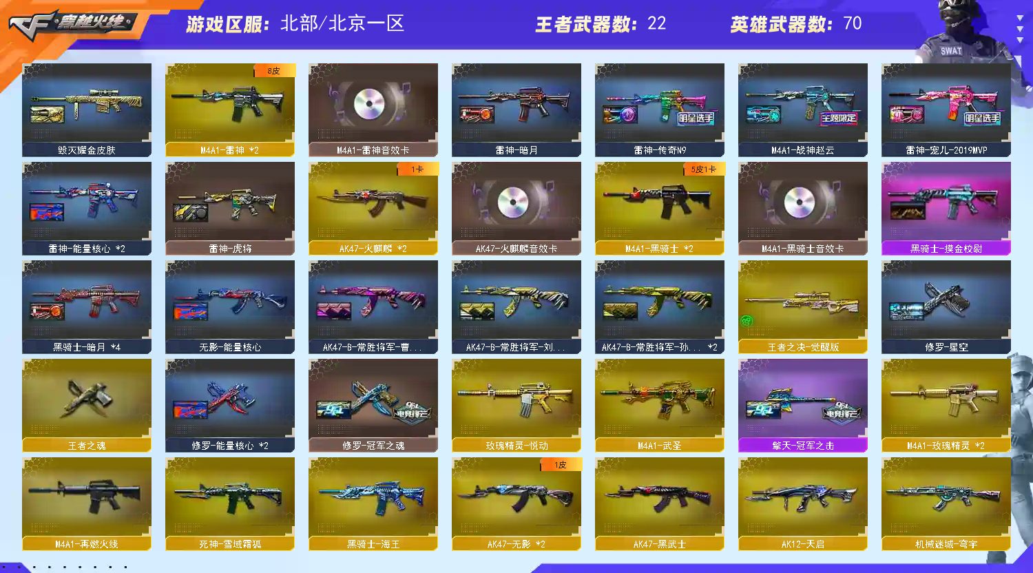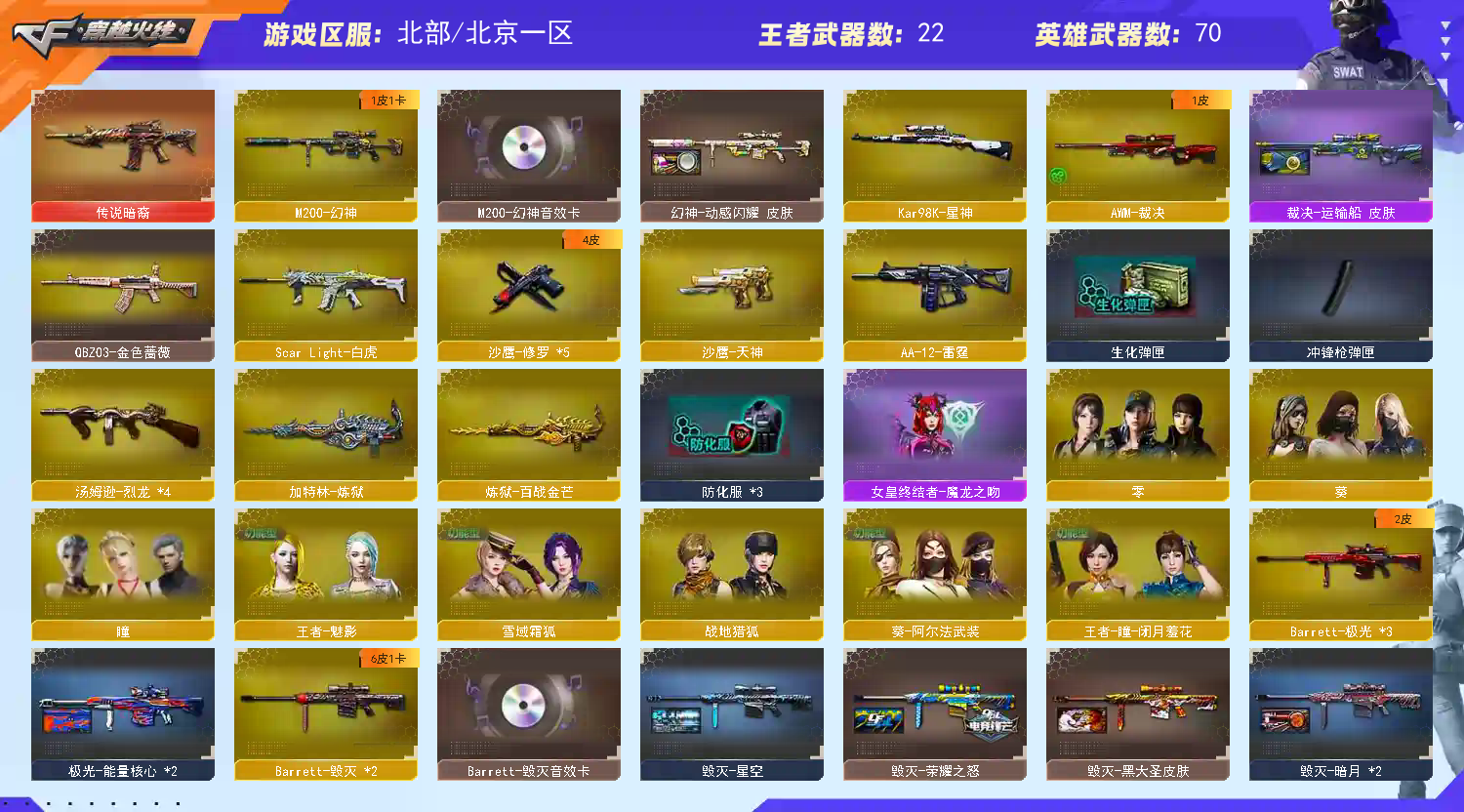 【m200幻神+音效卡+动感闪耀皮肤】【98k星神】【传说暗裔】【scar白虎】【qbz金色蔷薇】【朱雀】【火麒麟+卡】【雷神+卡+n9皮肤+宠儿】【黑骑士+卡】【毁灭+卡+cfs2018+荣耀之怒】【极光】【裁决+运输船】【武器:武圣 王者之心 王者之魄 王者之戮 王者冰魄 王者炎心 海王 炼狱*2 烈龙*4】【7手枪:修罗*5 天神 武圣 】【15刀具:屠龙*4 龙啸 擎天 麒麟刺*4 王者之啸*2】【小人枪:火麒麟灵狐 天龙曼陀罗】【音效卡:雷神音效卡 火麒麟音效卡 毁灭音效卡 黑骑士音效卡 幻神音效卡 】【四防角色:王者瞳闭月羞花 王者魅影 】
