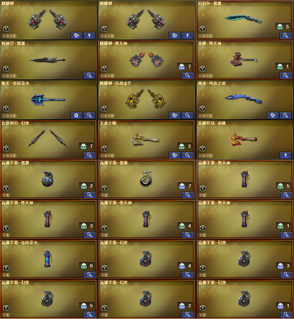 投掷套装:雷霆套、雷暴套、堕天神套X4、竞技荣光套、幻兽套X5、音乐手雷X3