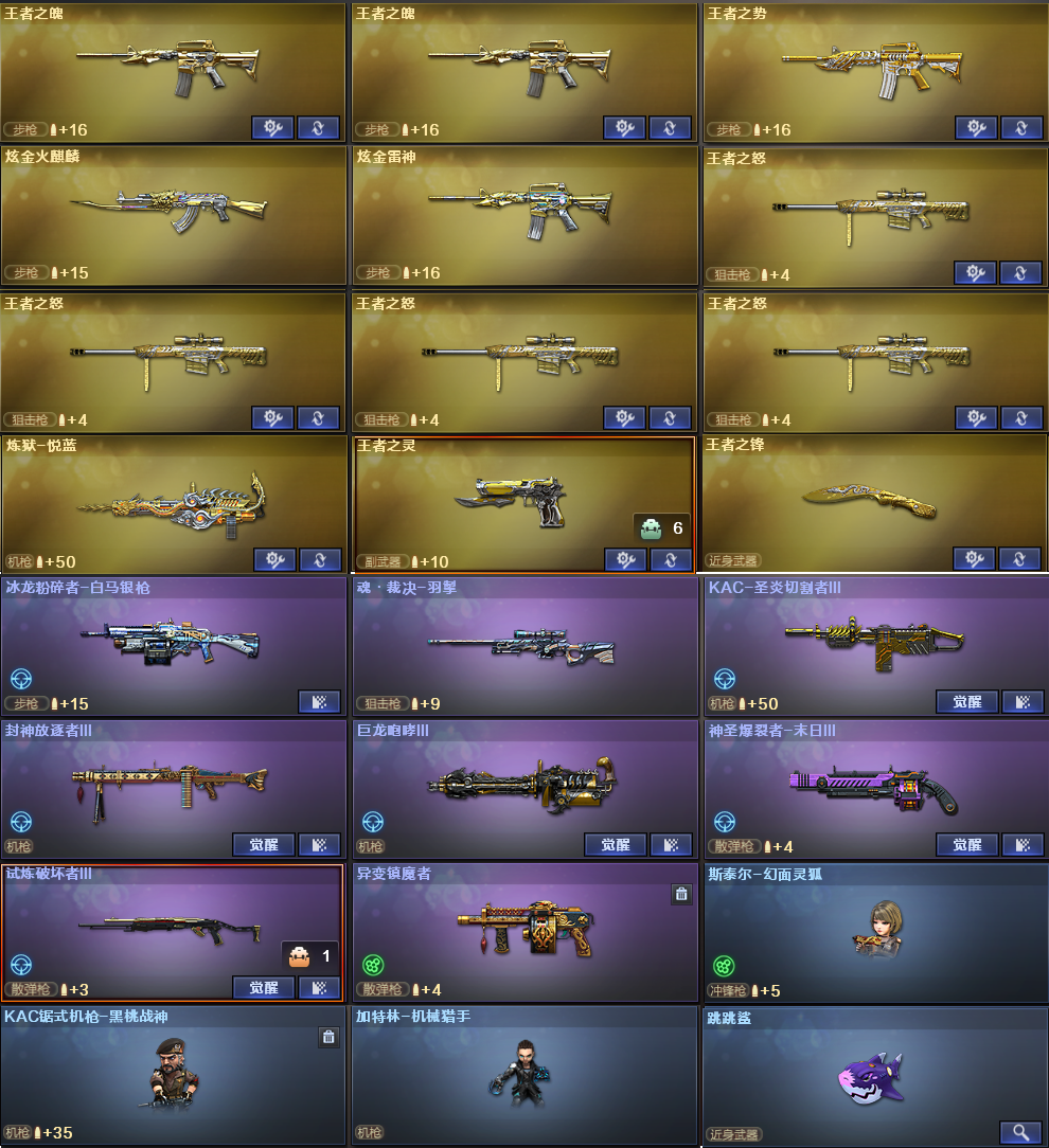 王者炫金武器:王者之魄觉醒、王者之势觉醒、王者之鲨、王者炎心、王者之啸、王者之幻、王者之魄X3、王者之势、王者之怒X4、王者之灵、王者之锋、炫金火麒麟、炫金雷神、炫金武士、炼狱悦蓝