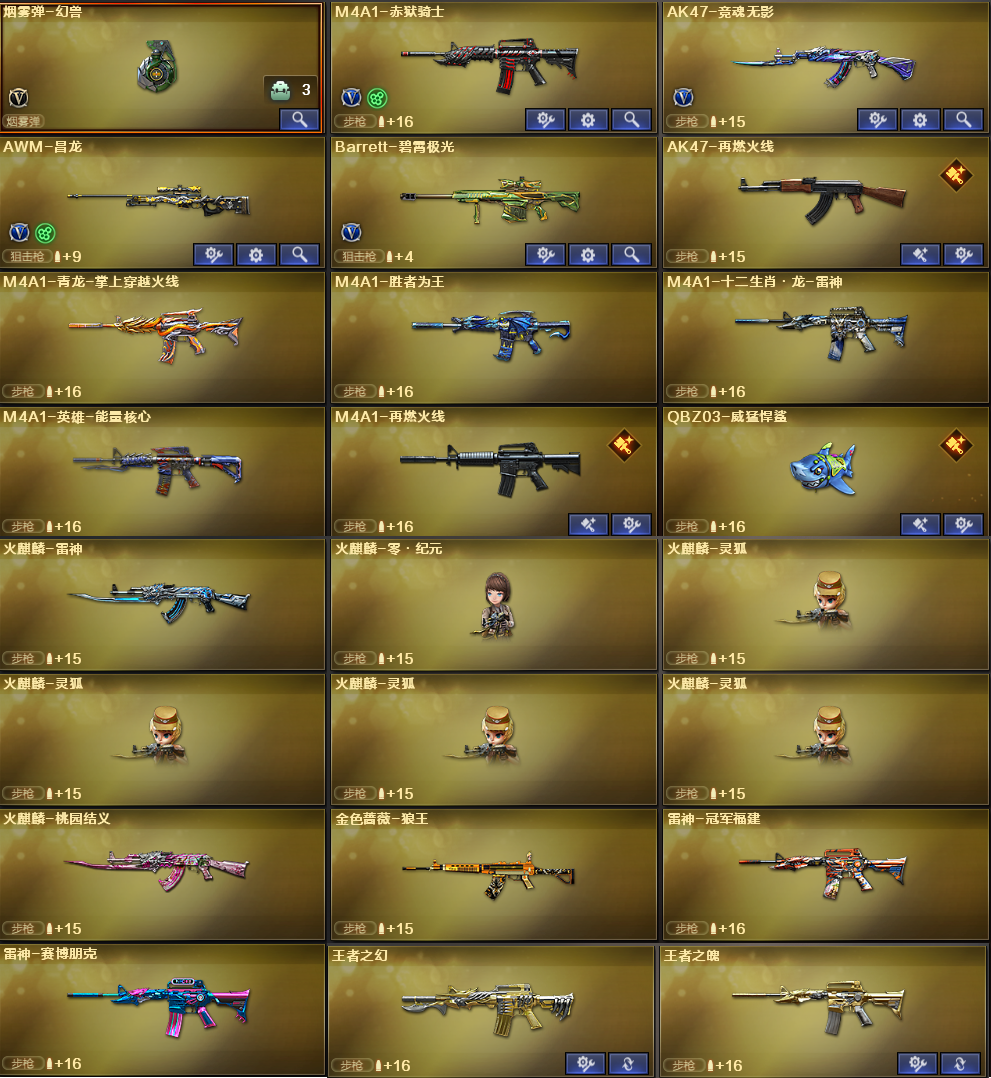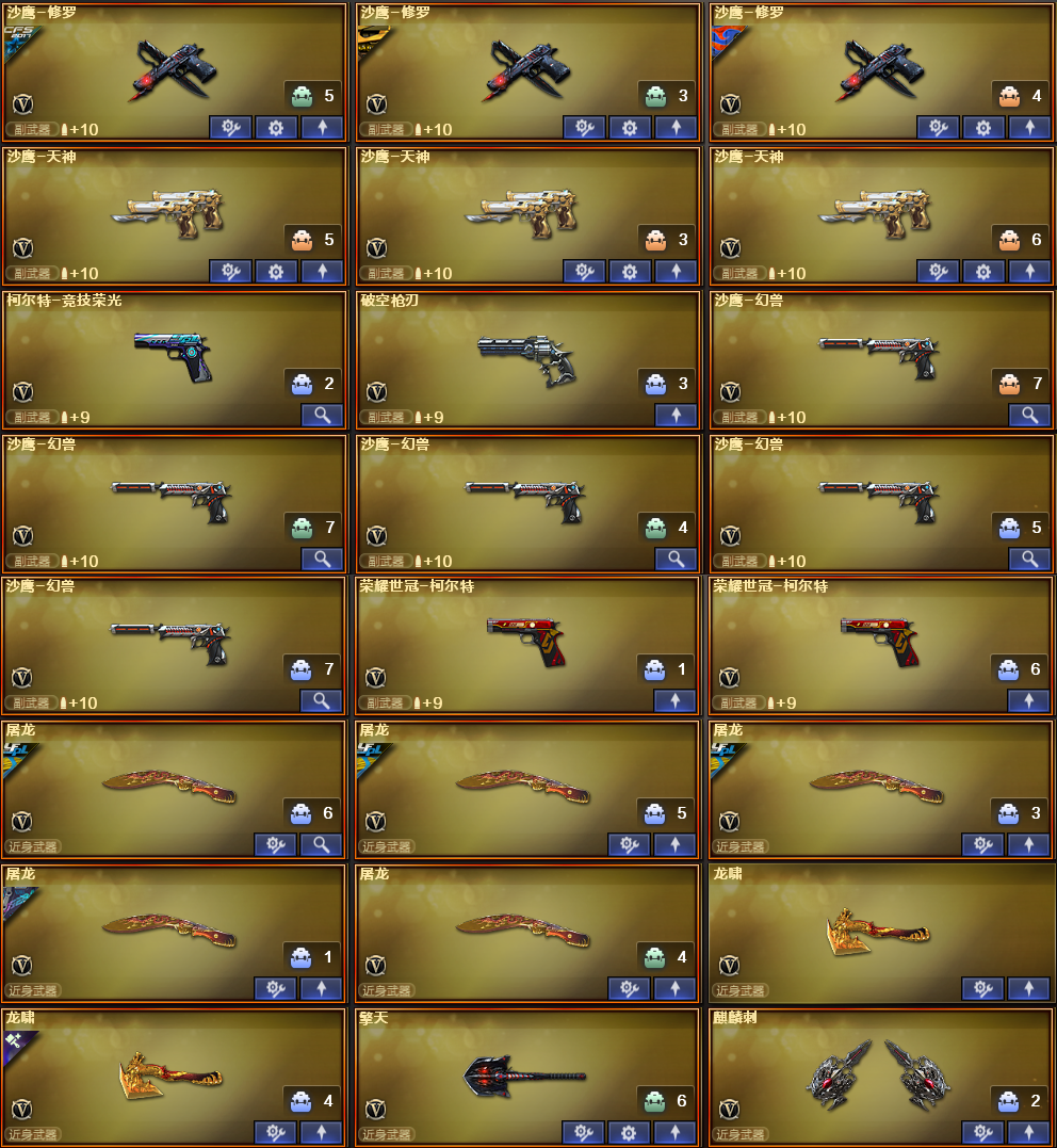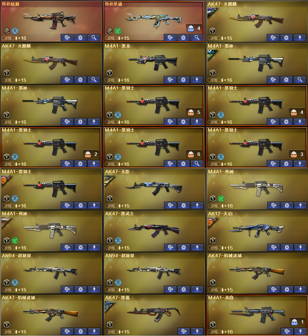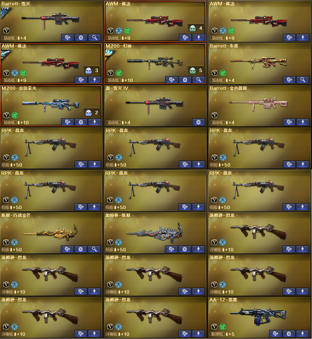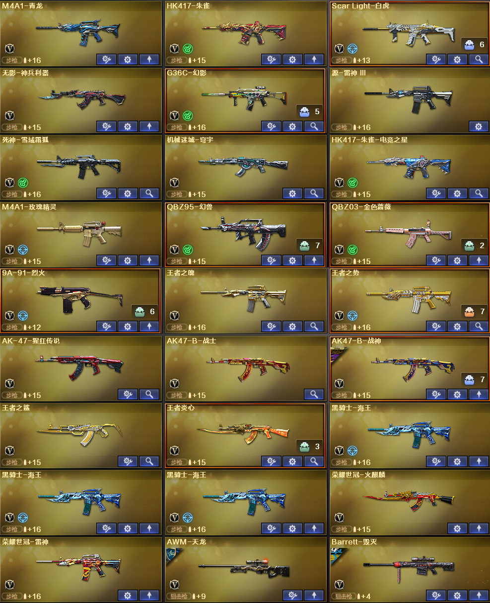 稀有武器:传说暗裔、传说圣谕、M200幻神、烈龙X6+斯泰尔-幻面灵狐、盘龙X6+炼狱+炼狱百战金芒、G36C幻影、荣耀世冠柯尔特X2、M200竞技荣光、柯尔特竞技荣光、擎天竞技荣光、破空枪刃、Scarlight白虎、QBZ金色蔷薇、QBZ幻兽X2、沙鹰幻兽、女皇利刃幻兽、青龙、HK朱雀、荣耀世冠火麒麟、荣耀世冠雷神、天龙、毁灭X2、裁决X3、火麒麟X2、黑龙、雷神X2、黑骑士X6、无影、死神X2、黑武士、天启、超新星X2、机械迷城X2、黑鲨、龙血、无影神兵利器、死神雪域霜狐、机械迷城穹宇、朱雀电竞之星、烈火、玫瑰精灵、黑骑士海王X3、BARRETT朱雀、源雷神、源毁灭、BARRETT金色蔷薇、A12雷霆、修罗X3、天神X3、屠龙X5、龙啸X2、擎天、麒麟刺X3、尼泊尔雷霆、斩神刀雷暴、麒麟刺堕天神、龙啸堕天神、麒麟刺百战金芒、屠龙电竞之星、荣耀世冠龙啸、碧霄极光、赤狱骑士、竞魂无影、冰龙粉碎者-白马银枪、圣炎切割者、封神放逐者、巨龙咆哮者、试炼破坏者、异变镇魔者